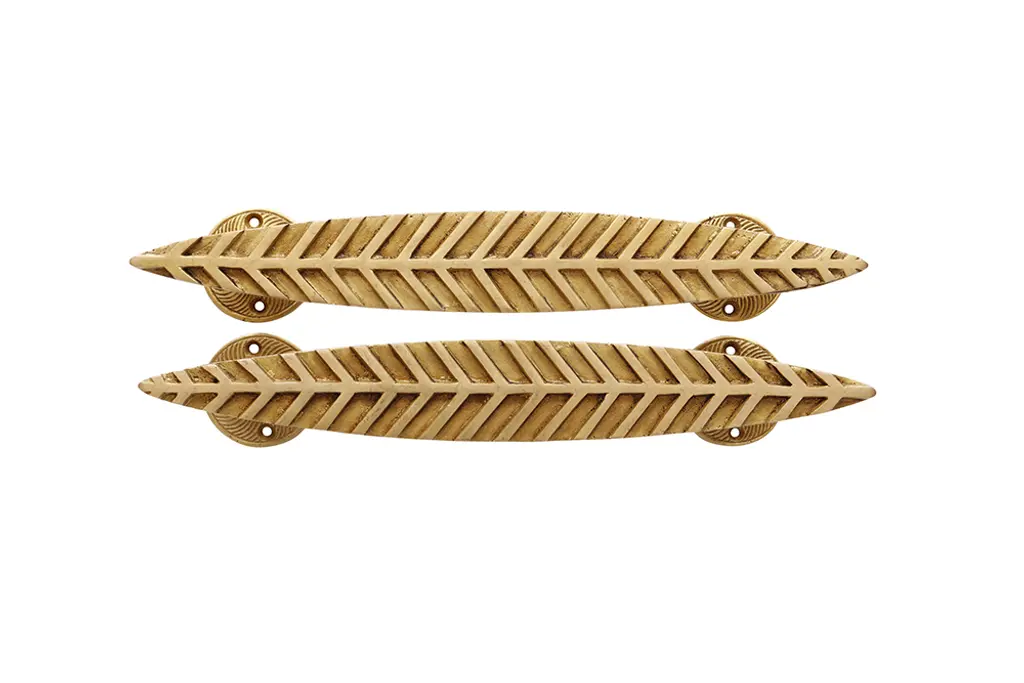 A pair of brass door handles or cabinet pulls. Lanceolate shaped with raised lines symbolizing a simple feather or leaf. Dimensions per handle.