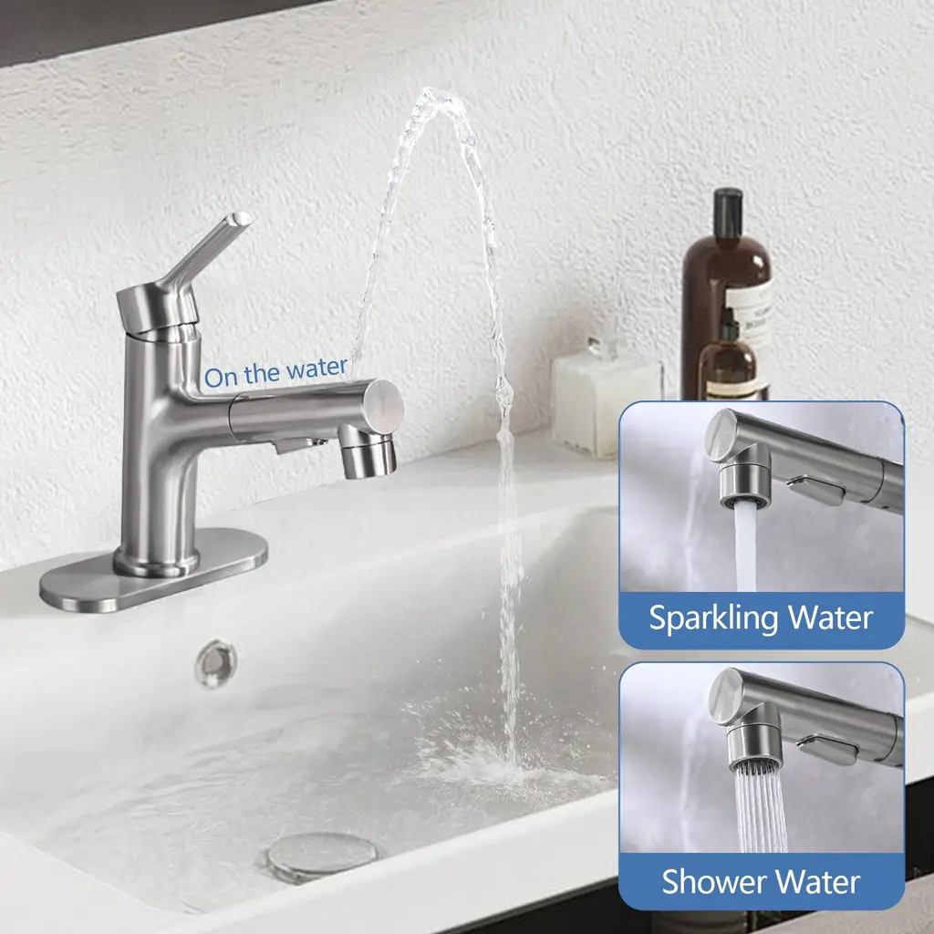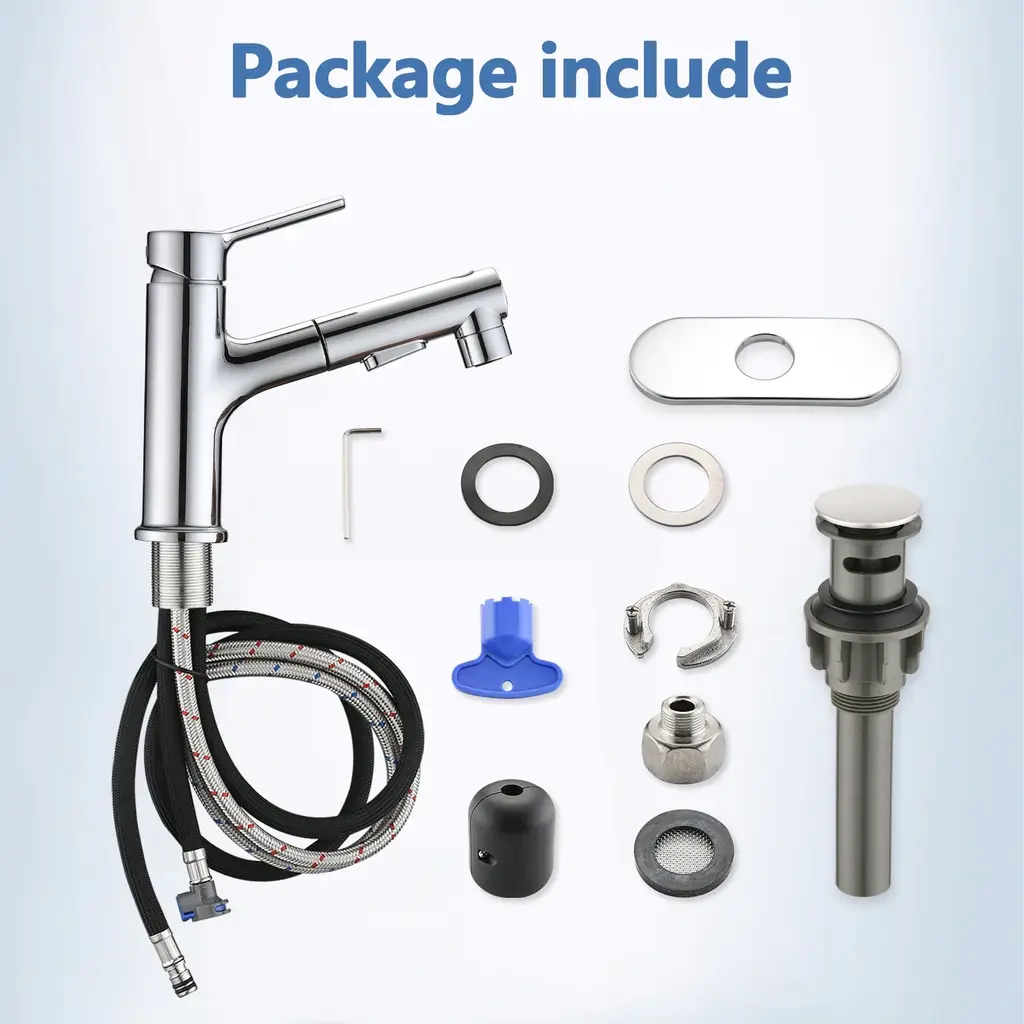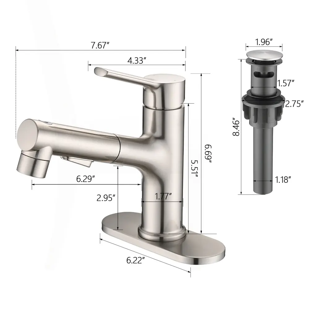 Product FeaturesFlexible Pull-out Sprayer: The Spout can be pulled out and the longer hose reaches beyond the sink adds great convenience of washing. You can use the spray head to wash hair without taking off clothes in bathroom. It also perfect for washing fruits, vegetables and other delicate foods or the filling of pots and pans in kitchen.Modern Square Design:Single handle design, flexible pull-out sprayer, easy to control of hot and cold water. This pull-down basin faucet adds a clean sleek look to your bathroom sink.Eye-catching Appearance:This faucet has a unique square look and ergonomic handle design. The body is very robust and remains shiny, insensitive to fingerprints and scratches.3 Function Spray Settings: (Bubbles/ Sprinkles/ Mouthwash). This bathroom sink tap perfectly combines an elegant Pull-out and 360° swivel design with exceptional ergonomics. The appearance is simple and generous, which will add elegance to your bathroom and kitchen.DetailsMaterial:Stainless SteelMounting / Installation Type:Single-HoleHandle(s) Included:YesDrain Assembly Included:YesDeck Plate Included:YesMaximum Flow Rate:1.2Aerator Included:YesSpout/Faucet Height - Top to Bottom:3Spout Reach - Front to Back:6.3Drain Type:Pop-Up;With OverflowValve Included:Yes