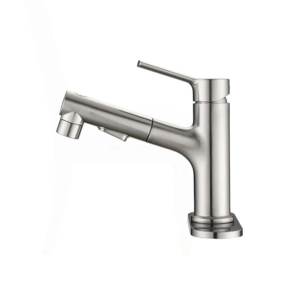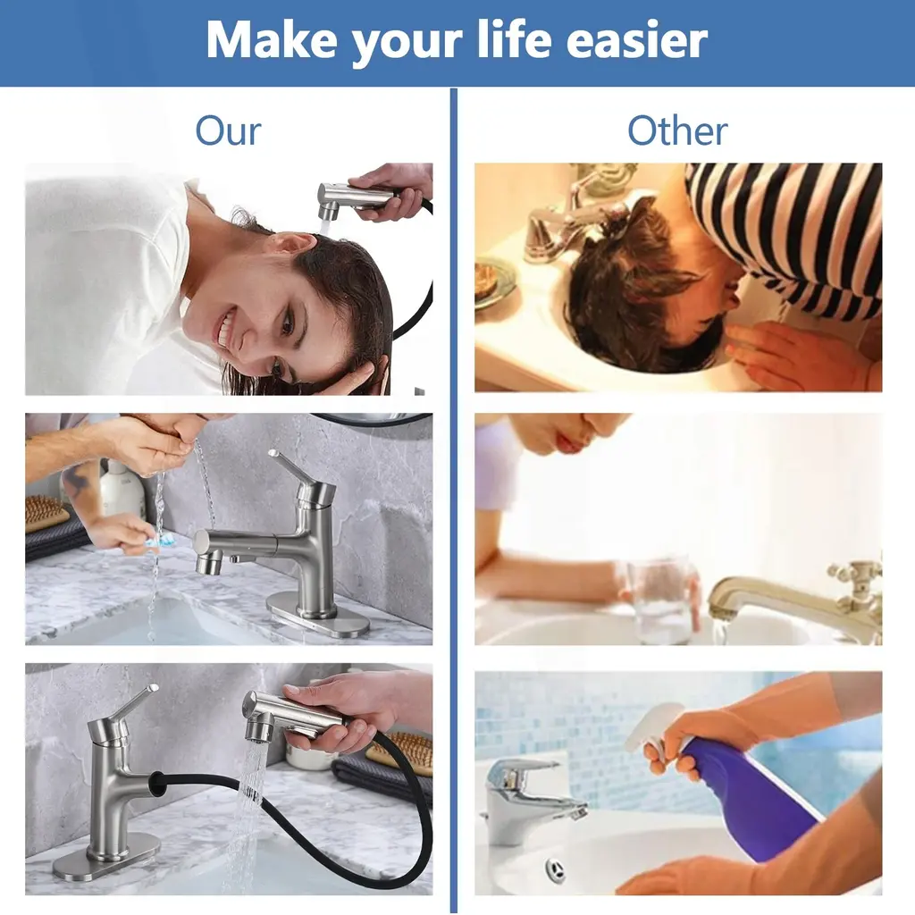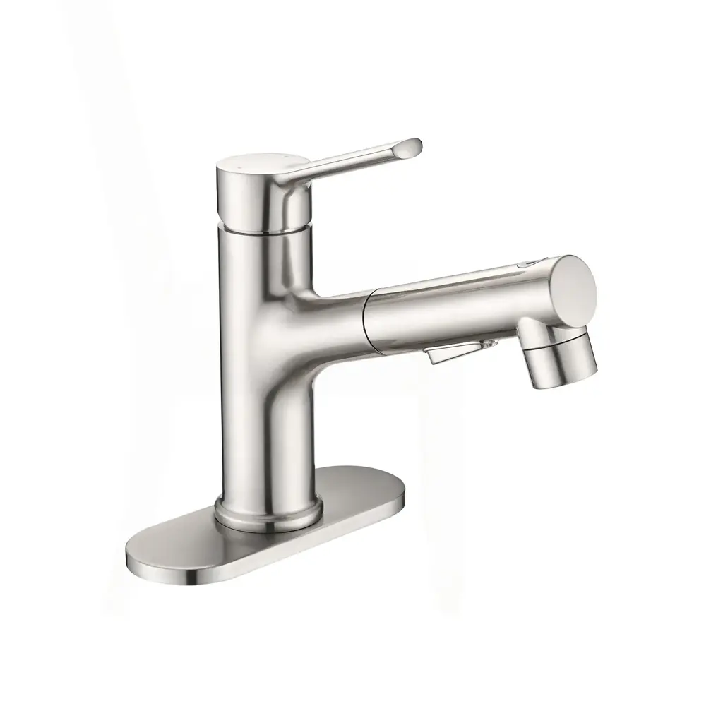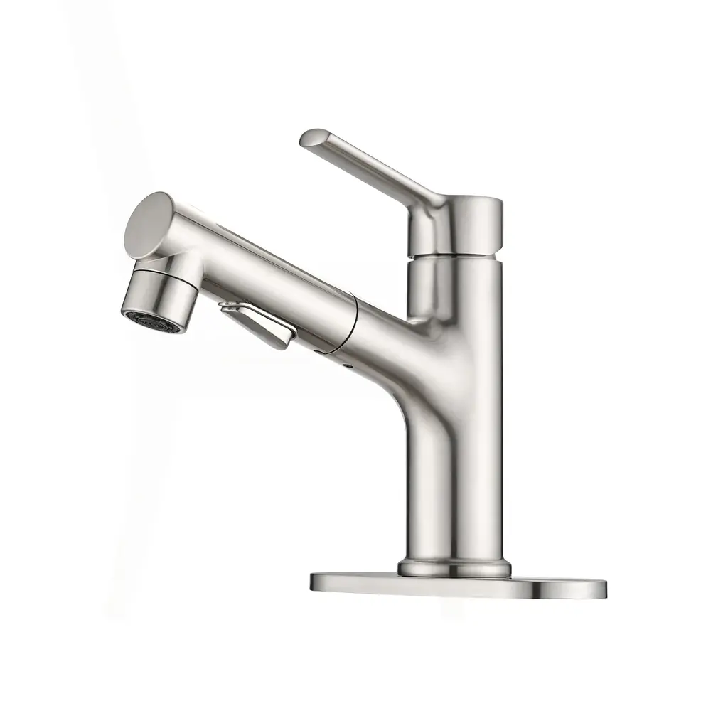 Product FeaturesFlexible Pull-out Sprayer: The Spout can be pulled out and the longer hose reaches beyond the sink adds great convenience of washing. You can use the spray head to wash hair without taking off clothes in bathroom. It also perfect for washing fruits, vegetables and other delicate foods or the filling of pots and pans in kitchen.Modern Square Design:Single handle design, flexible pull-out sprayer, easy to control of hot and cold water. This pull-down basin faucet adds a clean sleek look to your bathroom sink.Eye-catching Appearance:This faucet has a unique square look and ergonomic handle design. The body is very robust and remains shiny, insensitive to fingerprints and scratches.3 Function Spray Settings: (Bubbles/ Sprinkles/ Mouthwash). This bathroom sink tap perfectly combines an elegant Pull-out and 360° swivel design with exceptional ergonomics. The appearance is simple and generous, which will add elegance to your bathroom and kitchen.DetailsMaterial:Stainless SteelMounting / Installation Type:Single-HoleHandle(s) Included:YesDrain Assembly Included:YesDeck Plate Included:YesMaximum Flow Rate:1.2Aerator Included:YesSpout/Faucet Height - Top to Bottom:3Spout Reach - Front to Back:6.3Drain Type:Pop-Up;With OverflowValve Included:Yes