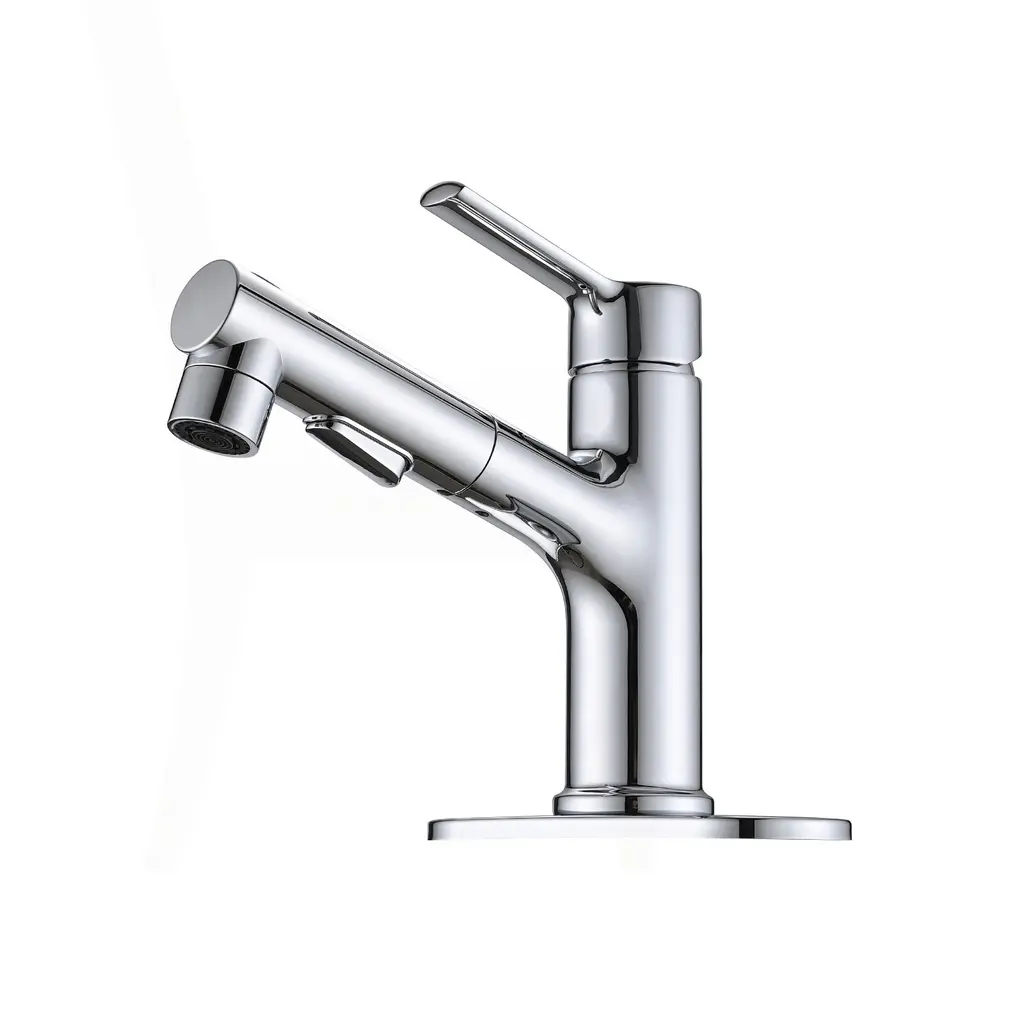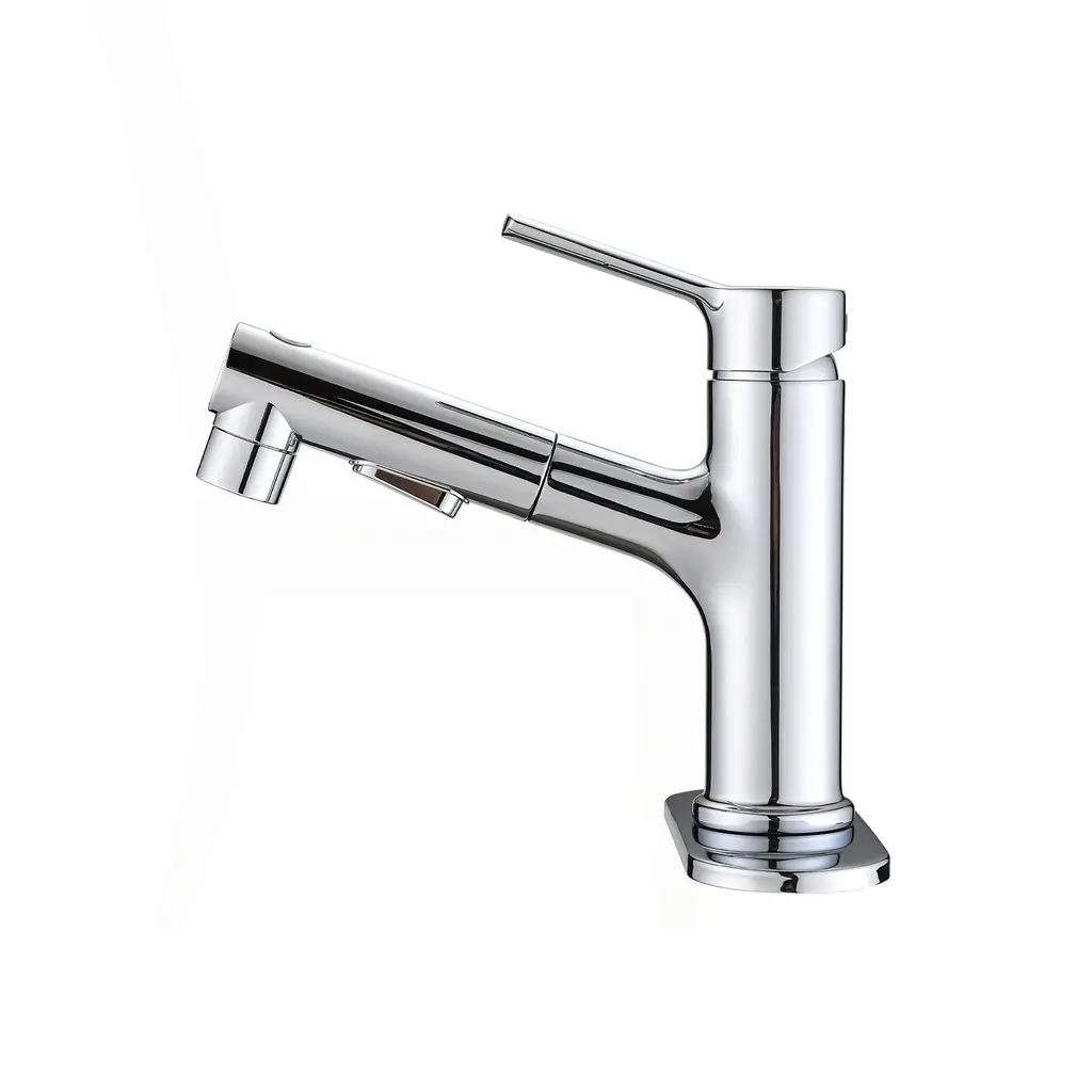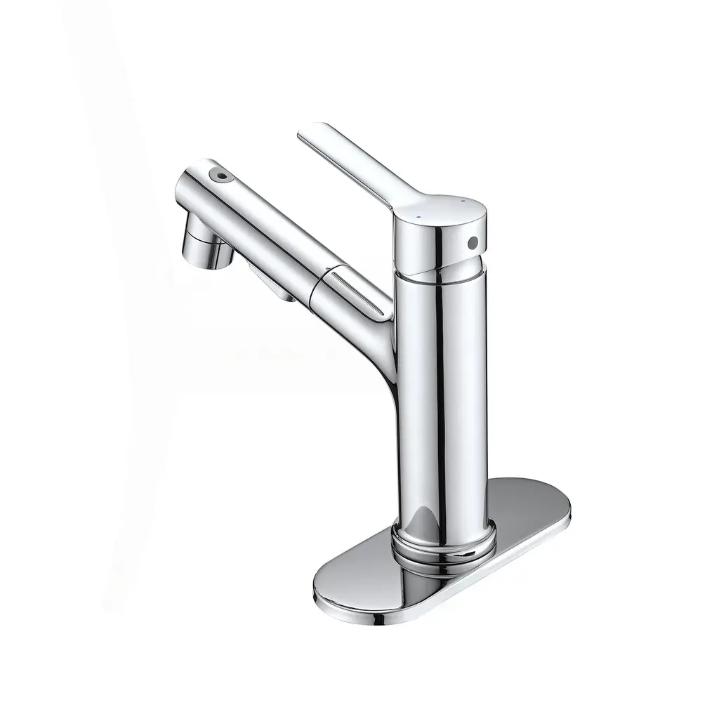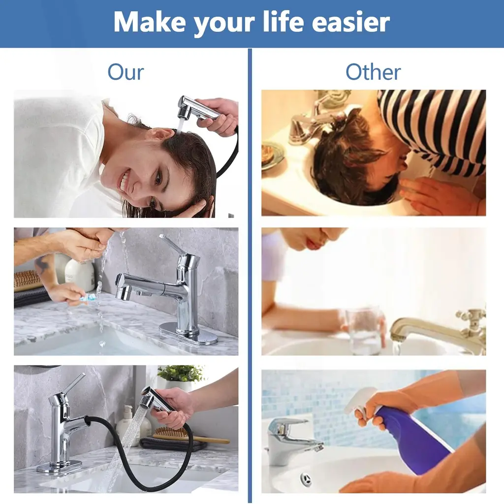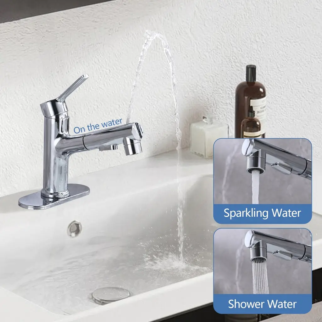 Product FeaturesFlexible Pull-out Sprayer: The Spout can be pulled out and the longer hose reaches beyond the sink adds great convenience of washing. You can use the spray head to wash hair without taking off clothes in bathroom. It also perfect for washing fruits, vegetables and other delicate foods or the filling of pots and pans in kitchen.Modern Square Design:Single handle design, flexible pull-out sprayer, easy to control of hot and cold water. This pull-down basin faucet adds a clean sleek look to your bathroom sink.Eye-catching Appearance:This faucet has a unique square look and ergonomic handle design. The body is very robust and remains shiny, insensitive to fingerprints and scratches.3 Function Spray Settings: (Bubbles/ Sprinkles/ Mouthwash). This bathroom sink tap perfectly combines an elegant Pull-out and 360° swivel design with exceptional ergonomics. The appearance is simple and generous, which will add elegance to your bathroom and kitchen.DetailsMaterial:Stainless SteelMounting / Installation Type:Single-HoleHandle(s) Included:YesDrain Assembly Included:YesDeck Plate Included:YesMaximum Flow Rate:1.2Aerator Included:YesSpout/Faucet Height - Top to Bottom:3Spout Reach - Front to Back:6.3Drain Type:Pop-Up;With OverflowValve Included:Yes