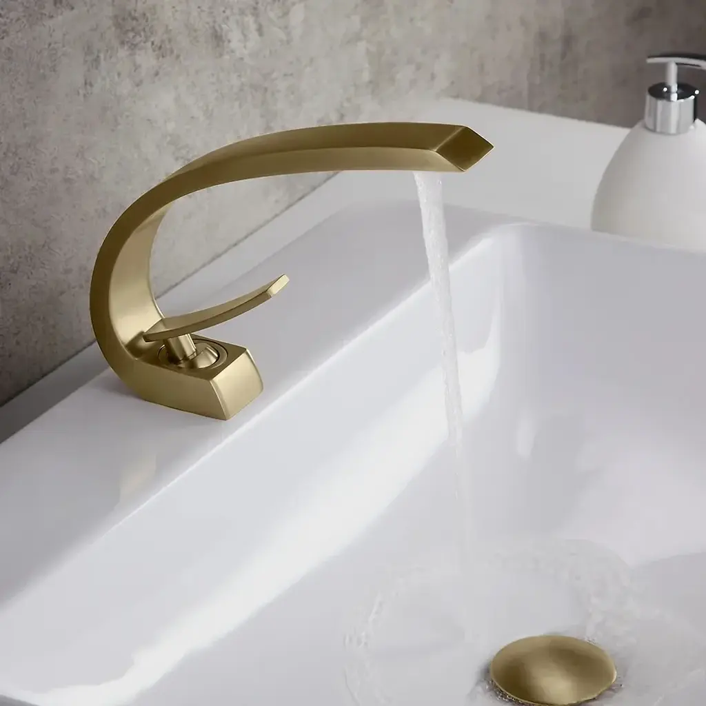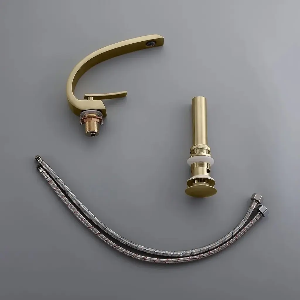 Single Hole 1-Handle Bathroom Sink Faucet Curved Spout With Pop Up Drain In Brushed Gold