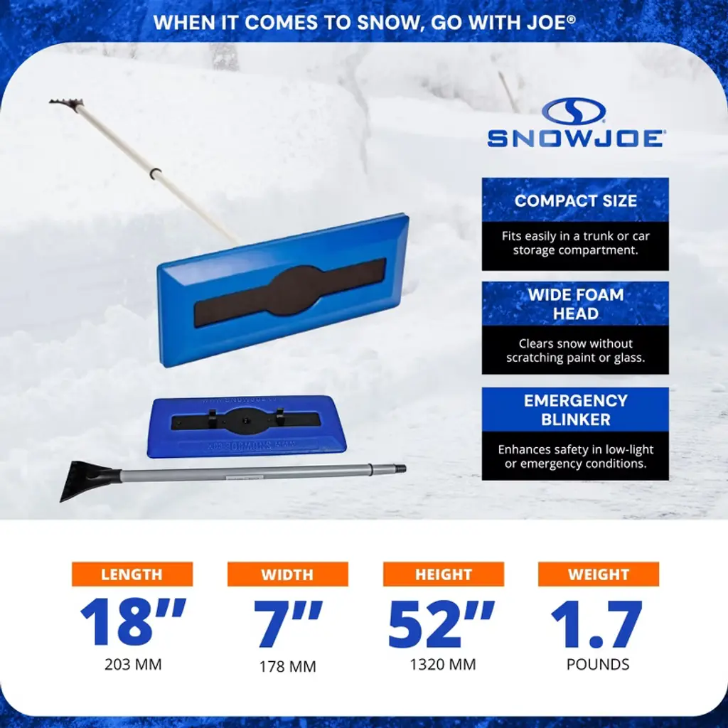 SNOW PROBLEM! The Snow Joe® Snow Broom model SJBLZD makes quick work out of the snow piled on the roof, hood, trunk or windshield of your car. Its patented dual-purpose design features a broom head on one end and a built-in ice scraper on the other, so you can quickly push heavy, wet snow off your car, then clear away the ice build-up on your windshield with just one tool. Made with a durable, reinforced, non-abrasive foam head, the Snow Broom safely and effectively sweeps snow off your car without scratching the glass surfaces. Plus, its telescoping pole extends from 33 to 52 inches to provide maximum reach with minimal strain. The Snow Broom is super easy to handle and stores neatly inside the trunk of your car with its built-in bracket holder. GET EQUIPPED® this winter with the Snow Joe® Snow Broom and clear out fast from tough winter messes......