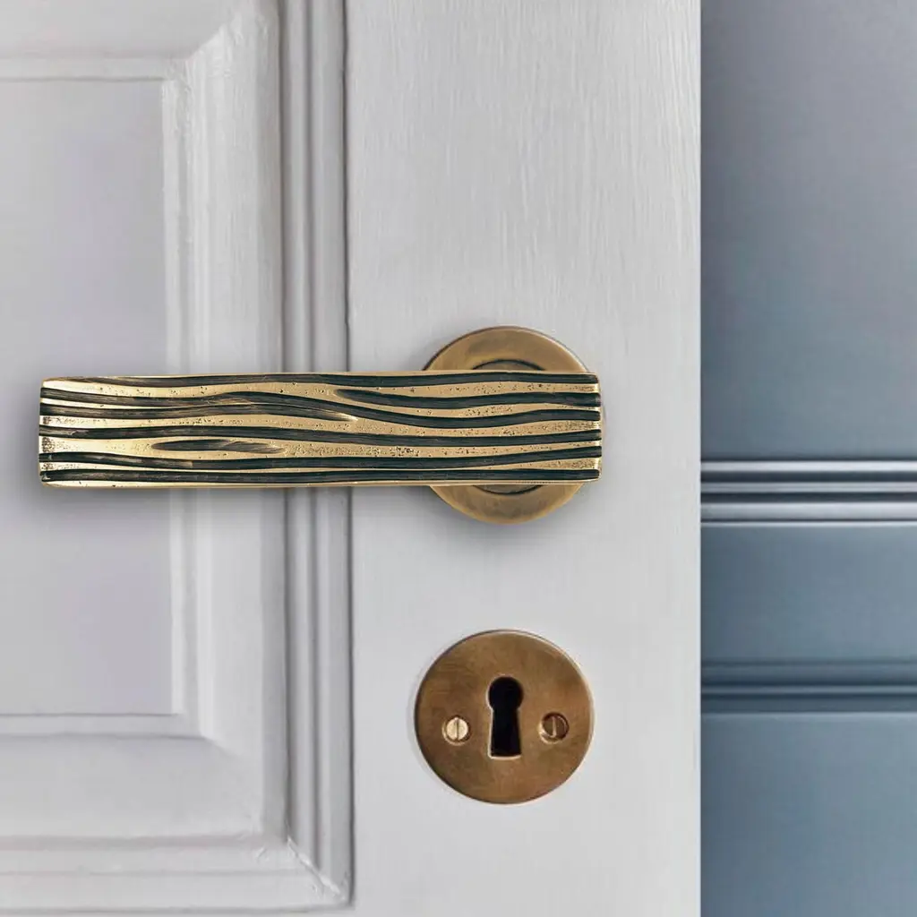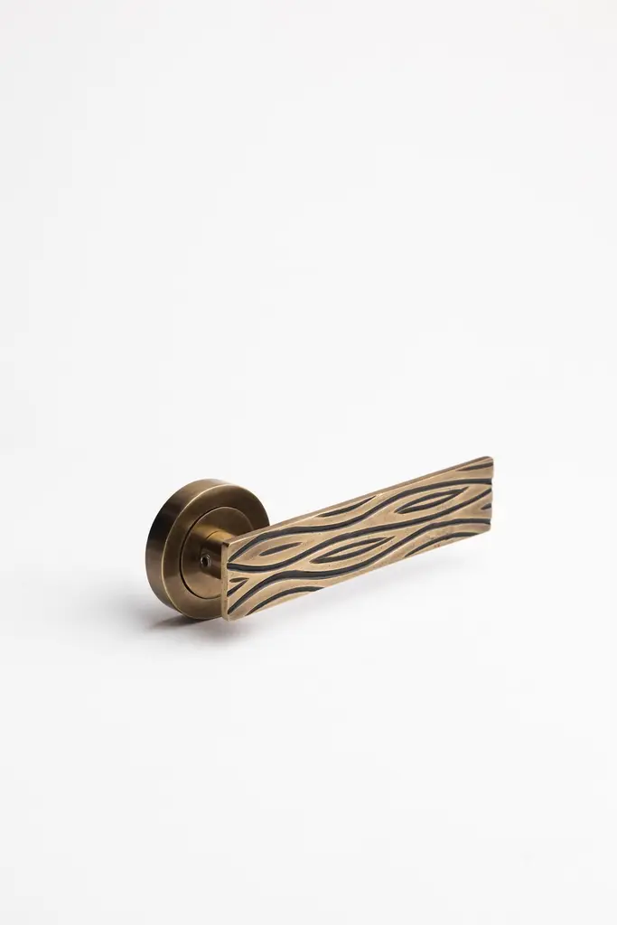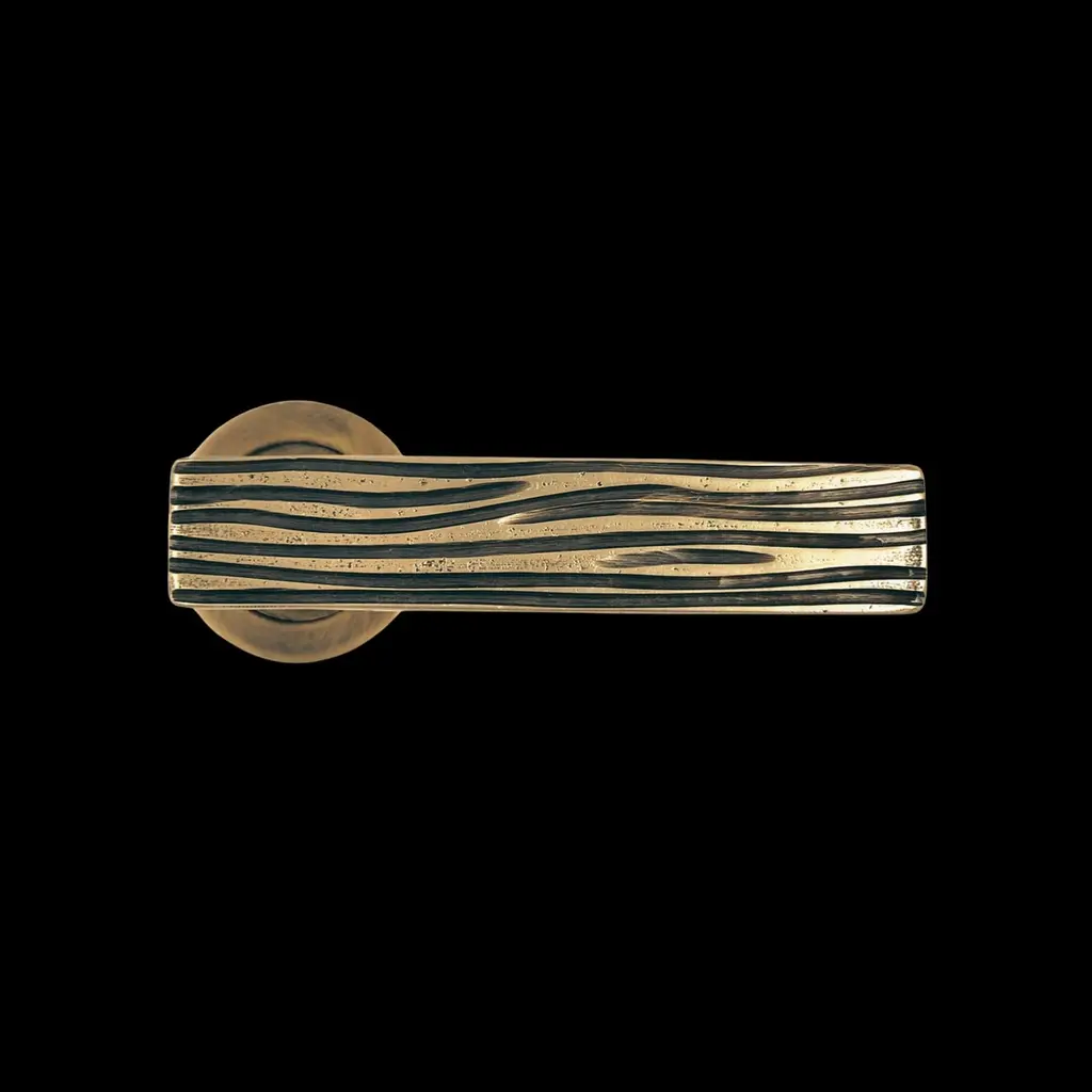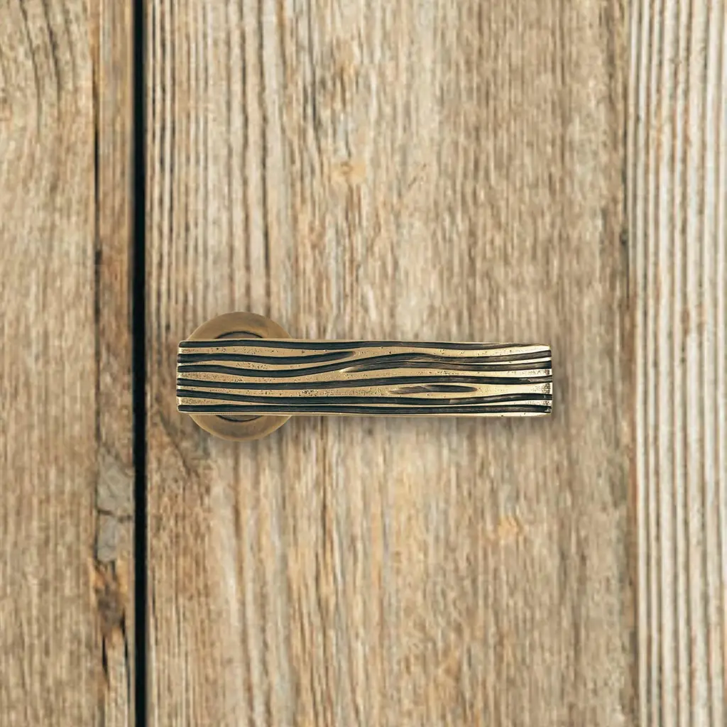 Use: Indoor or protected outdoorThis solid brass lever handle embodies the perfect balance between modern design and traditional craftsmanship. Part of the Earth Prints collection, it stands out with its asymmetrical lengthwise engravings, subtly enhanced by a gunmetal finish. Each piece is handcrafted with meticulous attention to detail, ensuring impeccable quality.Made from solid brass, this handle combines durability and strength. Measuring 14.5 cm in length and 3 cm in width, it offers a comfortable grip, perfectly suited for everyday use. The old gold finish adds a touch of timeless elegance, making each piece a unique decorative element.Easy to install, this handle is suitable for both interior doors and protected exterior doors. Whether enhancing a historic home or enriching a contemporary build, it seamlessly complements any style of decor.Each handle from the Earth Prints collection reflects exceptional artisanal expertise and a dedication to noble materials. With its refined aesthetics and optimal functionality, it transforms doors into distinctive and elegant design features.note: Differences from the sample/photo provided should not be considered manufacturing defects, but rather a characteristic of the manual process, which may result in variations in color and uniformity.When placed outdoors, finishes may undergo color changes, which should not be considered a defect. Brass is a living material that gradually develops a patina over the years.