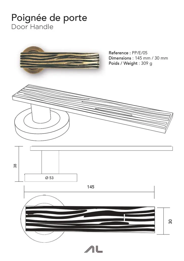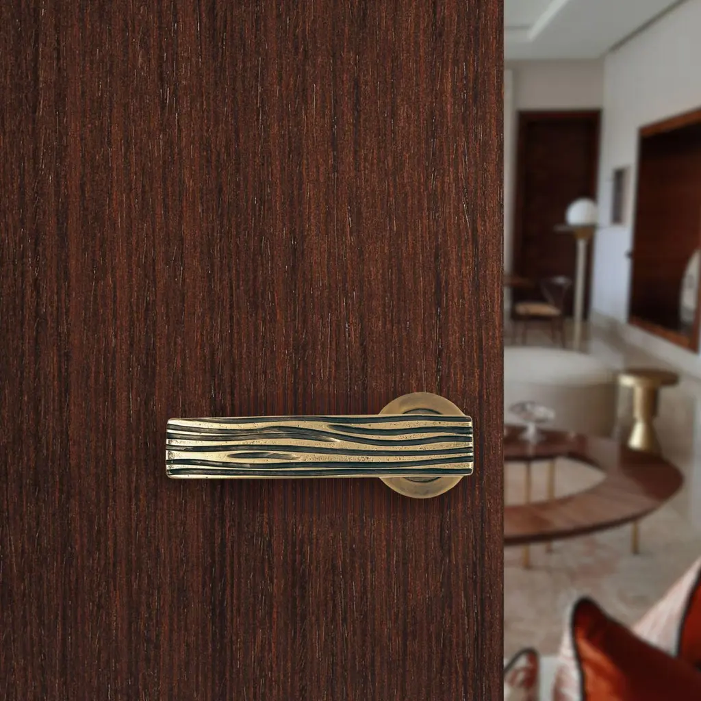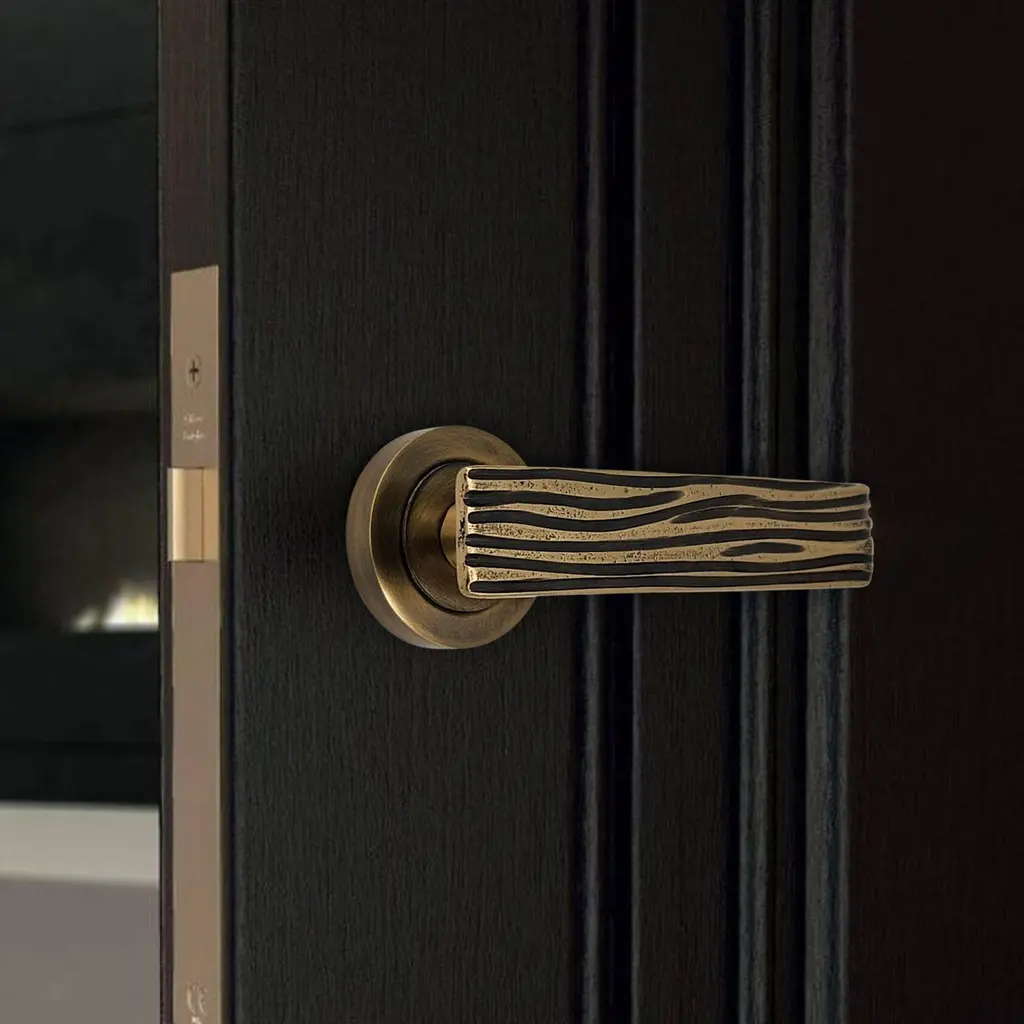 Use: Indoor or protected outdoorThis solid brass lever handle embodies the perfect balance between modern design and traditional craftsmanship. Part of the Earth Prints collection, it stands out with its asymmetrical lengthwise engravings, subtly enhanced by a gunmetal finish. Each piece is handcrafted with meticulous attention to detail, ensuring impeccable quality.Made from solid brass, this handle combines durability and strength. Measuring 14.5 cm in length and 3 cm in width, it offers a comfortable grip, perfectly suited for everyday use. The old gold finish adds a touch of timeless elegance, making each piece a unique decorative element.Easy to install, this handle is suitable for both interior doors and protected exterior doors. Whether enhancing a historic home or enriching a contemporary build, it seamlessly complements any style of decor.Each handle from the Earth Prints collection reflects exceptional artisanal expertise and a dedication to noble materials. With its refined aesthetics and optimal functionality, it transforms doors into distinctive and elegant design features.note: Differences from the sample/photo provided should not be considered manufacturing defects, but rather a characteristic of the manual process, which may result in variations in color and uniformity.When placed outdoors, finishes may undergo color changes, which should not be considered a defect. Brass is a living material that gradually develops a patina over the years.