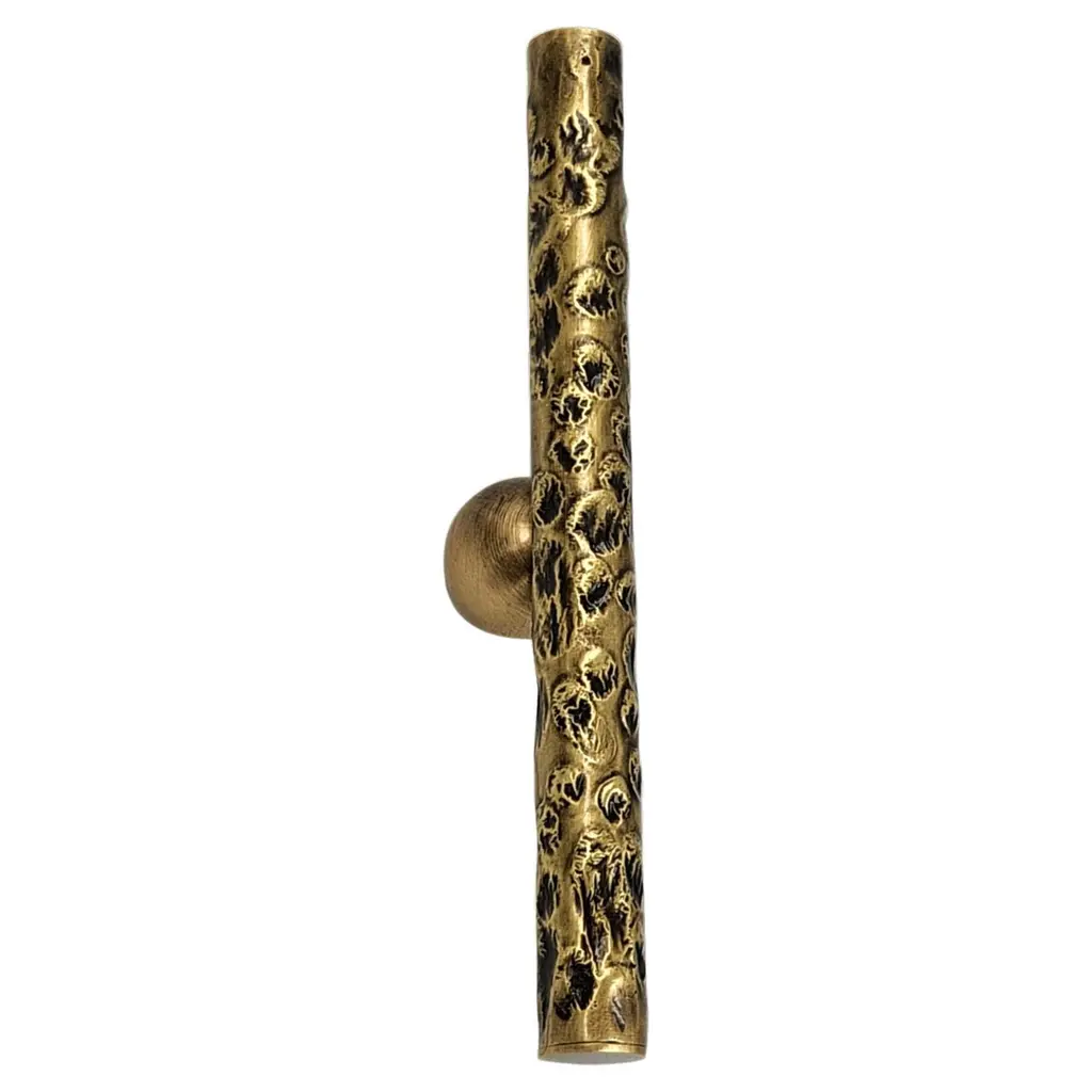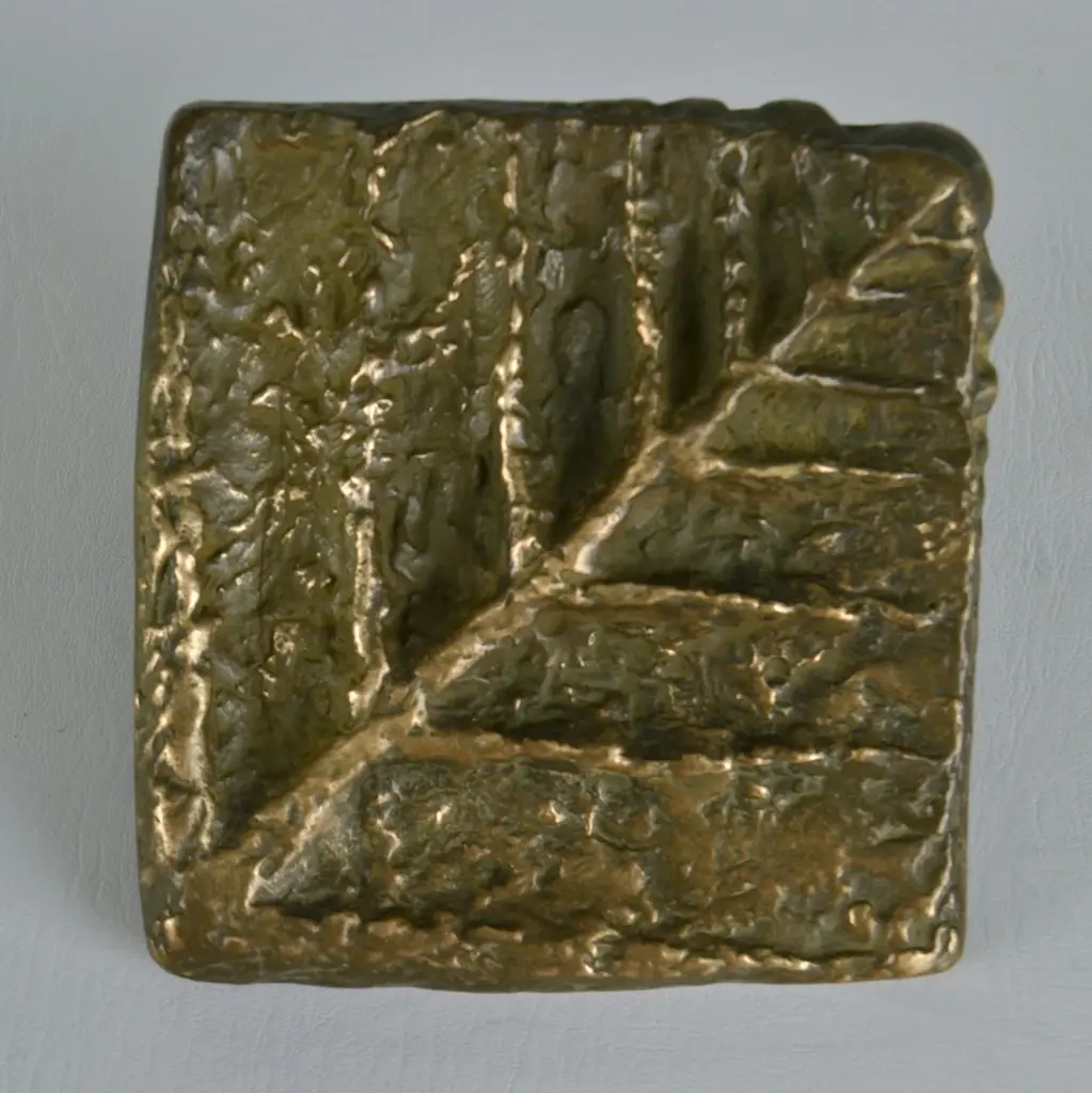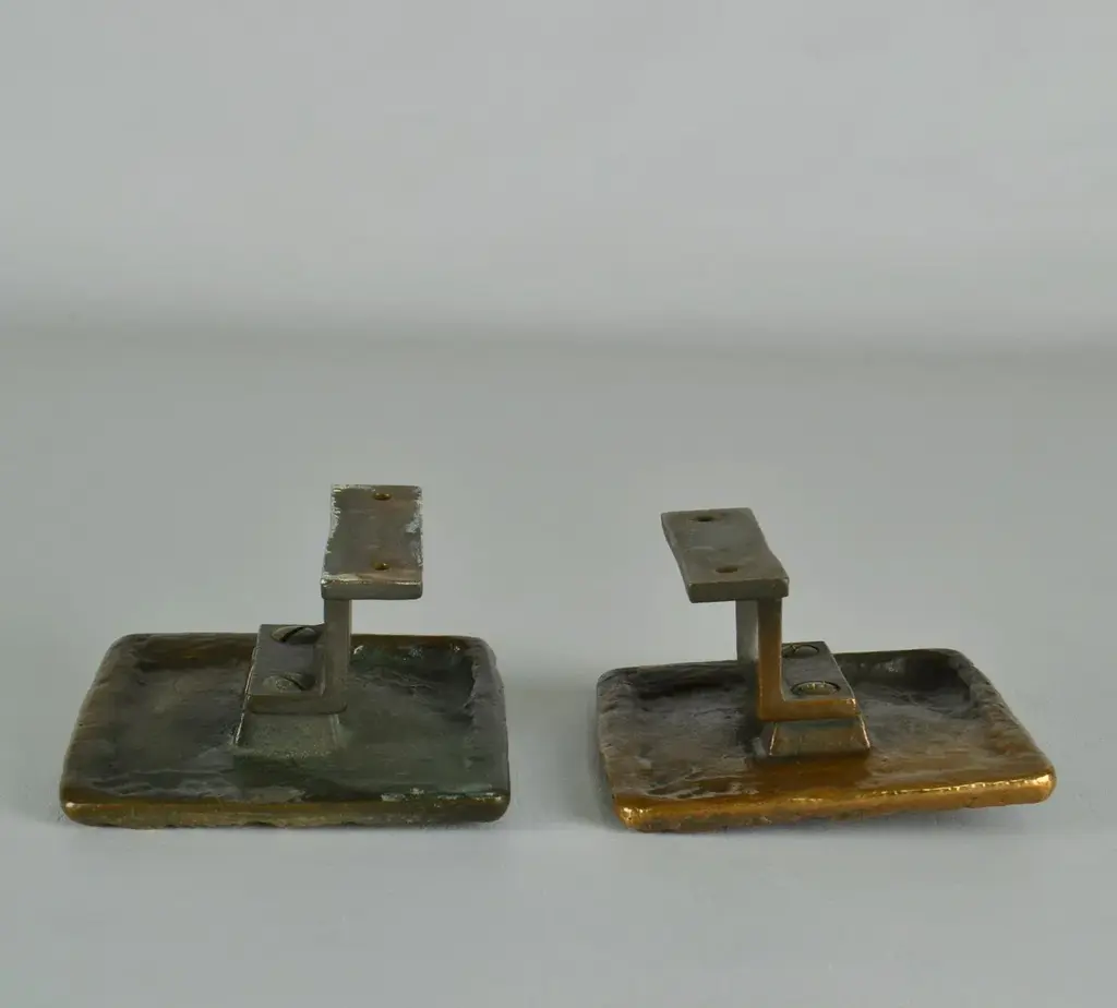 Set of two square Brutalist bronze door handles with forest vegetation textures European 1970's. Their relief with original dark patina will give real personality to a house. These identical handles can be applied inside or outside on a pair of double doors next to each other or on a single door on opposite sides. They can also make cupboard doors and kitchen units look out of this world. The handle brackets are attached to the main plate by two fixings, they can be positioned in two ways, inwards outwards. The handles are fitted to the door with two long standard bolts (not supplied) suiting the thickness of the doors. Wear consistent with age and use. Distance between the 6 mm holes is 7 cm.