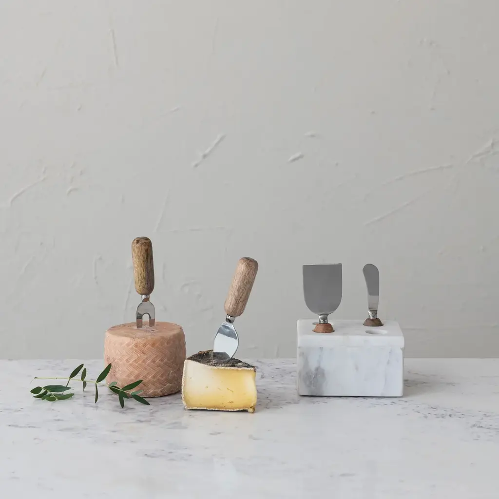 Stainless Steel Cheese Servers W/ Mango Wood Handles & Marble Stand
