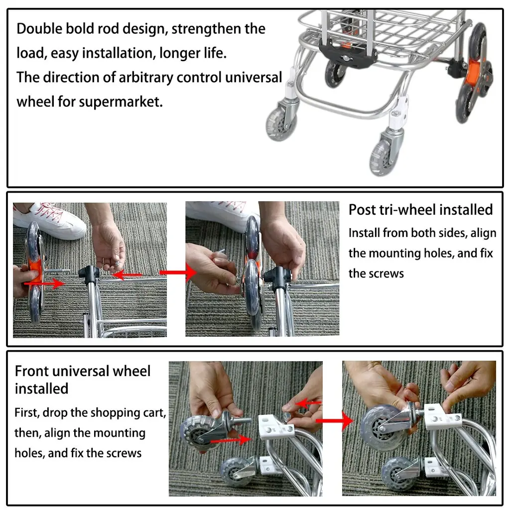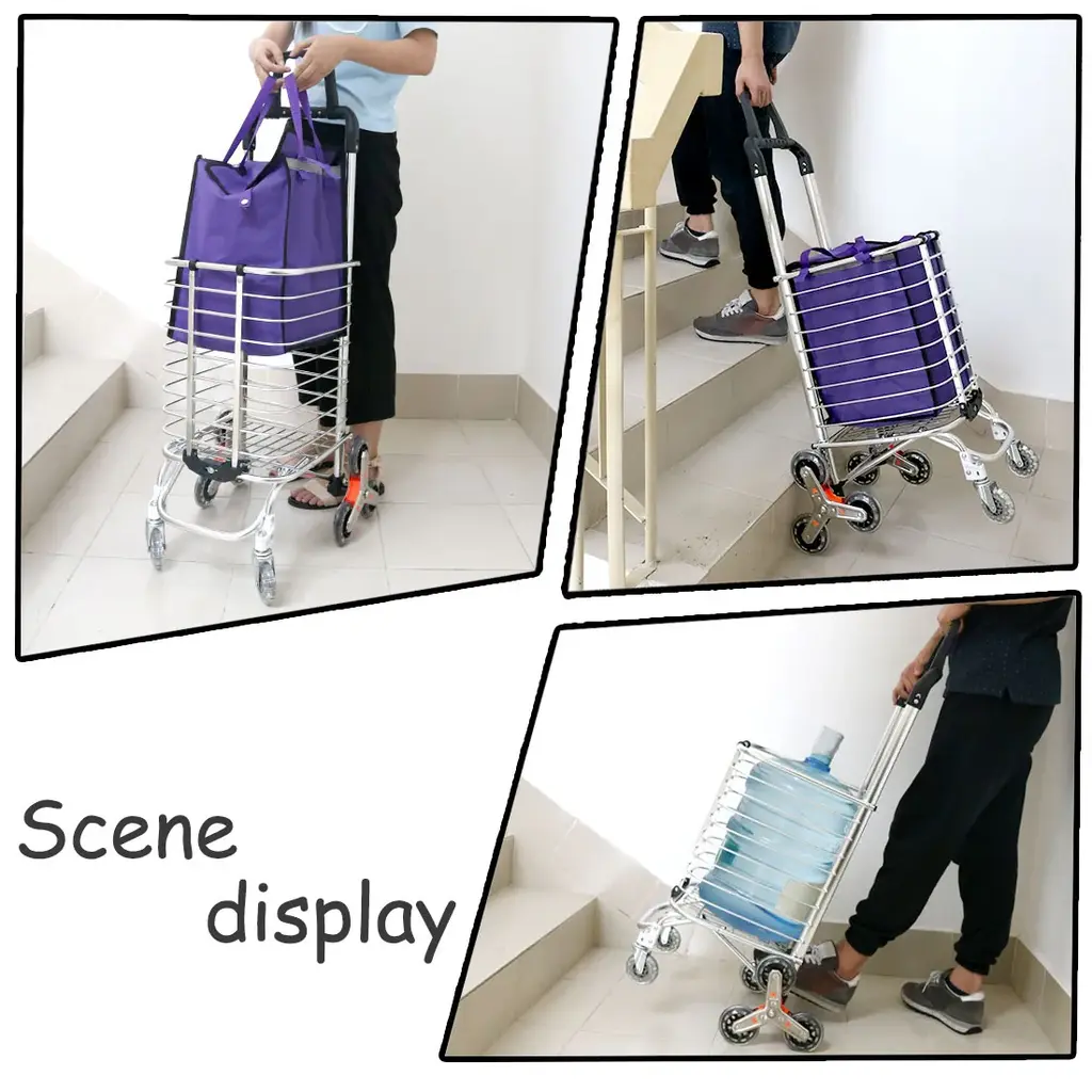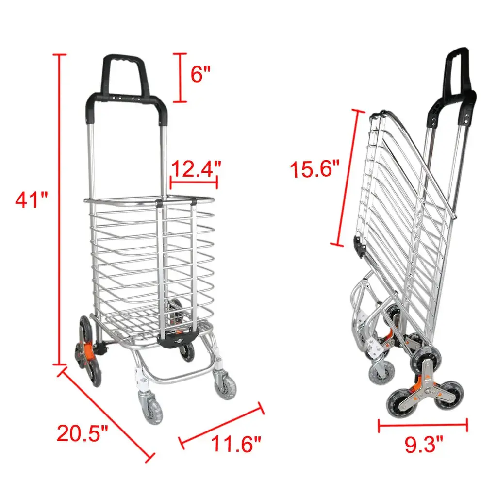 EASY STAIR CLIMBING DESIGN: Three wheel designed specifically for stair climbing ability. Cart glides up and down steps easily. Wheels are good on terrains such as grass, stairs, cobblestones, concrete, and gravel. The front wheel is a universal wheel, 360 degrees easy to rotate.COLLAPSIBLE FRAME UTILITY SHOPPING CART: The frame of the shopping cart can be collapsed as a dolly to transport large and heavy items easily. The base of the utility cart also folds allowing the cart to take up less space while being stored.MULTIPLE USES FOLDING SHOPPING CART: This utility car can be used for an endless variety of situations such as shopping at farmers markets, markets, groceries, camping, sport events and malls. This trolley can also be used for transporting laundry to and from the laundromat and running errands around town. It includes one bungee cord for large, heavy loads. and can take 110lbs of weight when pulling goods.UNIQUE DESIGN COLLAPSIBLE SHOOPING CART: Double handle has a comfort grip to help you upstairs easily and no bending when you climb the stairs. The shopping cart with 35L large capacity can be installed water, vegetables, edible oil and so on. Thick aluminum alloy bracket and double shaft makes shopping cart have good-looking and strengthen the load. The wheels fixed with a thread are firmly not falling.TIPS: If you have problems installing, please contact our customer service, we will provide you with installation instructions and video guidance.Package includes: 2 rear wheels+2 front wheels+1 bag+1 cart+1 kit+1 binding rope+2 hooks.Features: Three wheel designed specifically for stair climbing ability. Cart glides up and down steps with ease. Wheels are good on terrains such as mud, grass, stairs, cobblestones, concrete, and gravel. The front wheel is a universal wheel, 360° easy to rotate. Collapsible Frame:The frame of this cart collapses so that you can use it as a dolly to transport larger and heavier items with ease. The base of the cart also folds allowing the cart to take up less space while being stored. Multiple uses:This cart can be used for an endless variety of situations such as shopping markets, markets, groceries, and malls. And also be used for transporting laundry to and from the laundromat and running errands around town. It includes one bungee cord for large, heavy loads. Unique design:Double handle, when you climb the stairs when not bending, to help you effort, easy upstairs. 35L large capacity for installing water, vegetables, edible oil and so on, Thick aluminum alloy bracket and double shaft, so that shopping cart not only good-looking and strengthen the load; The wheels are fixed with a thread and are firmly not falling. Dimension:The entire cart measures: 15.2 x 20.5 x 40.9 inches(L*W*H)The bag: 10.6 x 10.6 x 15.7 inches(L*W*H)The cart can take 110lbs of weight when pulling goods. Package includes: 2 rear wheels+2 front wheels+1 bag+1 cart+1 kit+1 binding rope+2 hooks. TIPS: If you have problems installing, please contact our customer service, we will provide you with installation instructions and video guidance.