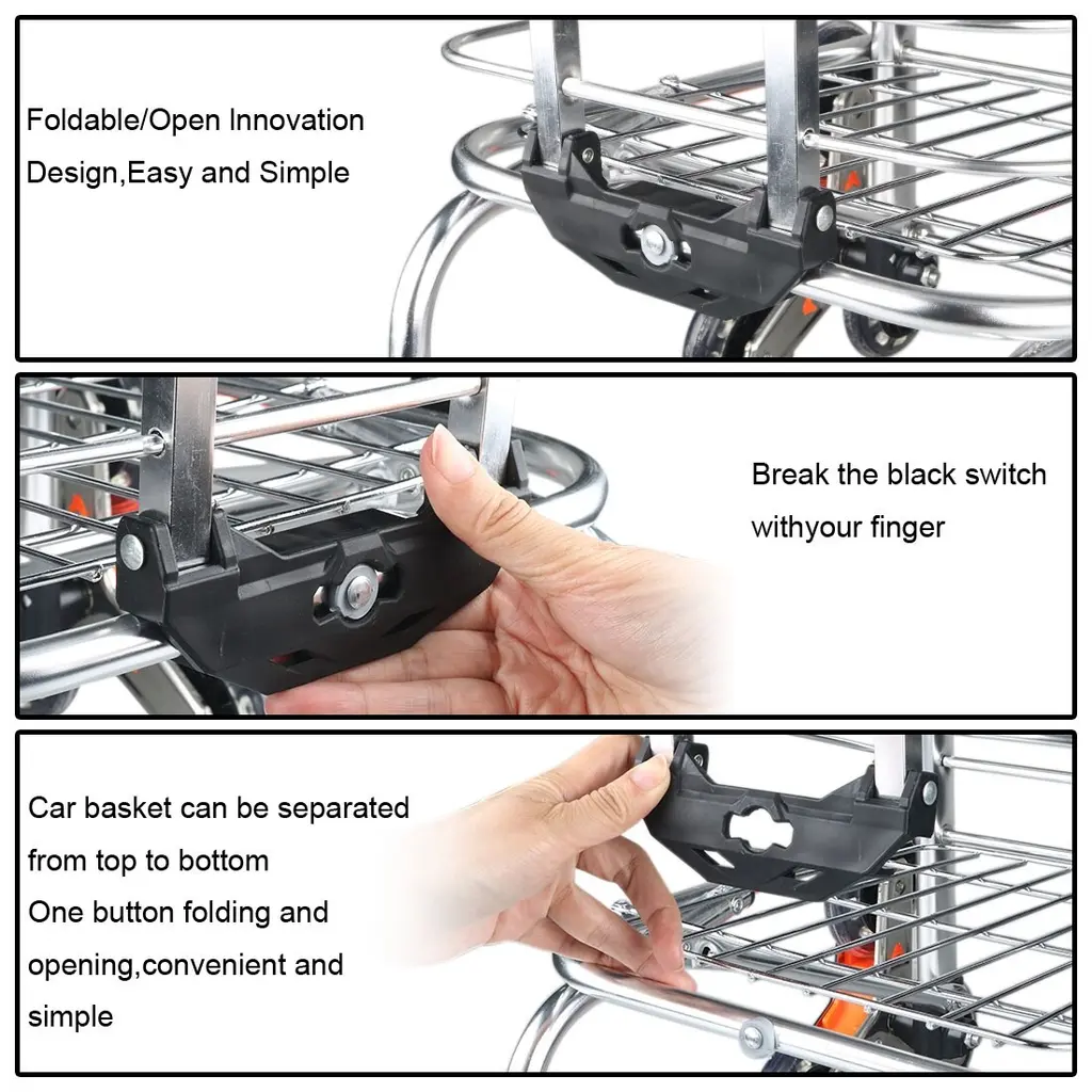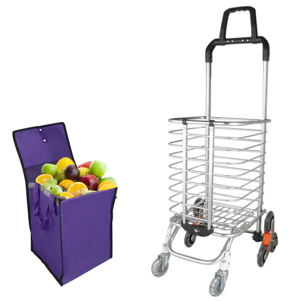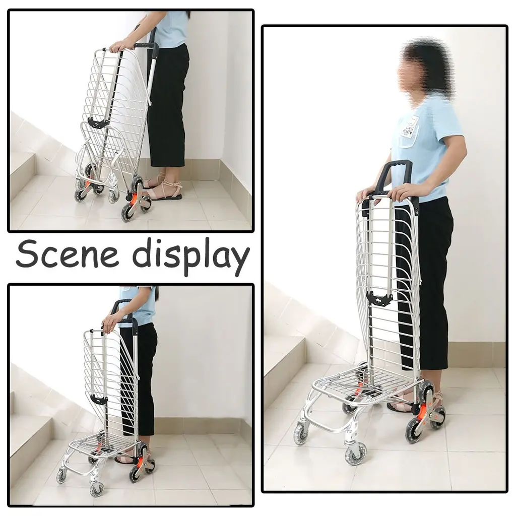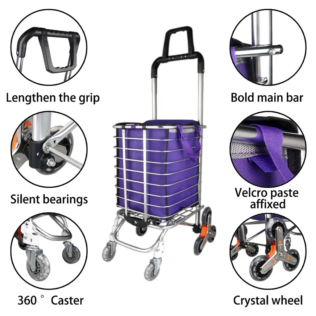 EASY STAIR CLIMBING DESIGN: Three wheel designed specifically for stair climbing ability. Cart glides up and down steps easily. Wheels are good on terrains such as grass, stairs, cobblestones, concrete, and gravel. The front wheel is a universal wheel, 360 degrees easy to rotate.COLLAPSIBLE FRAME UTILITY SHOPPING CART: The frame of the shopping cart can be collapsed as a dolly to transport large and heavy items easily. The base of the utility cart also folds allowing the cart to take up less space while being stored.MULTIPLE USES FOLDING SHOPPING CART: This utility car can be used for an endless variety of situations such as shopping at farmers markets, markets, groceries, camping, sport events and malls. This trolley can also be used for transporting laundry to and from the laundromat and running errands around town. It includes one bungee cord for large, heavy loads. and can take 110lbs of weight when pulling goods.UNIQUE DESIGN COLLAPSIBLE SHOOPING CART: Double handle has a comfort grip to help you upstairs easily and no bending when you climb the stairs. The shopping cart with 35L large capacity can be installed water, vegetables, edible oil and so on. Thick aluminum alloy bracket and double shaft makes shopping cart have good-looking and strengthen the load. The wheels fixed with a thread are firmly not falling.TIPS: If you have problems installing, please contact our customer service, we will provide you with installation instructions and video guidance.Package includes: 2 rear wheels+2 front wheels+1 bag+1 cart+1 kit+1 binding rope+2 hooks.Features: Three wheel designed specifically for stair climbing ability. Cart glides up and down steps with ease. Wheels are good on terrains such as mud, grass, stairs, cobblestones, concrete, and gravel. The front wheel is a universal wheel, 360° easy to rotate. Collapsible Frame:The frame of this cart collapses so that you can use it as a dolly to transport larger and heavier items with ease. The base of the cart also folds allowing the cart to take up less space while being stored. Multiple uses:This cart can be used for an endless variety of situations such as shopping markets, markets, groceries, and malls. And also be used for transporting laundry to and from the laundromat and running errands around town. It includes one bungee cord for large, heavy loads. Unique design:Double handle, when you climb the stairs when not bending, to help you effort, easy upstairs. 35L large capacity for installing water, vegetables, edible oil and so on, Thick aluminum alloy bracket and double shaft, so that shopping cart not only good-looking and strengthen the load; The wheels are fixed with a thread and are firmly not falling. Dimension:The entire cart measures: 15.2 x 20.5 x 40.9 inches(L*W*H)The bag: 10.6 x 10.6 x 15.7 inches(L*W*H)The cart can take 110lbs of weight when pulling goods. Package includes: 2 rear wheels+2 front wheels+1 bag+1 cart+1 kit+1 binding rope+2 hooks. TIPS: If you have problems installing, please contact our customer service, we will provide you with installation instructions and video guidance.