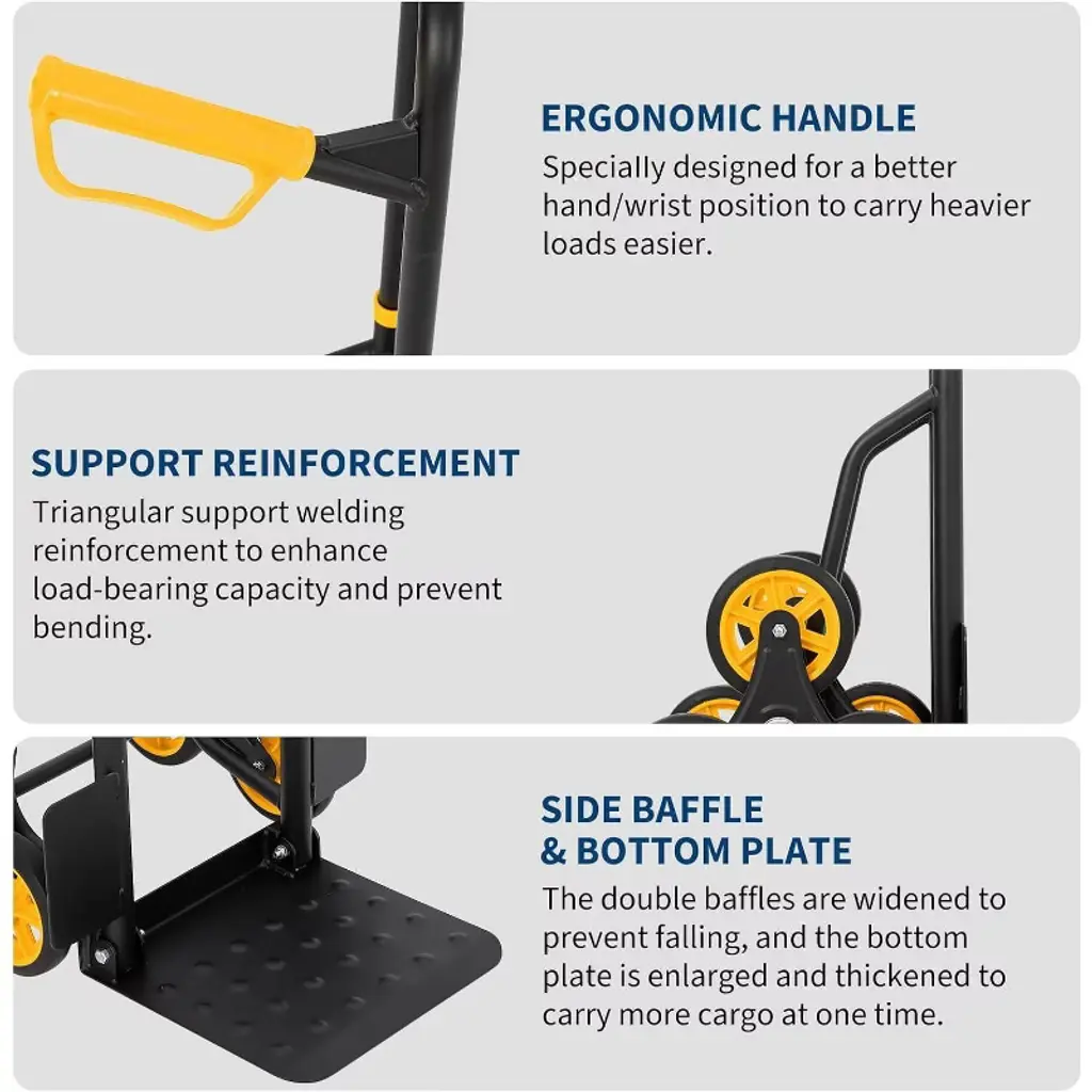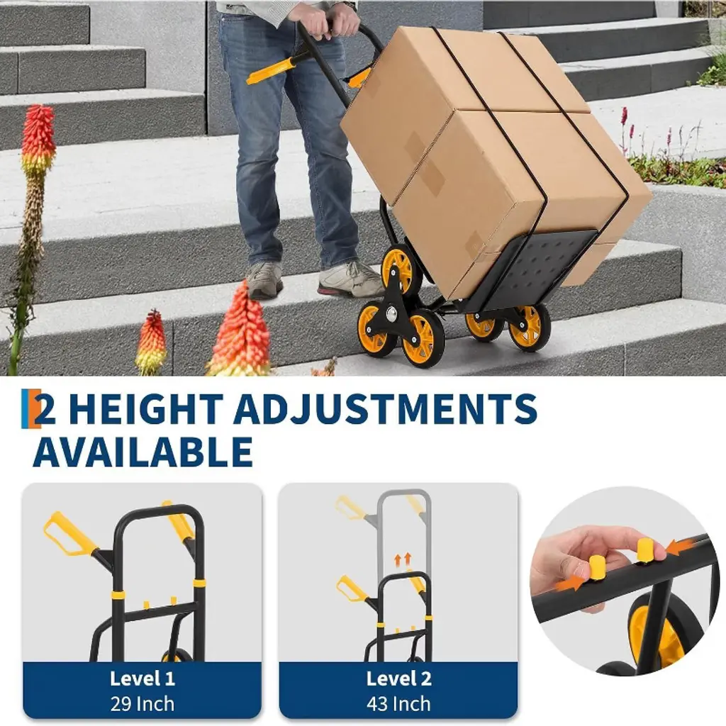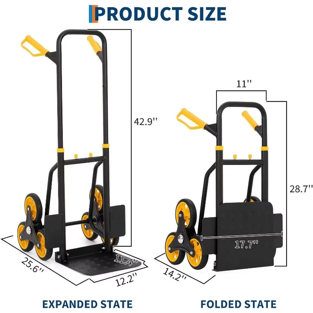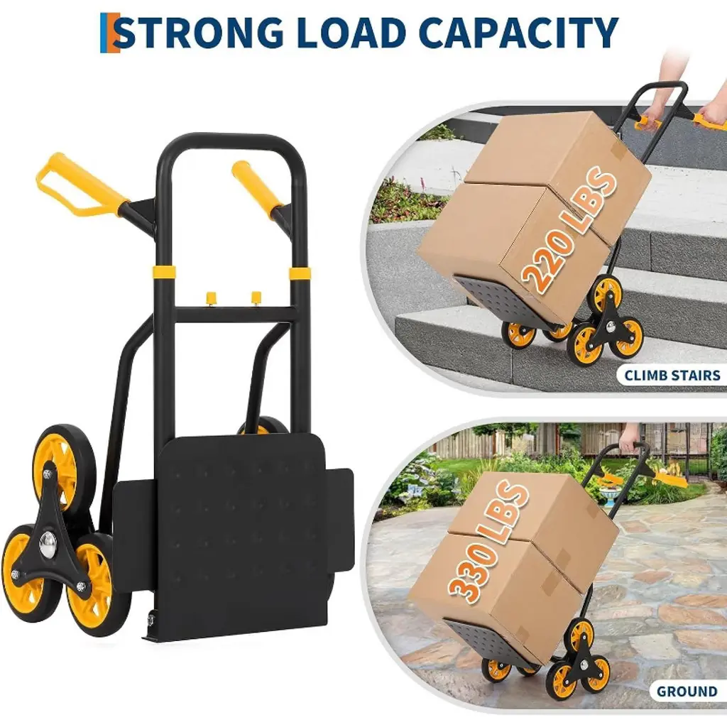 Conquer stairs with ease—this Stair Climbing Hand Truck moves heavy loads like magic. Highlights at a Glance: - 6-Wheel Stair Climber – Glides smoothly on stairs, grass, concrete. - 330lb Capacity – Heavy-duty steel frame with reinforced welding. - 220lb Stair Limit – Safe for heavy loads going up and down stairs. - Dual Ergonomic Handles – Soft-grip design reduces back strain. - Folds Flat (17.7") – Stores in car trunks/closets. - 2 Elastic Ropes – Secures boxes, appliances, groceries. - 1-Min Setup – No tools, ready to use instantly. - Multi-Scene Use – Home, warehouse, garden, shopping. Specification: Max Load: Climb Stairs-220 lbs, Ground-330 lbs Unfold Size: 17.7" x 25.6" x 42.9" Folded Size: 17.7" x 14.2" x 28.7" 2 Adjustable Height: 29", 43" Material: Iron Packing List: 1x Stair Climbing Dolly 2x Elastic Ropes 1x User Manual Friendly Note: 1. Always ensure the load is securely fastened before climbing or descending stairs to prevent shifting or falling. 2. Use both hands to maintain control, especially on stairs or uneven surfaces. 3. When climbing stairs, move slowly and steadily to maintain balance and avoid tipping. 4. Avoid sudden movements or sharp turns while on stairs to keep the cart stable.