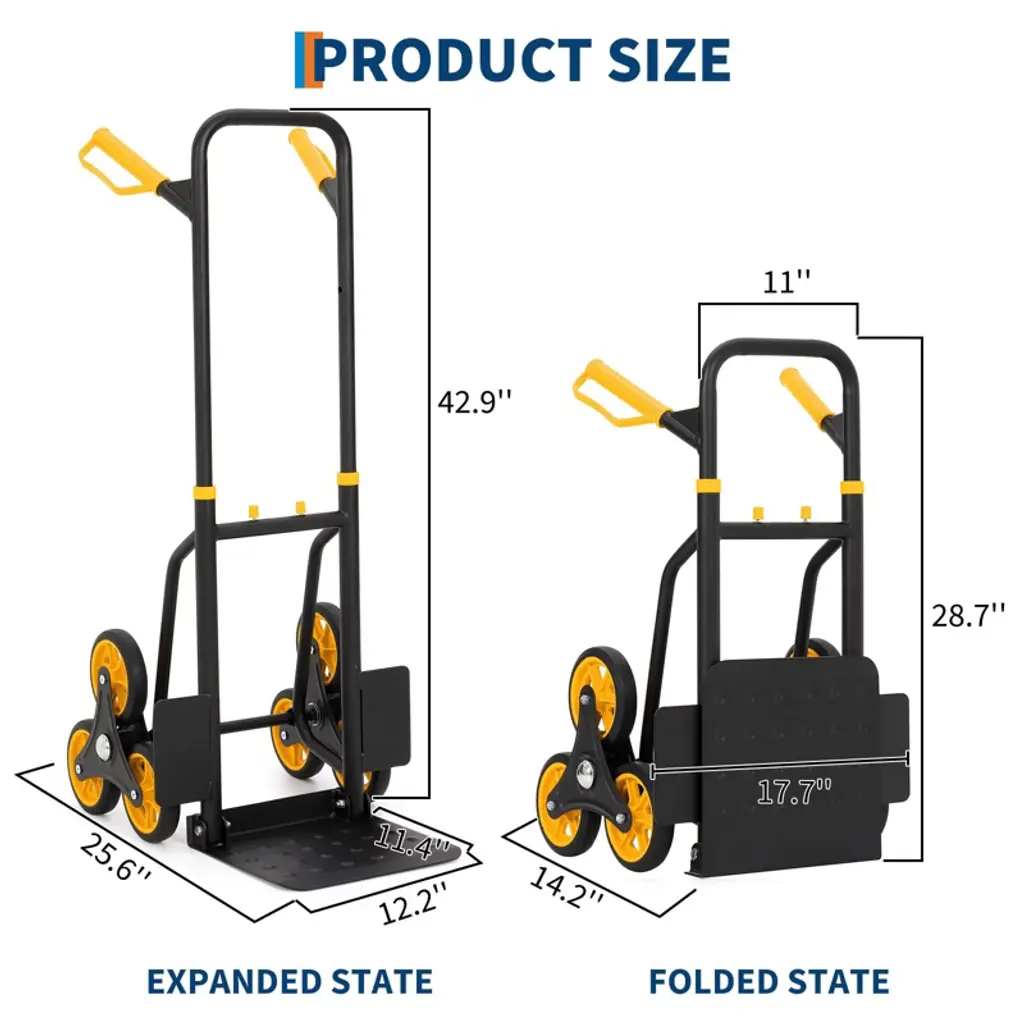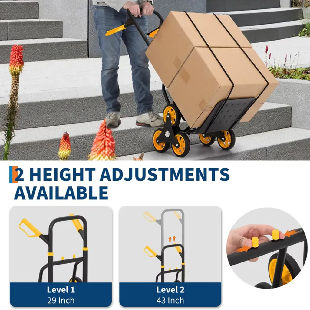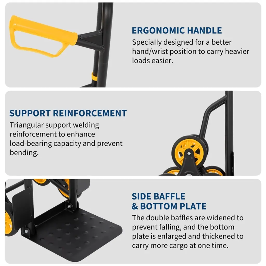 This heavy duty stair climbing dolly makes moving heavy items up and down stairs effortless. Featuring reinforced metal construction and triangular welding, it supports up to 330 lbs on flat ground and 220 lbs on stairs. The unique six-wheel design glides smoothly over stairs, curbs, and uneven terrain. With an ergonomic telescoping handle and a compact folding frame, it is easy to store and comfortable to maneuver, making it ideal for groceries, boxes, and equipment. Two elastic ropes ensure your cargo stays secure during every trip.