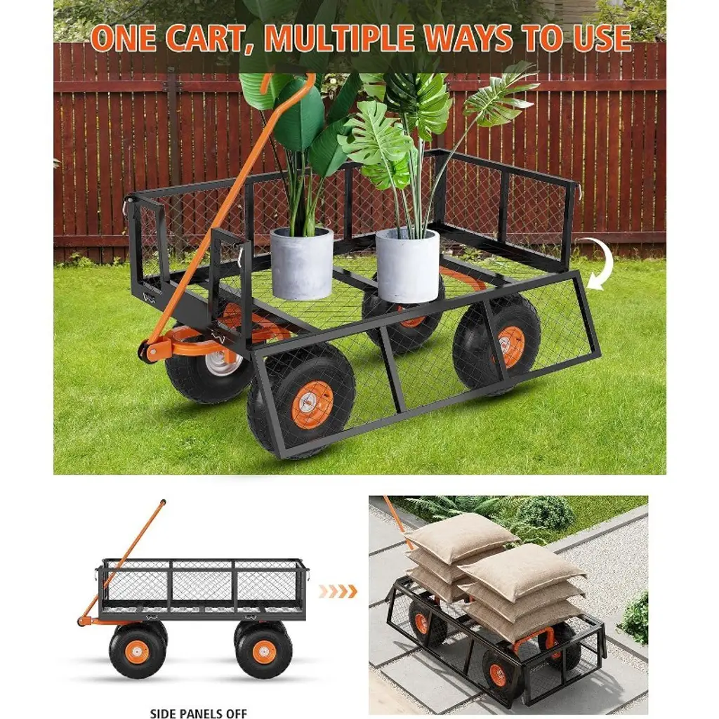 Steel Cart With 10" Wheels, 500lbs Heavy Duty Utility Wagon Cart With Removable Sides & 180° Rotating Handle For Garden, Lawn, Farm, Black + Orange