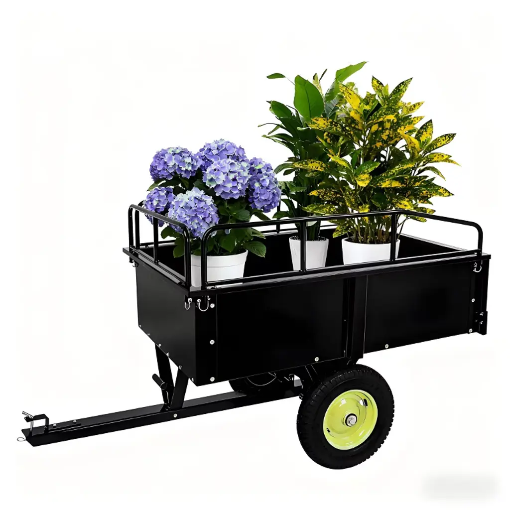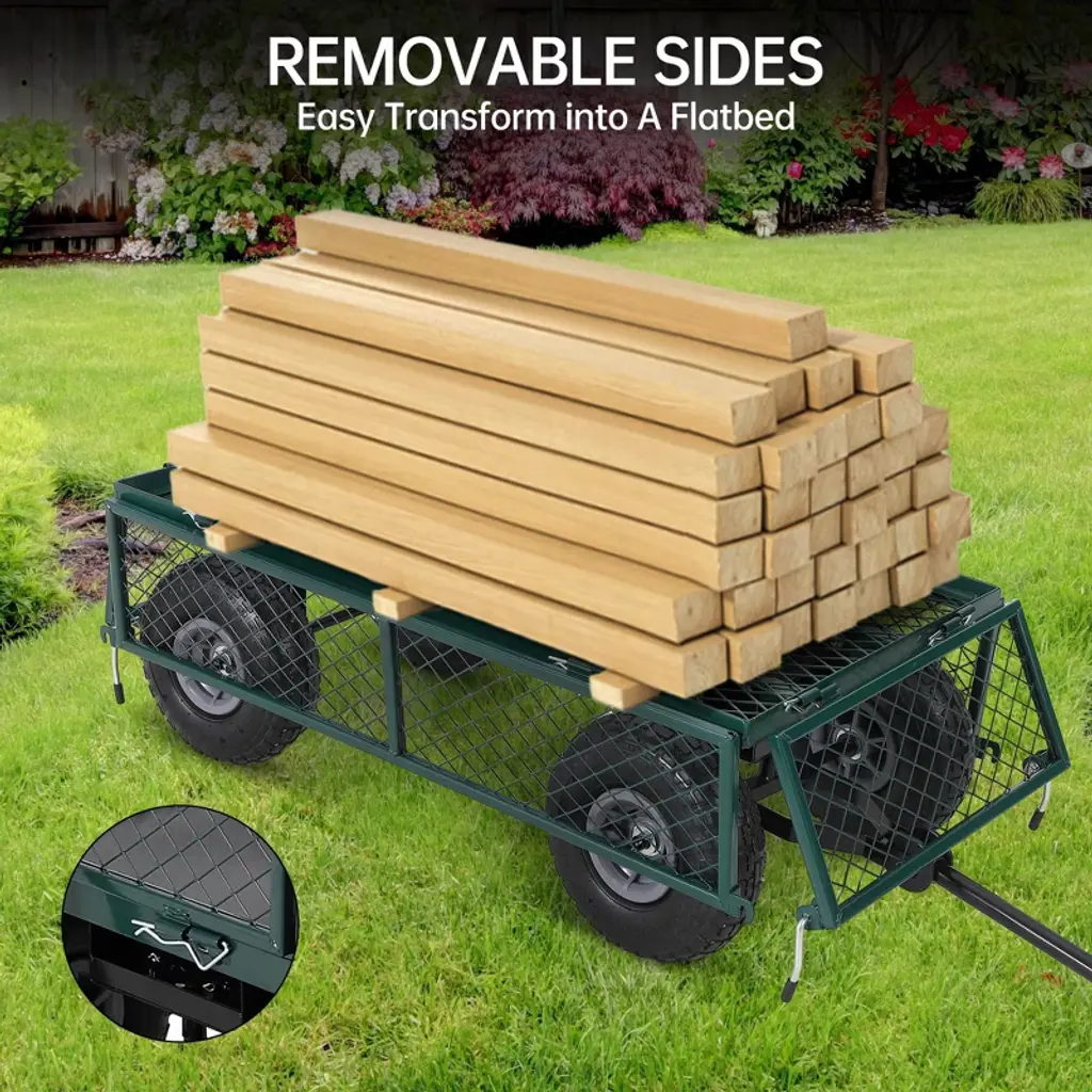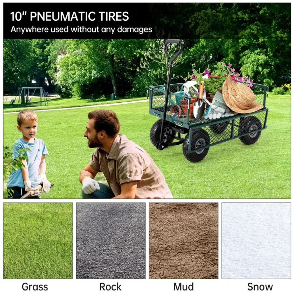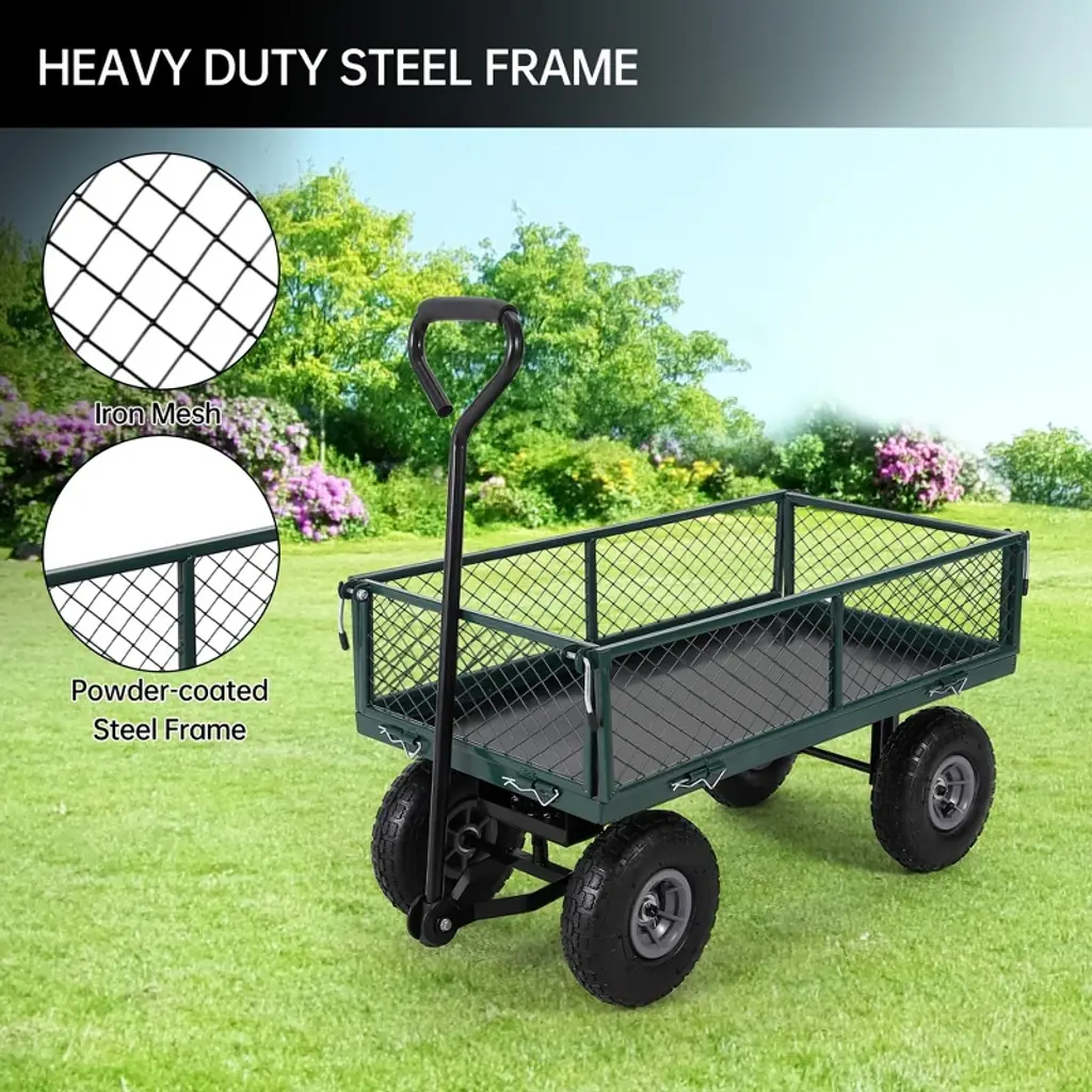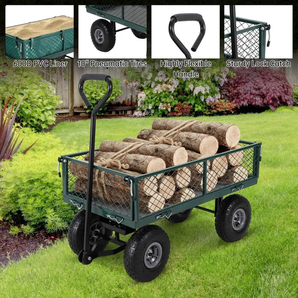 Get more done in your yard with this heavy-duty steel garden cart, engineered for durability and versatility. Its reinforced steel mesh construction supports up to 440 lbs, making it perfect for hauling soil, mulch, firewood, or gardening tools. The cart features a waterproof liner to keep loose materials contained, plus a net bag for large lightweight items. Easily transform it into a flatbed in minutes by removing the side panels, making it ideal for transporting bulky loads. Pneumatic wheels and an ergonomic handle ensure smooth maneuvering on all terrains.