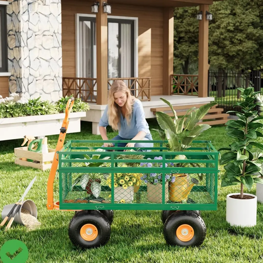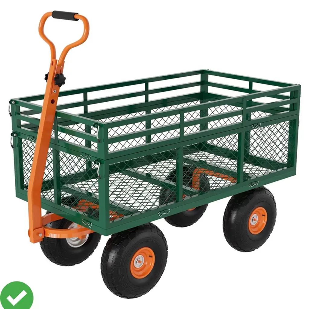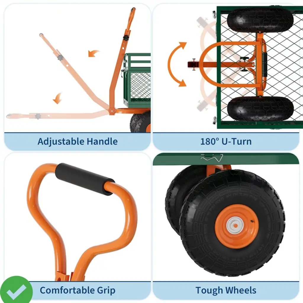 Built from powder-coated steel mesh, this utility cart carries up to 1,400 lb of soil, firewood, or equipment without flexing. The four side panels lift off when you need a flatbed for bulky items, then latch back on to contain loose mulch or compost. A 180-degree pivot handle teams with 10-inch pneumatic wheels to track smoothly over grass, gravel, and uneven ground while maintaining balance on slopes. Assembly is straightforward¡ªattach the wheels and handle, load up, and start rolling your landscaping or barn projects right away.