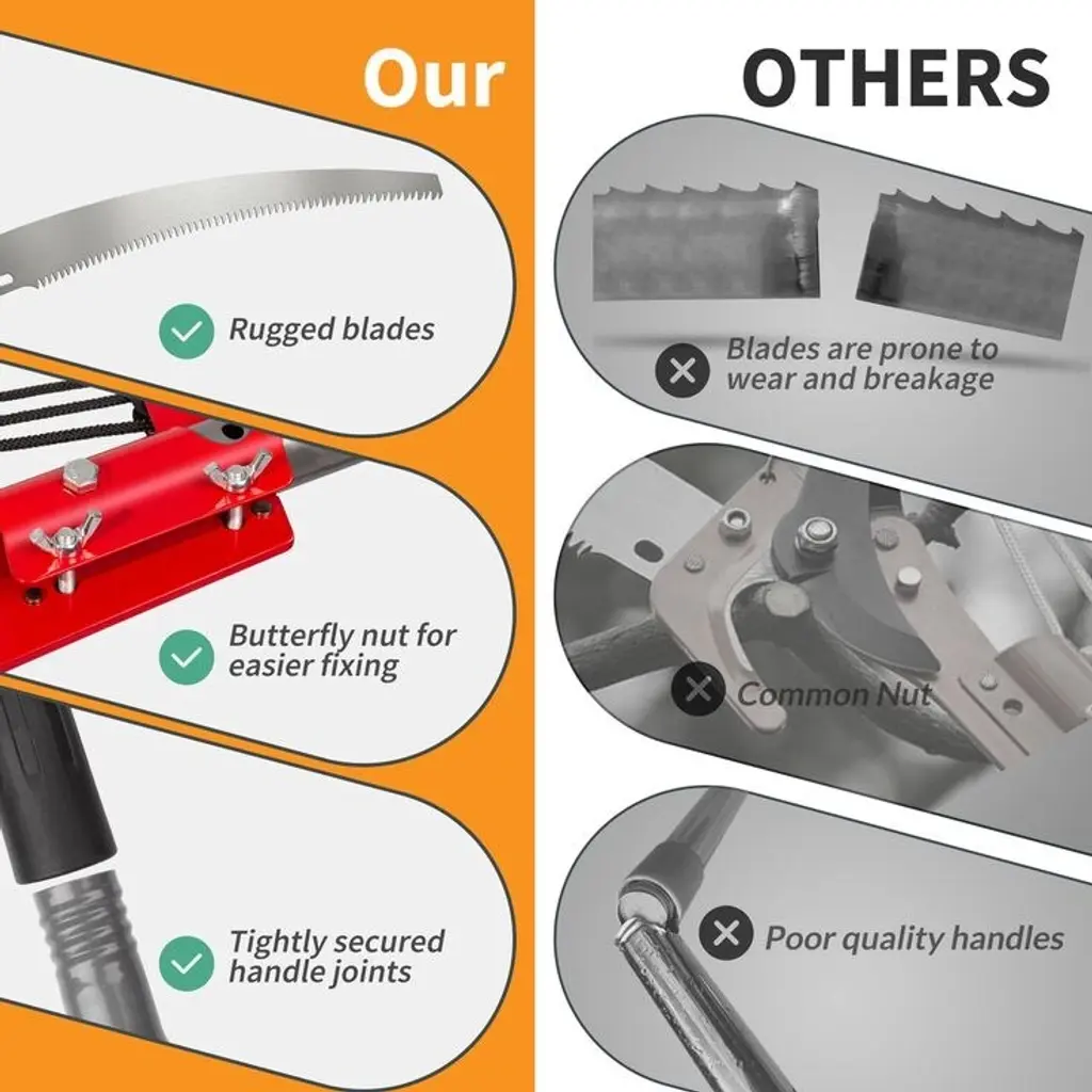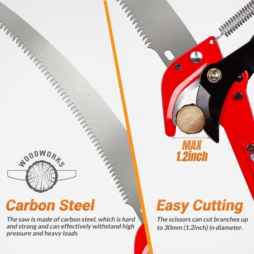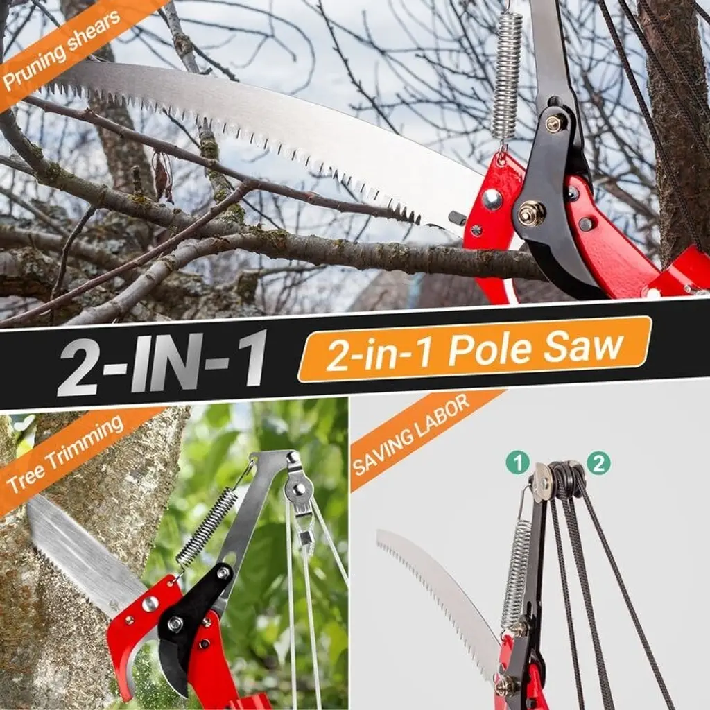 This heavy-duty 2-in-1 tool features a carbon steel saw blade for thick branches and a manganese steel pruner (handles up to 1.2" twigs), boosted by an upgraded dual-pulley system for effortless cutting. Its 7 adjustable poles extend from 33.6" to 117.3", offering versatile reach while remaining lightweight. Built for durability with abrasion-resistant blades and a stainless steel handle, it ensures safety and longevity. The tool-free assembly with butterfly nuts allows one-person setup in minutes—perfect for gardens, orchards, and yards.
