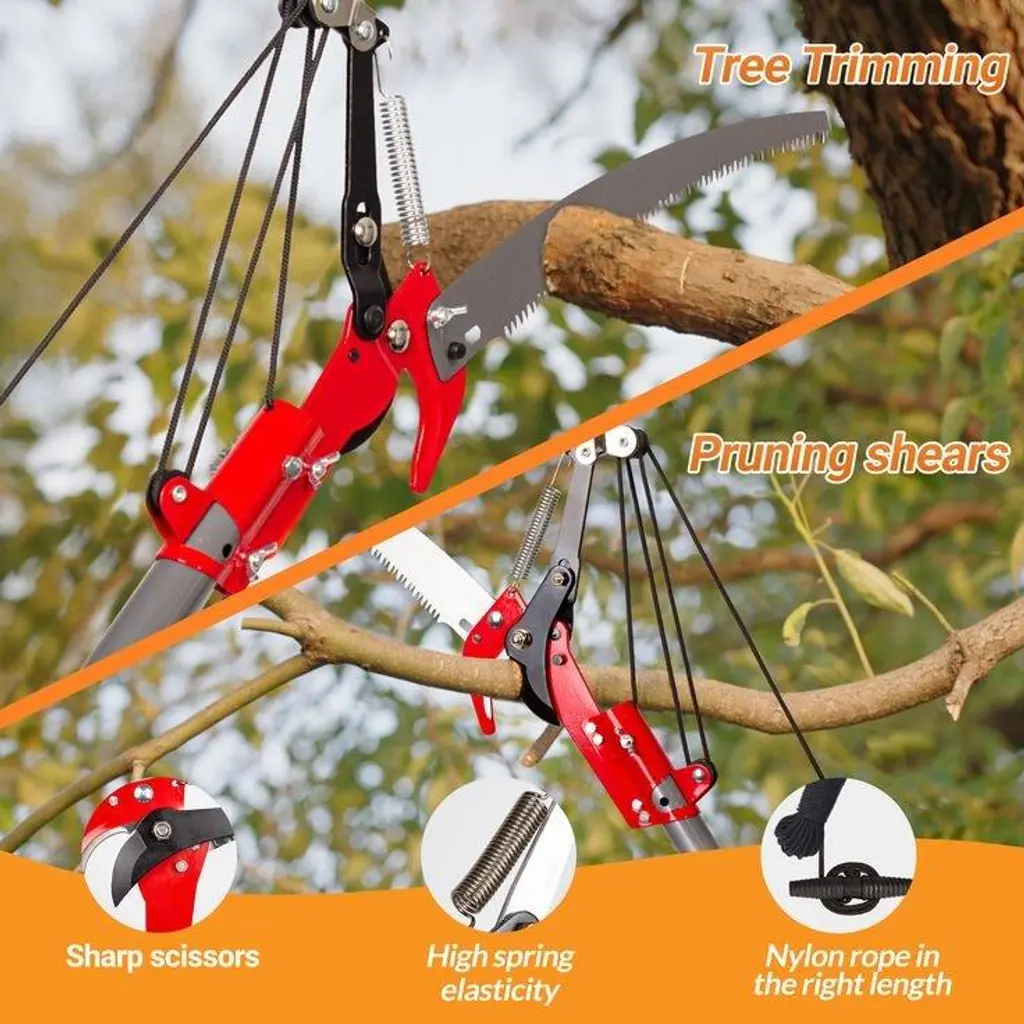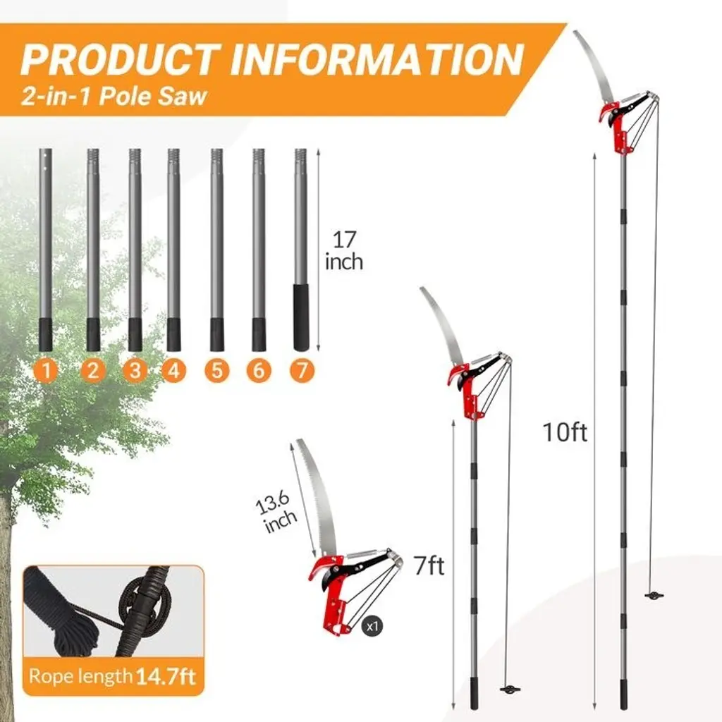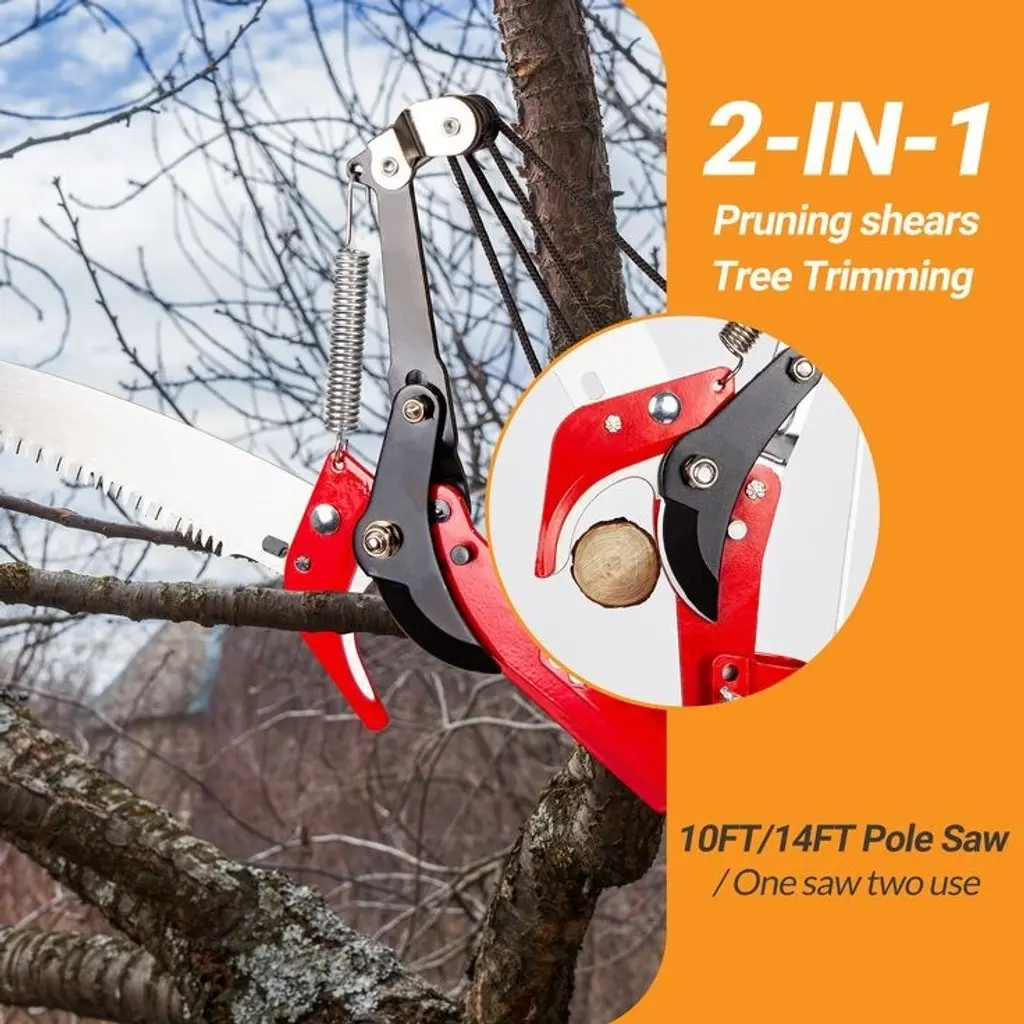 This heavy-duty 2-in-1 tool features a carbon steel saw blade for thick branches and a manganese steel pruner (handles up to 1.2" twigs), boosted by an upgraded dual-pulley system for effortless cutting. Its 7 adjustable poles extend from 33.6" to 117.3", offering versatile reach while remaining lightweight. Built for durability with abrasion-resistant blades and a stainless steel handle, it ensures safety and longevity. The tool-free assembly with butterfly nuts allows one-person setup in minutes—perfect for gardens, orchards, and yards.