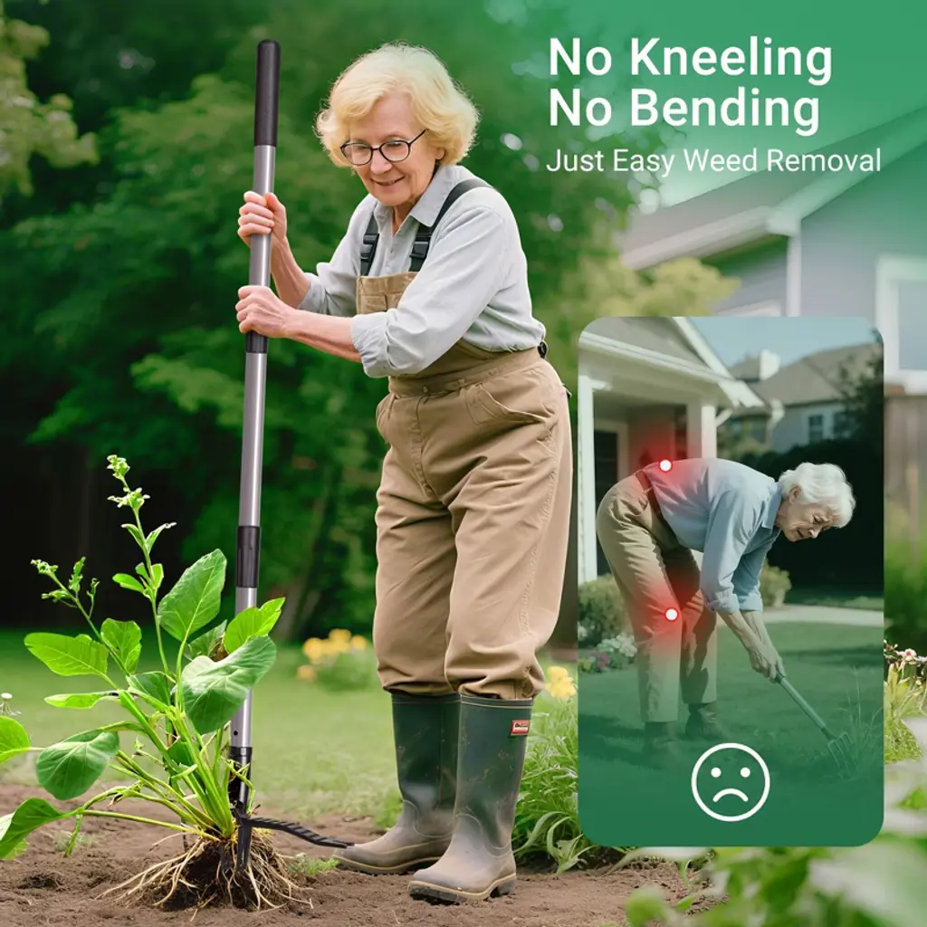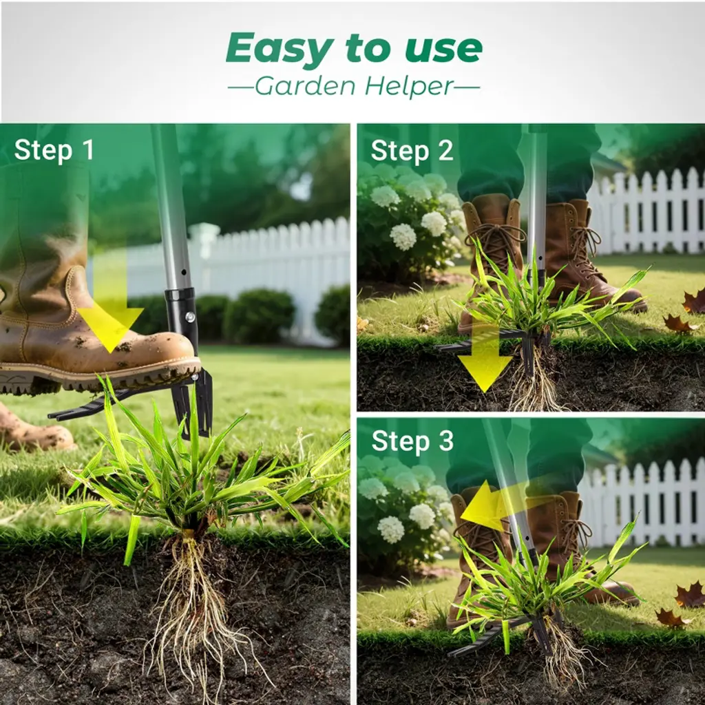 Root-Gripping Power Our pincer claw design digs deep to remove weeds—roots and all—even in tough, dry soil. Perfect for stubborn dandelions, thistles, and crabgrass. Works where basic weeders fail. Stand-Up Comfort No more kneeling or back strain! The long handle lets you weed while standing upright. Ideal for seniors, busy homeowners, or anyone who wants pain-free yard work. Adjustable for Any Height Customize the multi-section steel handle to your perfect length. The cushioned grip ensures comfort and control, whether you're tall or petite. Simple Operation Just position, step on the pedal, and tilt—weeds pop out effortlessly. No complex techniques needed for perfect results every time. Heavy-Duty Metal Build Constructed with rust-resistant steel for years of reliable use. This isn't a flimsy tool—it's the last weeder you'll ever need.