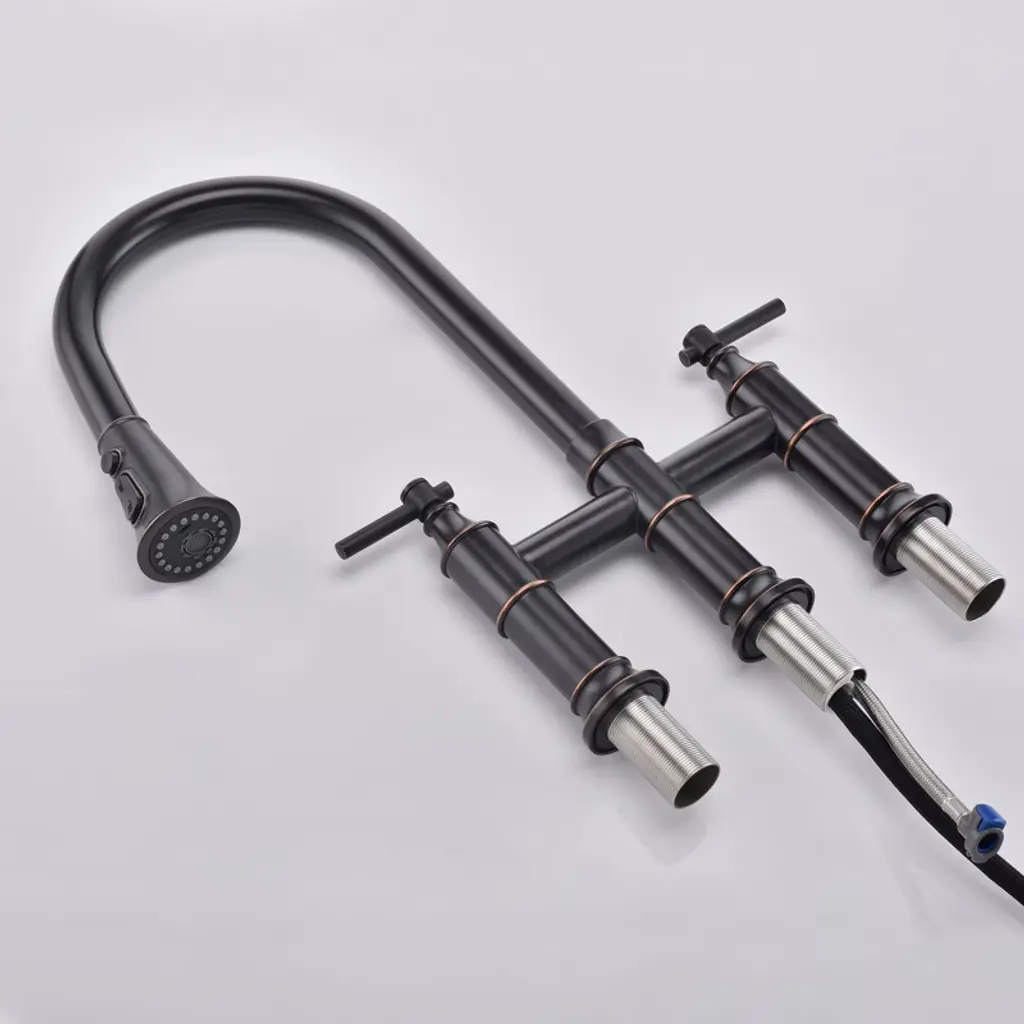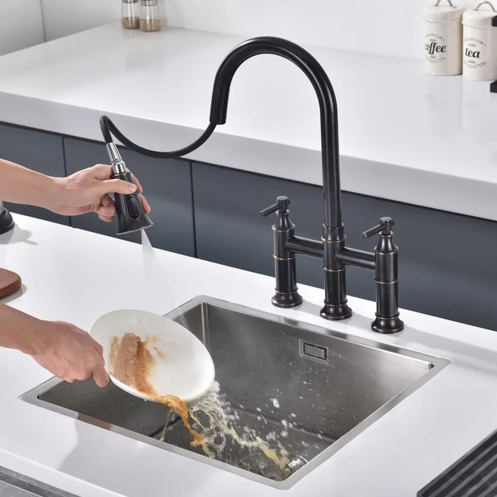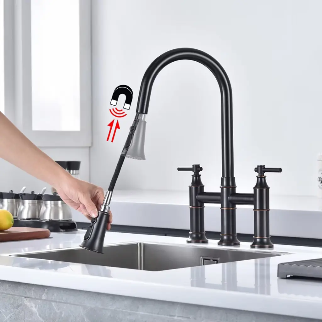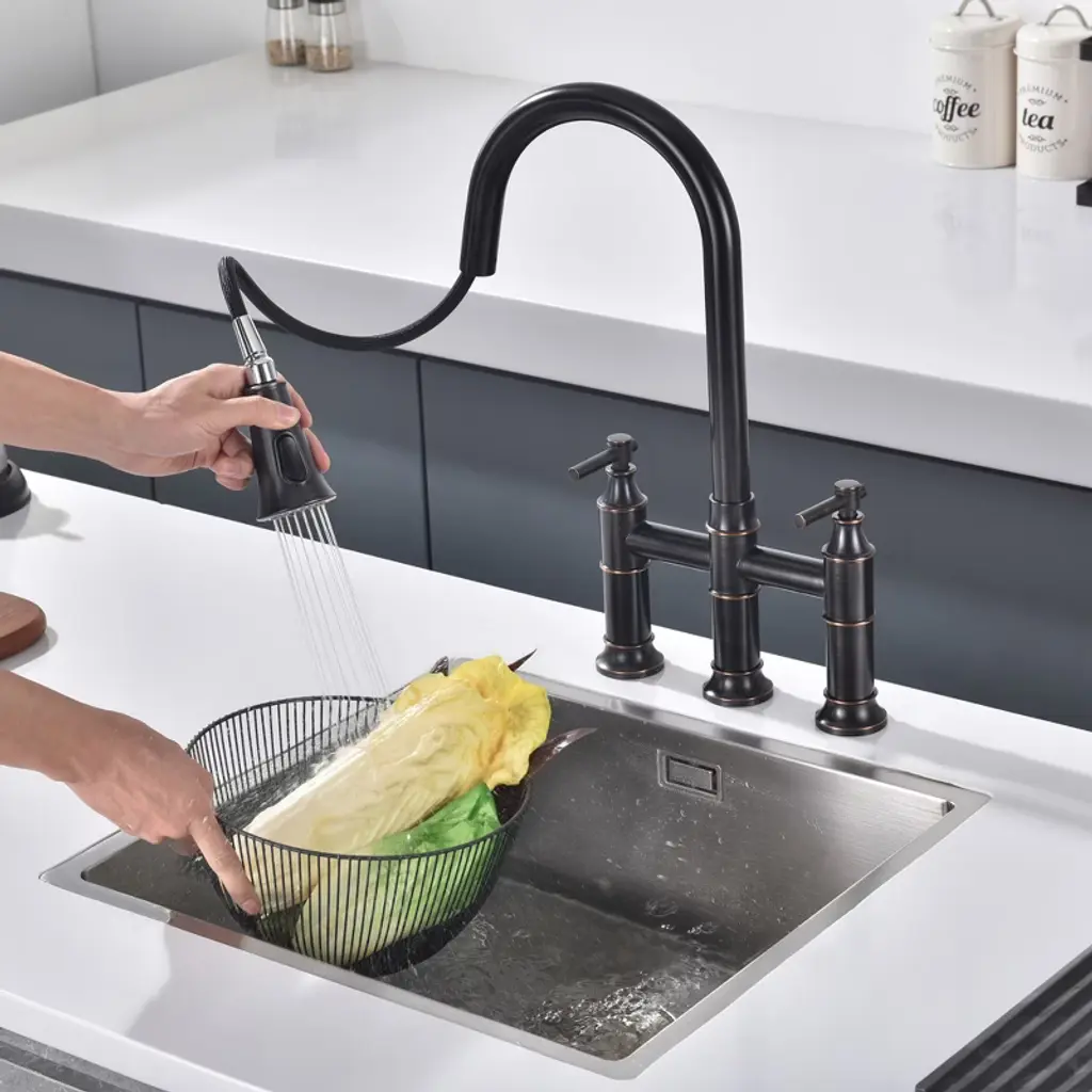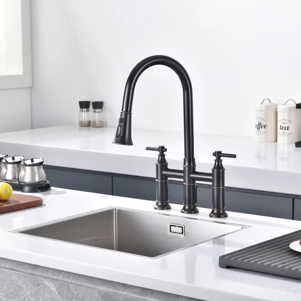 Install a convenient and useful 3 hole faucet in your kitchen with the SUMERAIN bridge faucet with pull-down spray head and lever handles! This heavy-duty faucet features a pull-down spray head spout offers an extended range of motion all around the sink. Plus, it is made with lead-free SUS304 stainless steel with a superior corrosion & rust-resistant finish that is easy to clean. This bridge kitchen faucet meets ADA compliance. This faucet comes with 3 different spray settings to help meet your cleaning needs - stream, spray, and powerful blade. Product listed in the California CEC modernized appliance efficiency database system and ECPA Department of Energy (DOE) qualified list. This kitchen faucet has ICC-ES PMG certification and is compliant with standard: ASME A112.18.1/CSA B125.1-2018, plumbing supply fittings(the same standard as cUPC certification). Product is Lead Free compliant with standard: NSF/ANSI/CAN 372-2022 drinking water system components - lead content. Certified Safe: Our faucet is certified under NSF/ANSI/CAN 61-2022 drinking water system components - health effects. Model:S6119PQ-OB-TAProduct Name: Kitchen Faucet with Pull Down SprayerMaterial: SUS304 Stainless SteelFinish: Oil Rubbed Bronze SUMERAIN is a established name in the US plumbing industry which puts great emphasis on stylish and durable. Perfection does not always have to be expensive. SUMERAIN masterful products are high quality and inexpensive. Over three decades of manufacturing experience has provided us with the extensive market knowledge and the ability to offer new products at reasonable expense. The key to our success is intelligentization- we have rapidly expanded into exciting new products groups to be at the forefront of the market. We are dedicated to bringing you the latest designs utilising the most up-to-date technology. The new product design team benefit from a development system audited to ISO9001 standards, meaning each product is designed, sourced, evaluated and warehoused in a high standard. About this item specificities 1.The lead-free SUS304 stainless steel kitchen faucet meets the mandatory requirements as determined by the safe drinking water act for plumbing fixtures and fittings across North America.2.Magnetic suction sprayer can automatic return, more accurate and more gentle strength to avoid surface friction damage. 3.3 Function sprayer: aerated stream and spray for everyday tasks, powerful blade function for heavy-duty rinsing, you can spend less time than using a standard spray. Gooseneck design offers ample clearance for filling tall pitchers. 4.Superior corrosion & rust-resistant finish can pass the 72 hours acid salt spray test, lasts as long as new. It can prevent dirty from sticking to faucet surface, clean faucet by cloth is enough in daily use.5.The classical 3 hole bridge kitchen faucet with a 360° swivel pull down sprayer allows you to reach every hard-to-reach corner of your kitchen sink to remove food debris with the touch of a button, making it easy to tackle everyday kitchen cleaning tasks. You don't need a separate side-sprayer any more.