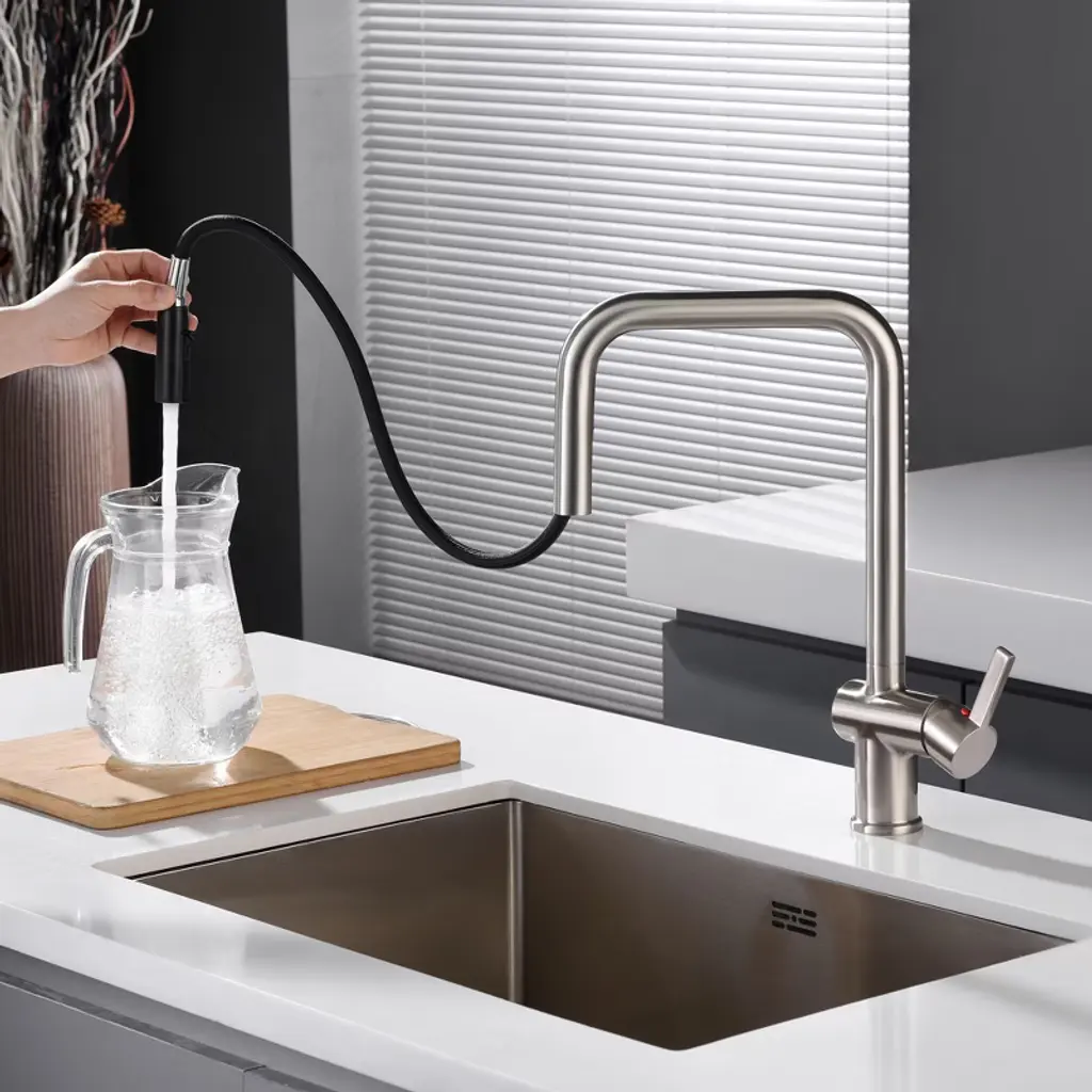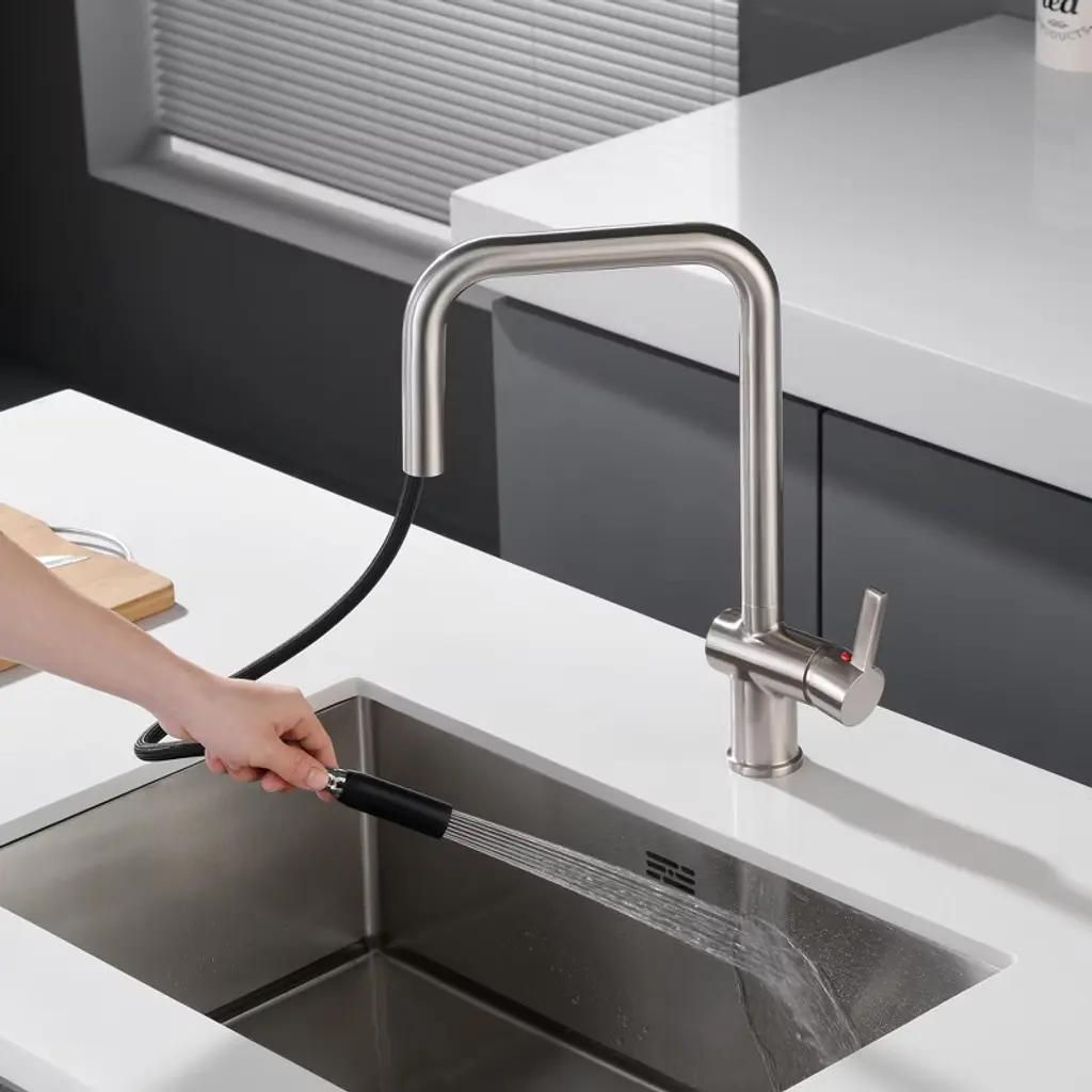 Elevate your kitchen functionality with this premium pull-down kitchen sink faucet featuring dual spray modes and gravity ball retraction technology. Engineered for heavy-duty use, the single-handle design with ceramic cartridge ensures precise temperature control and drip-free operation. As an ICC-ES PMG certified product meeting ASME A112.18.1/CSA B125.1 standards, it guarantees lead-free safety through NSF 61/372 compliance while conserving water with CEC/ECPA DOE listed efficiency. The 360° swivel spray head effortlessly tackles deep sinks, while the reinforced hose withstands daily tugging. This commercial-grade kitchen faucet combines professional performance with residential convenience. Ideal for modern households seeking ADA-compliant, high-arc faucets with commercial durability. Model:S6129P-BN-TAProduct Name: Pull Down Kitchen Sink FaucetMaterial: Stainless Steel 304+ Zinc AlloyFinish: Brushed Nickel SUMERAIN is an established name in the US plumbing industry which puts great emphasis on stylish and durable. Perfection does not always have to be expensive. SUMERAIN masterful products are high quality and inexpensive. Over three decades of manufacturing experience has provided us with the extensive market knowledge and the ability to offer new products at reasonable expense. The key to our success is intelligentization- we have rapidly expanded into exciting new products groups to be at the forefront of the market. We are dedicated to bringing you the latest designs utilising the most up-to-date technology. The new product design team benefit from a development system audited to ISO9001 standards, meaning each product is designed, sourced, evaluated and warehoused in a high standard. About this item specificities 1. Dual-Function Pull-Down Spray Head Experience versatile cleaning with this 360° rotating spray head offering steady stream and aerated spray modes. The retractable hose with gravity ball system ensures smooth automatic retraction and secure docking.2. Single-Handle Precision Control Simplify temperature and flow adjustments with an intuitive single-handle design. The ergonomic lever requires minimal effort for smooth operation, while ceramic disc valves prevent leaks and ensure long-lasting durability. 3. ICC-ES PMG Certified Safety Rigorously tested to exceed ASME A112.18.1/CSA B125.1-2018 standards for material integrity and mechanical performance. The lead-free construction meets ANSI/CAN/NSF 61-2022 and ANSI/CAN/NSF 372 regulations, ensuring safe drinking water compliance for family health.4. CEC/ECPA DOE Listed Efficiency Optimized flow rate at 1.8 GPM passes California's strict CEC water conservation mandates. Energy-saving design qualifies for utility rebates under ECPA DOE guidelines, reducing long-term operating costs without sacrificing pressure. 5. Tool-Free Installation in 20 Minutes Pre-assembled components and included mounting hardware allow DIY installation without professional help.