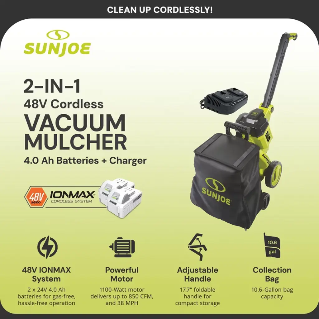 Tackle outdoor cleanup with ease using the powerful 48-Volt Cordless Garden Vacuum and Mulcher Kit from Sun Joe. This versatile 2-in-1 tool combines vacuuming and mulching in one convenient package, giving you the power to clear your yard without the hassle of cords or gas. Powered by two included 24-volt 4.0 Ah rechargeable batteries, it delivers up to 22 minutes of continuous runtime — perfect for quick cleanups or seasonal leaf control. Equipped with a robust 1100-watt motor, this cordless vacuum blasts air at speeds up to 38 MPH and generates an ultra-powerful 850 CFM of suction — strong enough to lift everything from light leaves to stubborn acorns. The high-impact resistant impeller makes short work of debris, reducing leaves to 1/15th of their original size. Whether you're clearing dry leaves, sawdust, packing peanuts, or yard waste, this machine does it all — and neatly collects the mulch in its extra-large 10.6-gallon bag. Storage and portability are also built in. The 17.7-inch adjustable handle collapses for compact storage in your garage or shed, making it a perfect solution for homes with limited space. Say goodbye to hours of raking and hello to effortless yard maintenance — your lawn, driveway, and patio will thank you. When yard work calls, answer with the convenience and performance of cordless power.