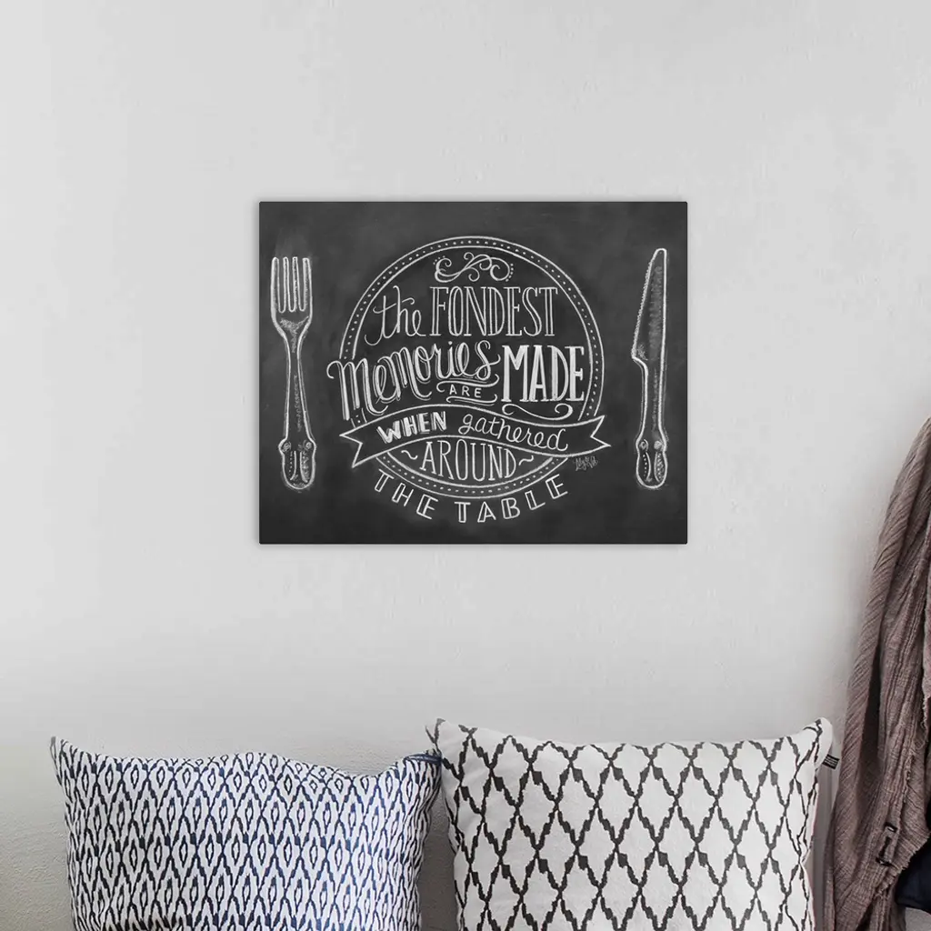"The fondest memories are made when gathered around the table" handwritten and illustrated with a knife and fork.