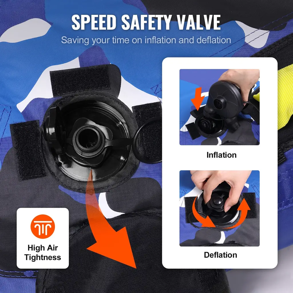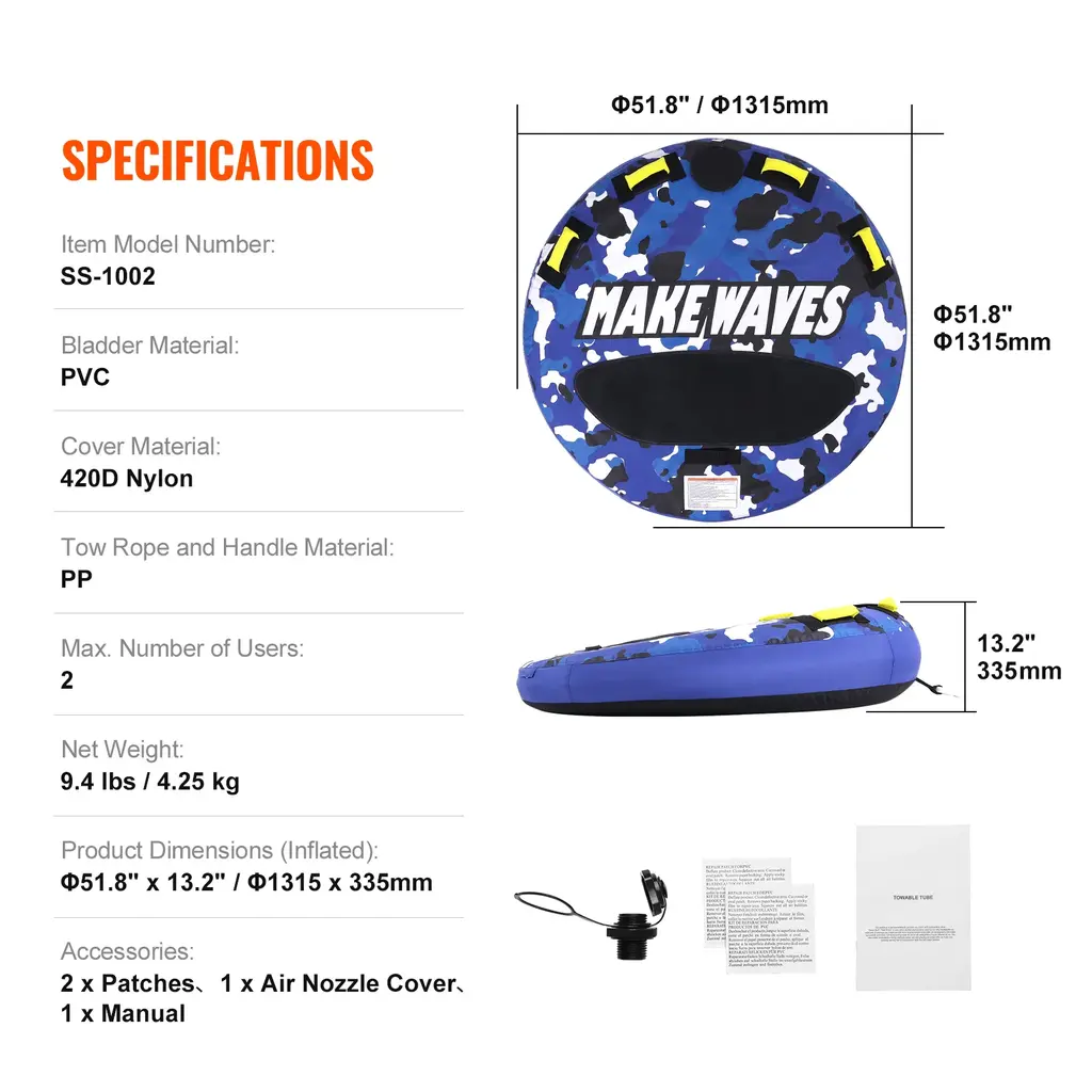 Comfortable Riding Experience: Experience a secure ride with our D-shaped couch towable tube for boating, designed with high backs and wide side walls to prevent falls into the water at high speeds. The towable tube features 10 EVA grips for versatile and comfortable hand-holding options, along with 2 boarding straps for easy re-entry onto the tube after a splash. Durable & Resistant Materials: Our boat tubes and towables are covered with robust nylon, featuring 840D nylon on the bottom and periphery and 420D nylon on the back. This construction provides superior UV protection and resistance to aging and punctures, ensuring the vibrant design remains fade-resistant. Enjoy your water fun in seas, lakes, and rivers with our tough and durable boat tube. Efficient Inflation & Deflation: Equipped with a Boston valve for airtight security and simple operation. Inflation and deflation of this 2-person tube for boating are quick and hassle-free, taking less than 10 minutes. The tube for boat conveniently folds for storage and transport in a handbag, eliminating the need to stow it on a roof rack for transport. 2 Towing Options: With front and rear towing points, our water sport towable provides diverse riding experiences. Attach to the front for a leisurely float in shallow waters or to the rear for an exhilarating kneeling drift on the EVA mat. Spacious for Two Riders: With a maximum load capacity of 340 lbs/510 lbs, our inflatable towable tube comfortably accommodates up to 2 riders. The ultra-wide seat design ensures stability and balance, making it an ideal choice for adults, kids, couples, friends, or family looking to share a thrilling surfing adventure. Package Content 1 x Towable Tube 2 x Patches 2/1 x Air Nozzle Covers 1 x Manual