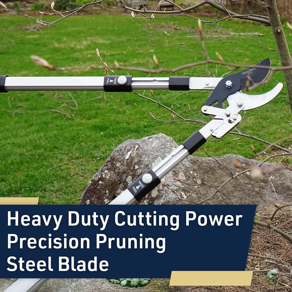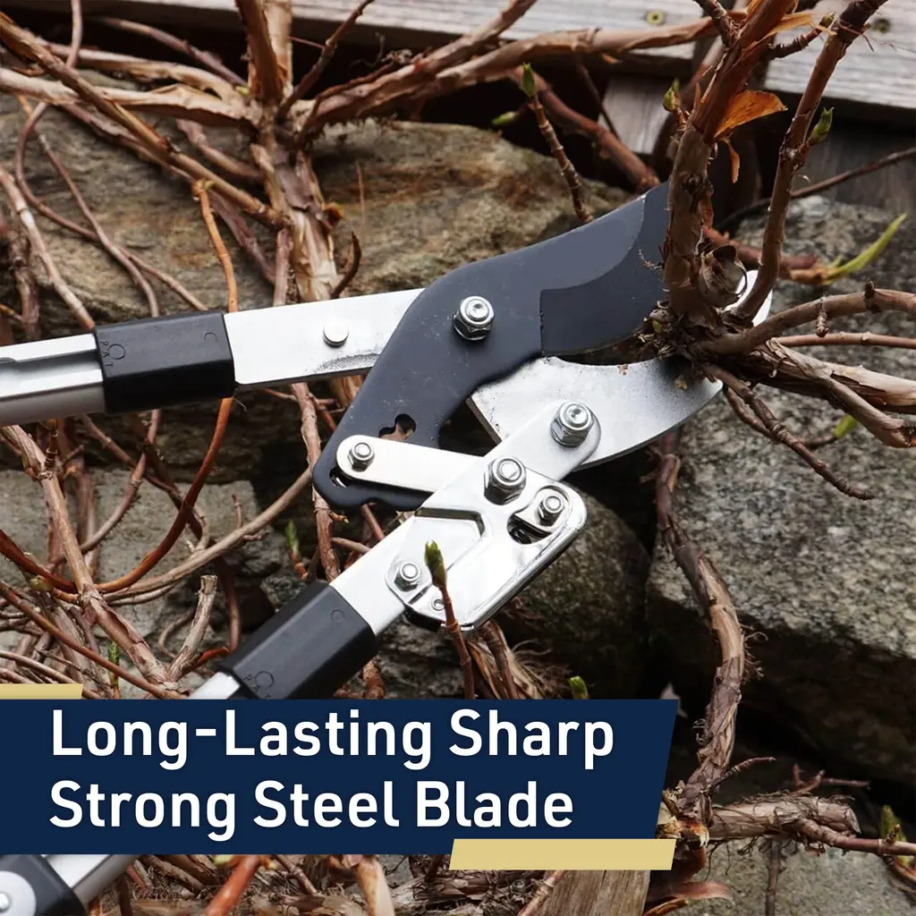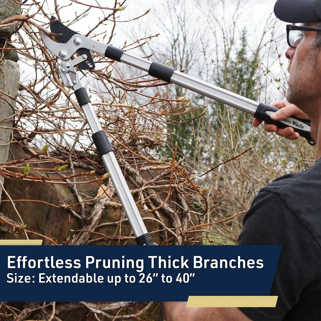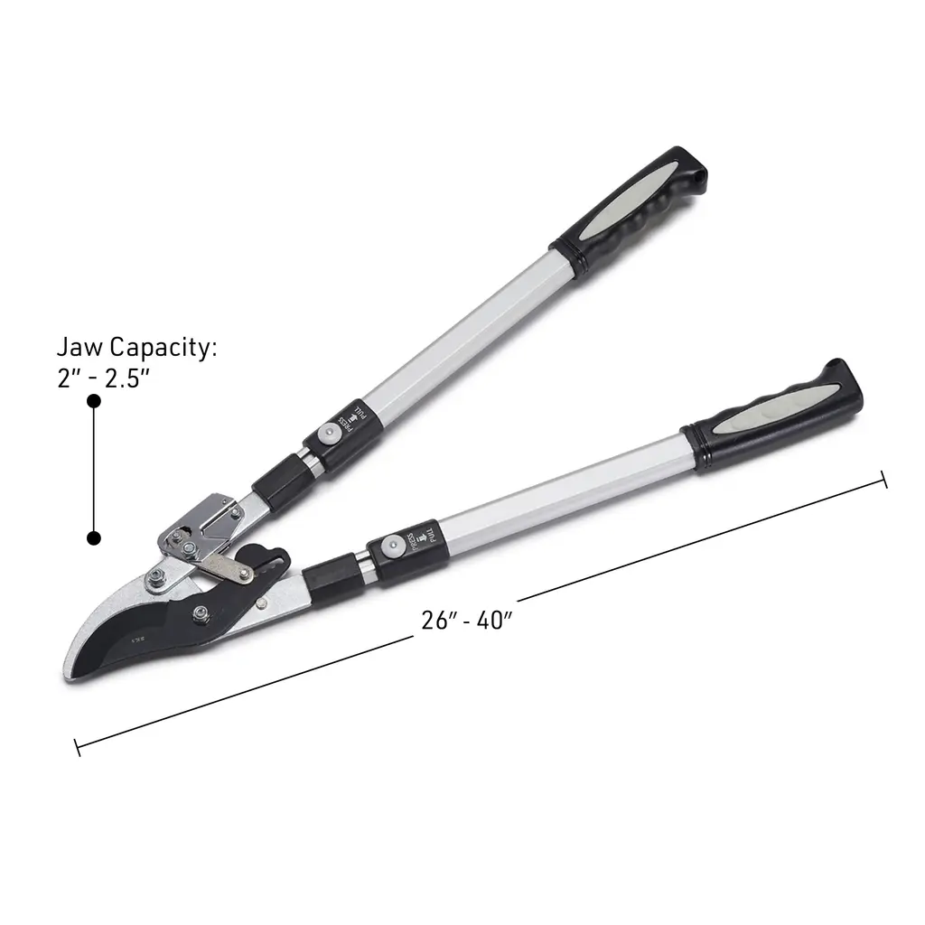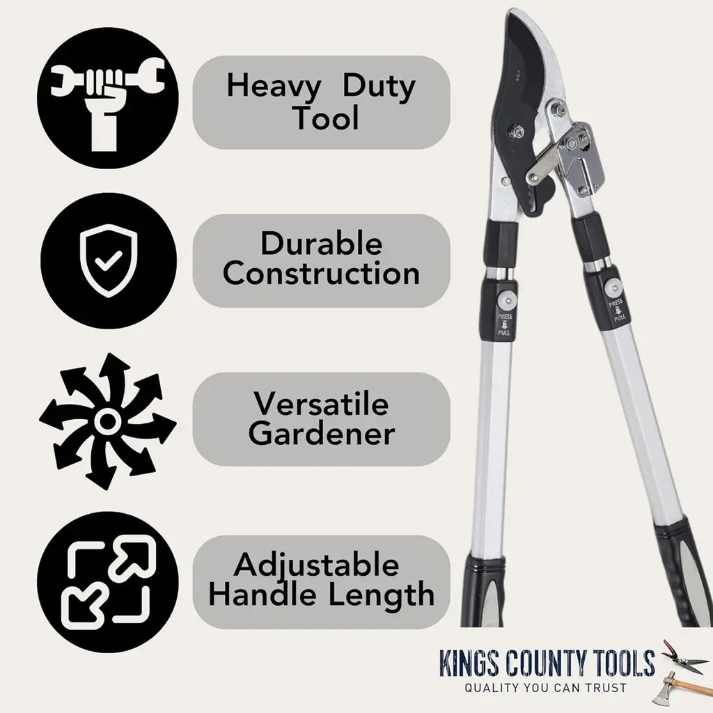 Keeping your landscaping tidy is easier than ever with the Loppers for Gardening by Kings County Tools. This bypass pruner uses a special double ratcheting mechanism and is oversized for strength. The telescoping handles can be adjusted from 26 to 40-inches-long, with 6 pin-locked position stops and rubber grips for secure handling. This tree pruner has a cutting jaw capacity of 2-inches and is designed for cutting green wood, giving you a ton of cutting power with plenty of reach.