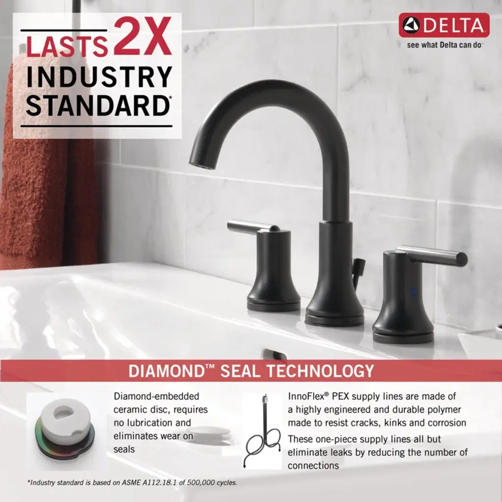 Inspired by the sleek elegance of modern European design, the Trinsic® bath collection completes the look of any contemporary bath, from classic to rustic. Delta® faucets with DIAMOND™ Seal Technology perform like new for life with a patented design that reduces leak points, is less hassle to install, and lasts twice as long as the industry standard*. You can install with confidence, knowing that Delta faucets are backed by our lifetime limited warranty. Delta WaterSense labeled faucets, showers, and toilets use at least 20% less water than the industry standard—saving you money without compromising performance. *Industry standard is based on ASME A112.18.1 of 500,000 cycles.