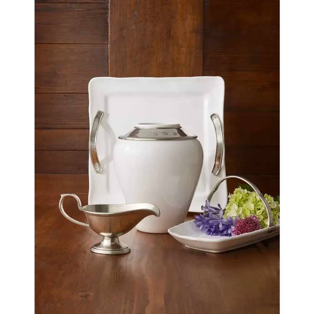 Arte Italica’s best-selling Tuscan Collection, the first pewter and ceramic dinnerware introduced to the marketplace, combines white ceramic with our signature pewter trim. Handcrafted in Italy of the highest quality materials, this classic collection translates seamlessly from traditional to contemporary, from casual to formal. Handmade in Italy. Five-piece setting (charger) includes: charger, dinner plate, salad/dessert plate, pasta/soup bowl, mug. Five-piece setting (cereal) includes: dinner plate, salad/dessert plate, pasta/soup bowl, cereal bowl, and mug. Founded in 1997 by Ann Skidmore, Arte Italica is a story of one woman's passion for Italian history, culture, art, and vintage pewter. Today, Arte Italica is one of the leading importers of European tabletop and home accessories products in the United States. Every piece is handmade and designed so that they can easily be mixed and matched to create a timeless, classic, and effortless look.