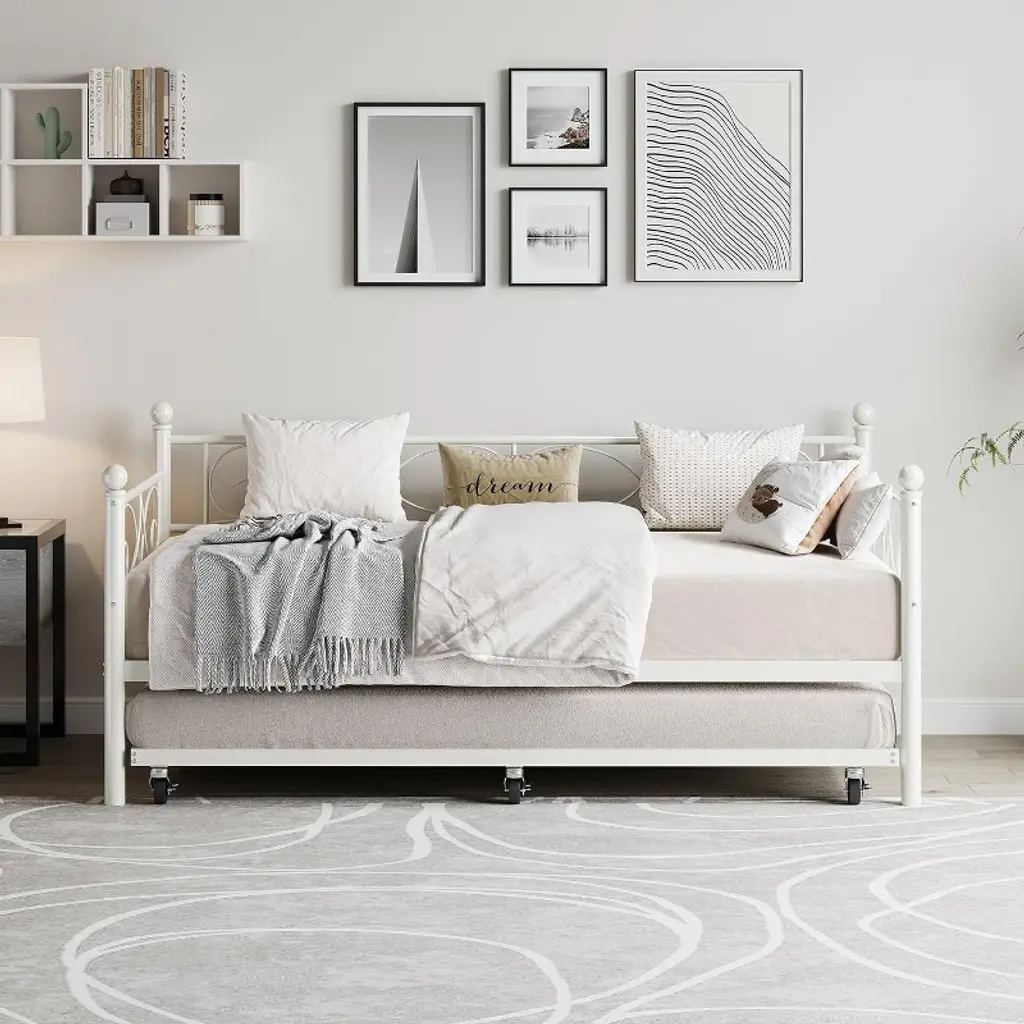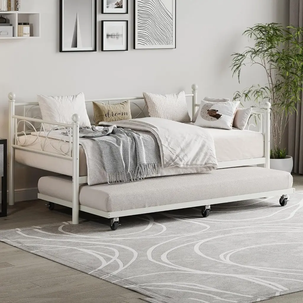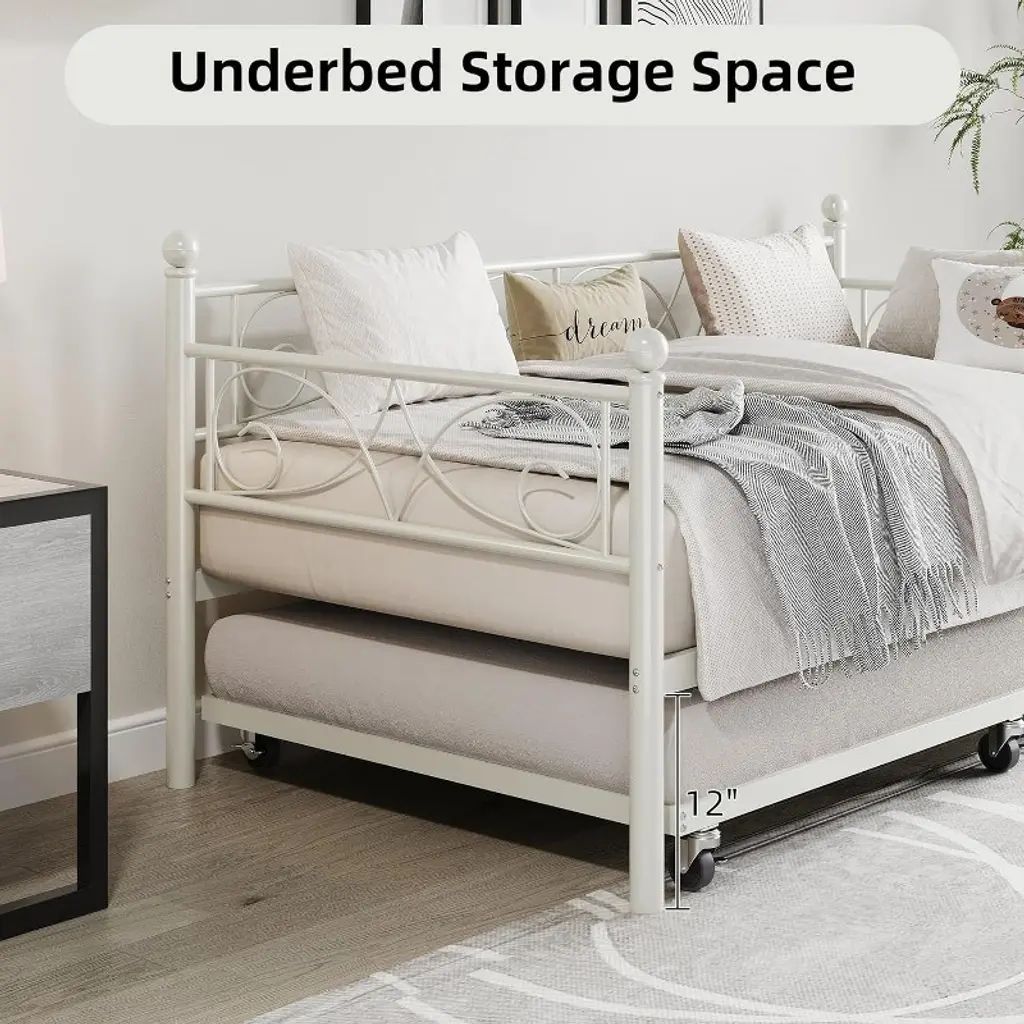 Twin Size Daybed Frame With Trundle Metal Day Bed With Floral Headboard Heavy Duty Steel Slats Supports Modern Bed Frame With Pull-out Trundle White