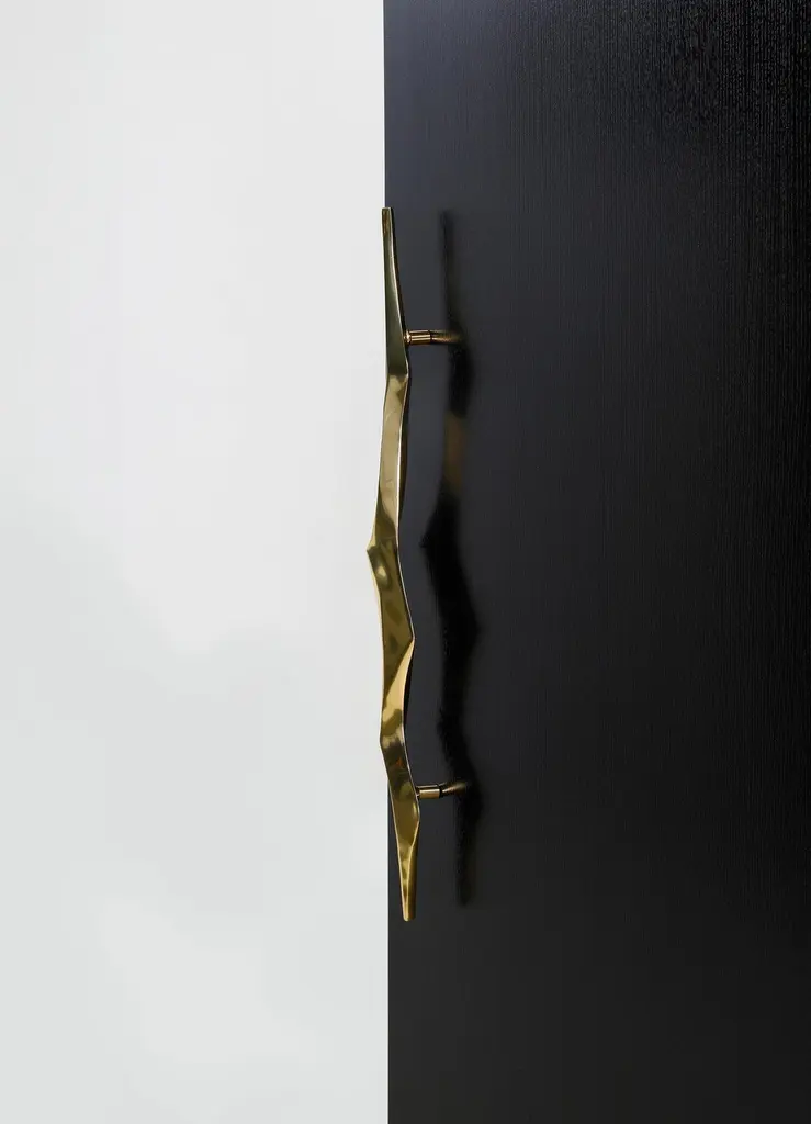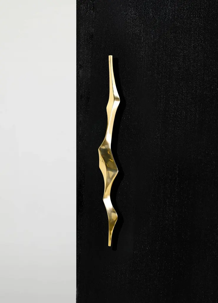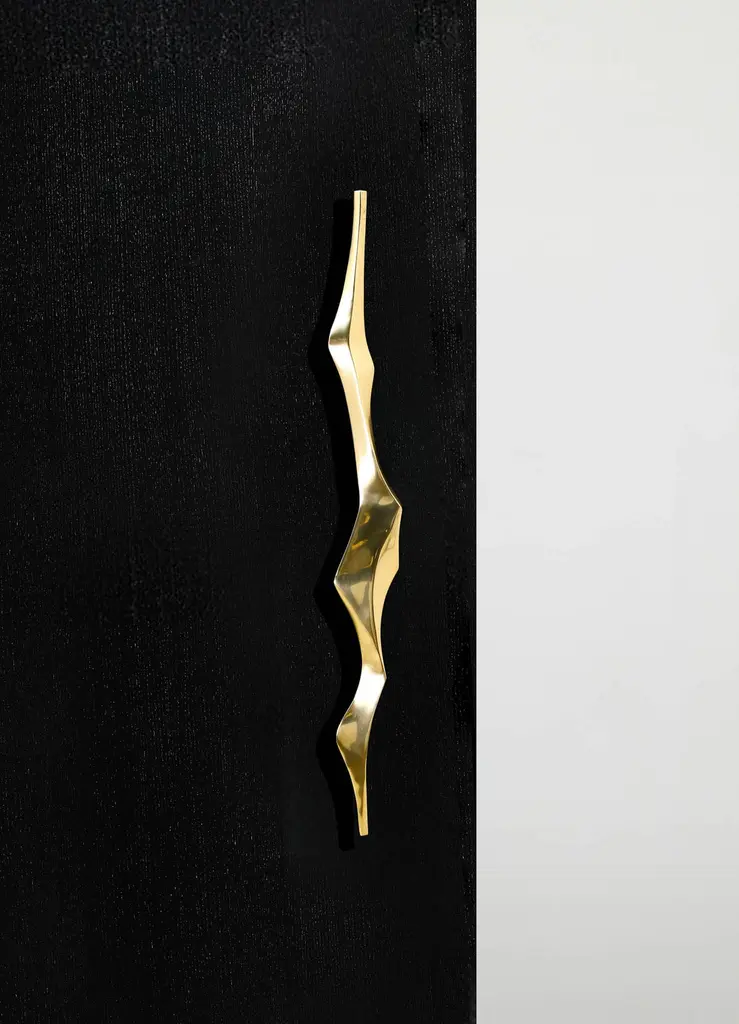 Under The Banyan Gold Color Door Handle B in Brass, Viya by Vikram GoyalEchoing ancient whispers of worship, each object captures the essence of the Banyan tree, believed to hold the divine power to fulfil wishes. Crafted with reverence, these pieces pay homage to the tree's sacred names—Vat Vriksha, Bargad, and Bahupata, the latter signifying its multitude of roots connecting earth and heavens. Beyond brass and form, these objects reflect the intricate dance of aerial roots, encapsulating the symbolism of longevity, mortality, and enlightenment.Handle in brass. Handmade in India.Product DetailsMaterial: BrassSize: 4"L x 32"H x 4"D 10.2 L x 81.3 H x 10.2 D cmWeight: 4.4 kg 9.68 lbsNumber of Pieces: 1 HandleSKU: VHA1902This product has been handcrafted by local artisans. As such, slight variations are a testament to the unique character of a piece made by hand.