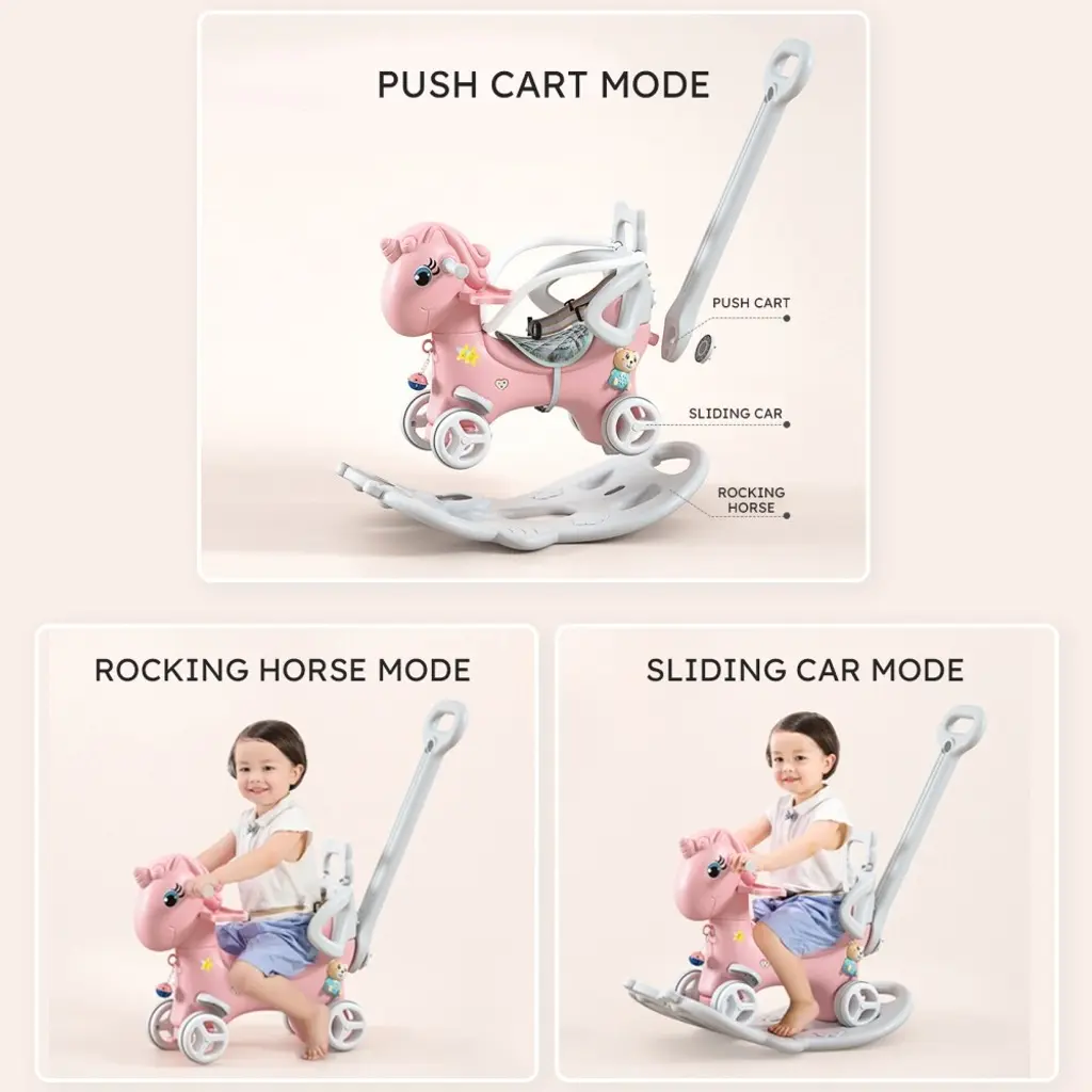 This ride-on toy has 4 modes and is the perfect size for baby boys and girls ages 1-3 to rock and ride on. This cute rocking horse toy gives children a new way to play, with the horse's head turning. Balance bikes with 4 wheels or balance boards provide riding fun for young children of different ages, whether indoors or not. Toddlers will begin to develop their upper body muscles, learn new push and pull movements to rock, and also begin to remember how to move their body to create a certain rhythm. The rocking horse is beautifully packaged, in a box and ready for delivery. If you're looking for a meaningful gift for your child, congratulations, you've found the perfect choice! Features: The wide seat, high backrest and removable footrests will provide your child with a comfortable sitting and riding experience. There is also a sound button on the left side of the seat for more fun for toddlers. This toy helps children improve motor skills, balance and coordination while tapping into their whimsical mind. SAFE FOR BABY: The rocking horse is made of HDPE, lead-free high-quality material, smooth and rounded, and features a high seat back and side covers to keep the little rider safely in place during adventures. The handle is easy to grip and non-slip. Low saddle design and large bottom balance board provide better stability.