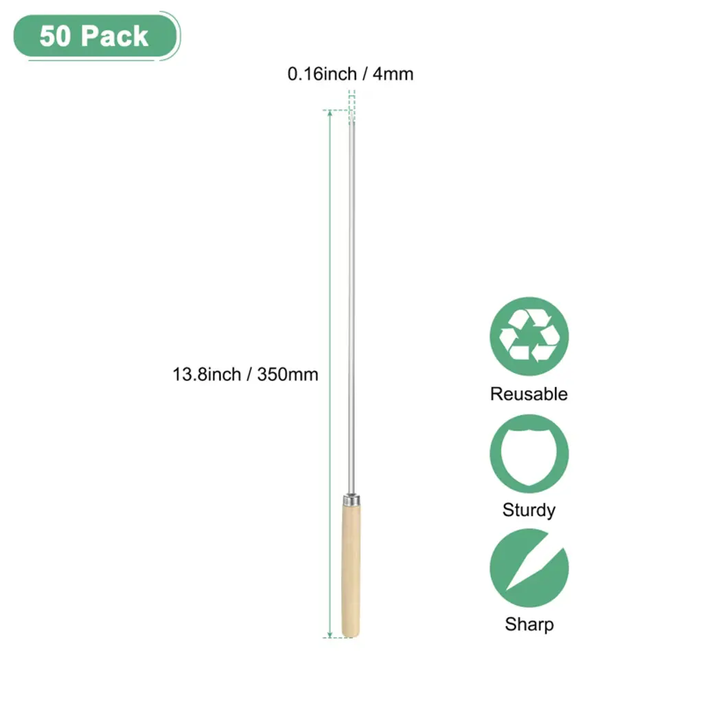 These stainless steel flat barbecue skewers are versatile for grilling a wide range of foods, including meats, fruits, and vegetables. Perfect for outdoor BBQ parties, picnics, camping trips, or family gatherings. Constructed from durable stainless steel, these BBQ sticks offer longevity and reliability when cooking various foods over an open flame. Equipped with a wooden handle for a comfortable grip while grilling, ensuring ease of use. The flat design of the skewers prevents food from slipping during grilling and promotes even cooking from all sides. The wooden handle is heat-resistant, non-slip, and provides a secure and comfortable hold. To preserve the durability of the stainless steel skewers, it is recommended to hand wash and thoroughly dry them after each use, and avoid exposing the wooden handles to moisture.