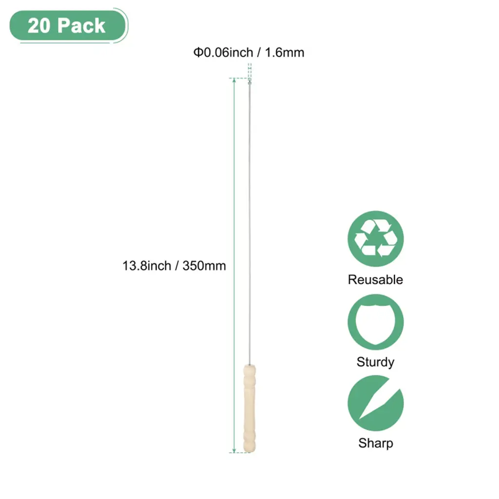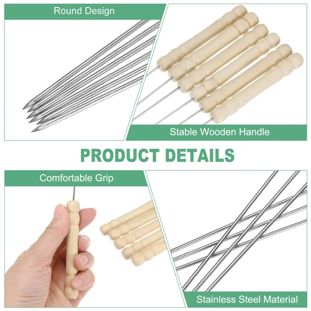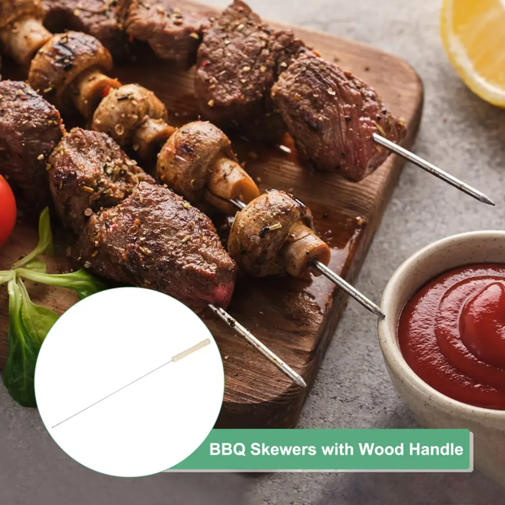 Stainless steel barbecue skewers are versatile for grilling a wide range of foods, including meats, fruits, and vegetables. Perfect for outdoor BBQ parties, picnics, camping trips, or family gatherings. Constructed from durable stainless steel, these BBQ sticks offer longevity and reliability when cooking various foods over an open flame. Equipped with a wooden handle for a comfortable grip while grilling, ensuring ease of use. The wooden handle is heat-resistant, non-slip, and provides a secure and comfortable hold. To preserve the durability of the stainless steel skewers, it is recommended to hand wash and thoroughly dry them after each use, and avoid exposing the wooden handles to moisture.