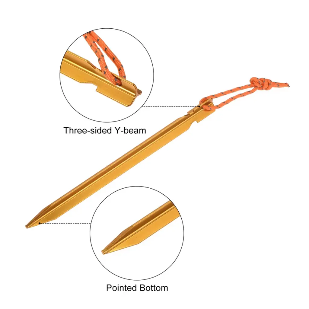 What is this? The tent stake adopts a three-sided Y-beam design, which increases the contact area with the ground and is not easy to loosen. The pointed bottom makes the peg easier to nail into the ground. The reflective pull rope is easy to be noticed under the sunlight and light. Widely used in various venues, such as beach, sand, lawn, soil, and so on to fix your camping tent, picnic mat, rain tarps, canopy, fabric net, outdoor inflatable sofa, etc. What will I get? Material: Aluminum Alloy; Type: Three-sided Y-beam; Tent Stake Size: 180mmx12.5mm / 7.1"x0.5" (L*W); Package Content: 10 x Tent Stakes, 1 x Black Storage Bag.