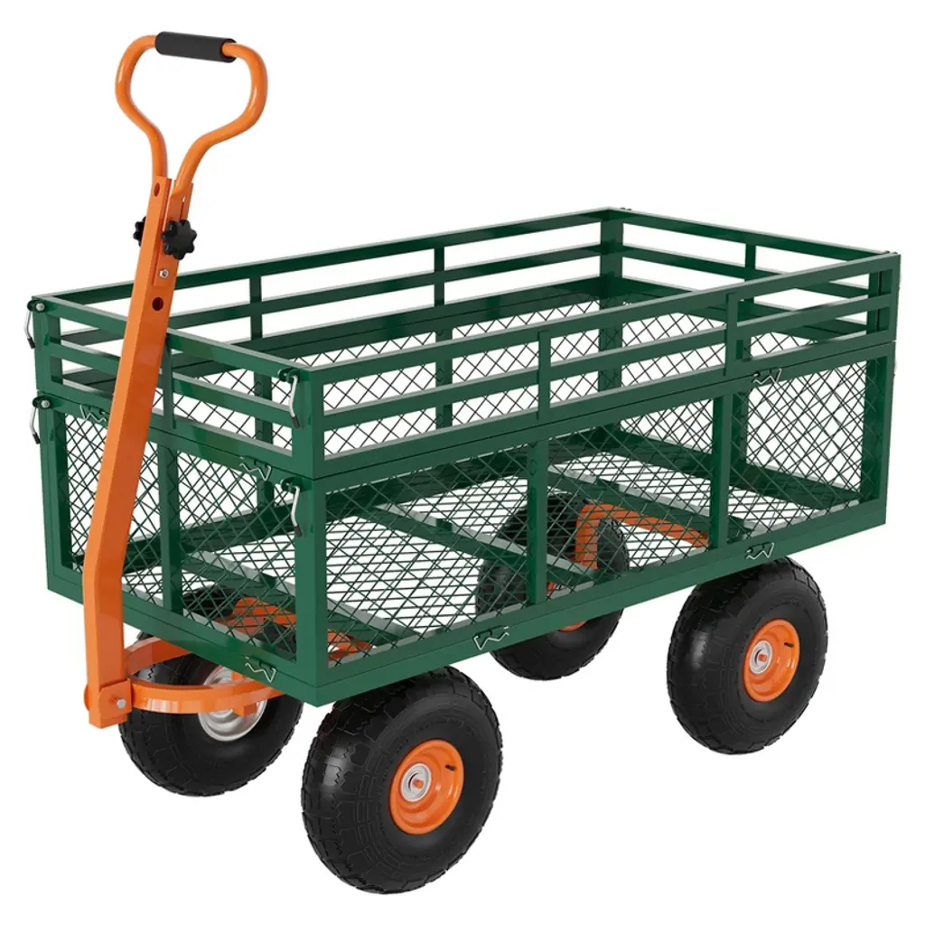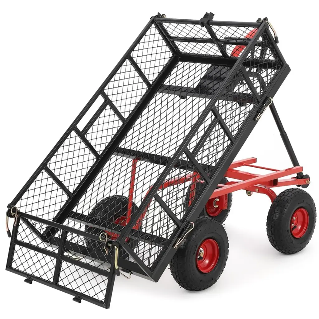 Feature: Heavy-Duty Loading: Our dump cart can bear up to 400 lbs, effortlessly handling heavy loads. With a capacity of 2.1 cu.ft, it boosts your productivity. Its sturdy metal frame and surface coating ensure long-term durability. Easy Dumping: Equipped with a front-handle dumping frame, users can quickly unload items. Simply disassemble the bottom of the frame to the garden dump cart. The 180° adjustable handle facilitates effortless maneuvering, doubling your efficiency. Versatile Transformation: Our dump wagon features removable all 4 side panels, allowing it to convert into a flatbed for transporting large items. When the panels are reattached, it can carry smaller items like wood or soil, meeting your needs for a multifunctional hauling tool. Large Tire Size: With ø255mm/10" rubber tires, the yard cart provides excellent shock absorption, navigating uneven garden terrain or grassy slopes, ensuring smooth transport. Safe Transport: Included mesh cover and cushion ensure item safety, our yard dump cart is suitable for various settings from gardens, orchards, and farms to warehouses, efficiently completing transport tasks. Package Content 1 x Dump Cart 1 x Mesh Cover 1 x Mat 1 x Installation Wrench
