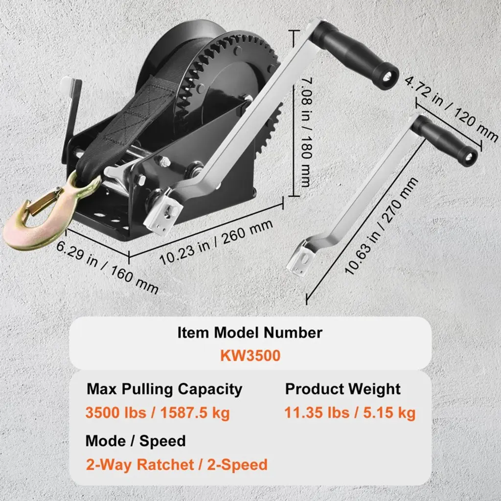 Feature: Tough Strap, Tougher Performance: Our hand winch features a 33 ft high-strength polyester strap with a pulling force of up to 3500 lbs. Forget about those fragile, break-prone ropes. This one's in it for the long haul, ready to tackle even the heftiest vehicles and boats. Two-Way Ratchet: This boat rope crank is equipped with a top-notch carbon steel two-way ratchet. With the 4:1/8:1 dual speed to adjust handle position, it's all about control – reel in, reel out, your choice. Thanks to the high-temp hardening process, these gears are tough cookies, ready to withstand the rigors of outdoor life. Forged Hook: It's not just about the boat winch strap. The hook matters, too. We're talking a 26 mm wide opening forged for strength and ready to take on heavy loads without a sweat. Its anti-corrosion and crack-resistant build means it keeps its shape, use after use. Plus, the security latch is your peace of mind right there. Handle with Ease: Our hand crank winch boasts an ergonomic handle, perfectly sized at 10 inches. It's all about grip and comfort here, paired with a robust galvanized frame. Quick to install and even quicker to use – this little powerhouse makes light work of pulling heavy vehicles and boats. Ready for Anything, Anywhere: Simple to set up, a breeze to use – our heavy duty hand winch is your go-to for horizontal pulling wherever you are. Indoors, outdoors, on the water or land – bring it to motorboats, trailers, or all-terrain vehicles, and watch it work its magic. Package Content 1 x Hand Winch 1 x User Manual