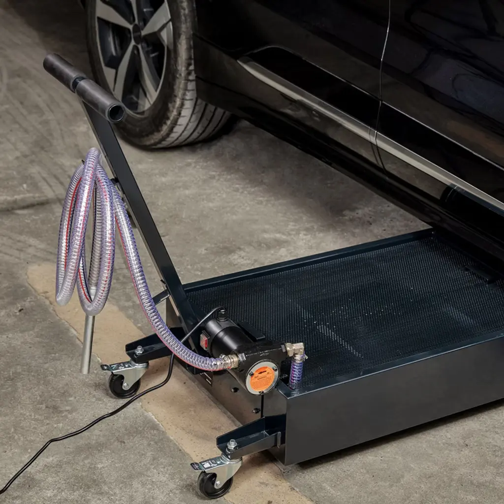 Feature: 15 Gal Large Capacity: Need to collect and dispose of used fluids like oil, coolant, and transmission fluid? Our low-profile oil drain pan holds 15 gallons and is a convenient solution for your shop! Transport fluids for proper disposal and enjoy a clean workspace! Oil Drain with Electric Pump: Our 12V pump draws power directly from your vehicle and boasts an impressive 180W power. It can achieve a max flow rate of 23 L/min and a maximum head of 5 m. Get the job done quickly and efficiently With this pump! Well-Designed Details: Our 15-gallon drain pan makes fluid management a breeze with its smooth operation and easy movement thanks to the swivel casters. The two lockable front wheels ensure stable parking. The filter mesh is included to reduce oil splash and prevent debris and other parts from falling into the fluid. It is also detachable and easy to clean. Fold into Position: The long handle of this tool is great for keeping a low profile while positioning the drain hose underneath your vehicle. It also makes it convenient to store, transport, and pull. Robust Carbon Steel: This rolling oil drain cart is made of tough carbon steel, ensuring excellent durability. It works well with heavy-duty trucks, buses, RVs, and other low-profile vehicles. Package Content: 1 x Oil Drain Pan 1 x Drain Hose 1 x Set of Installation Accessories
