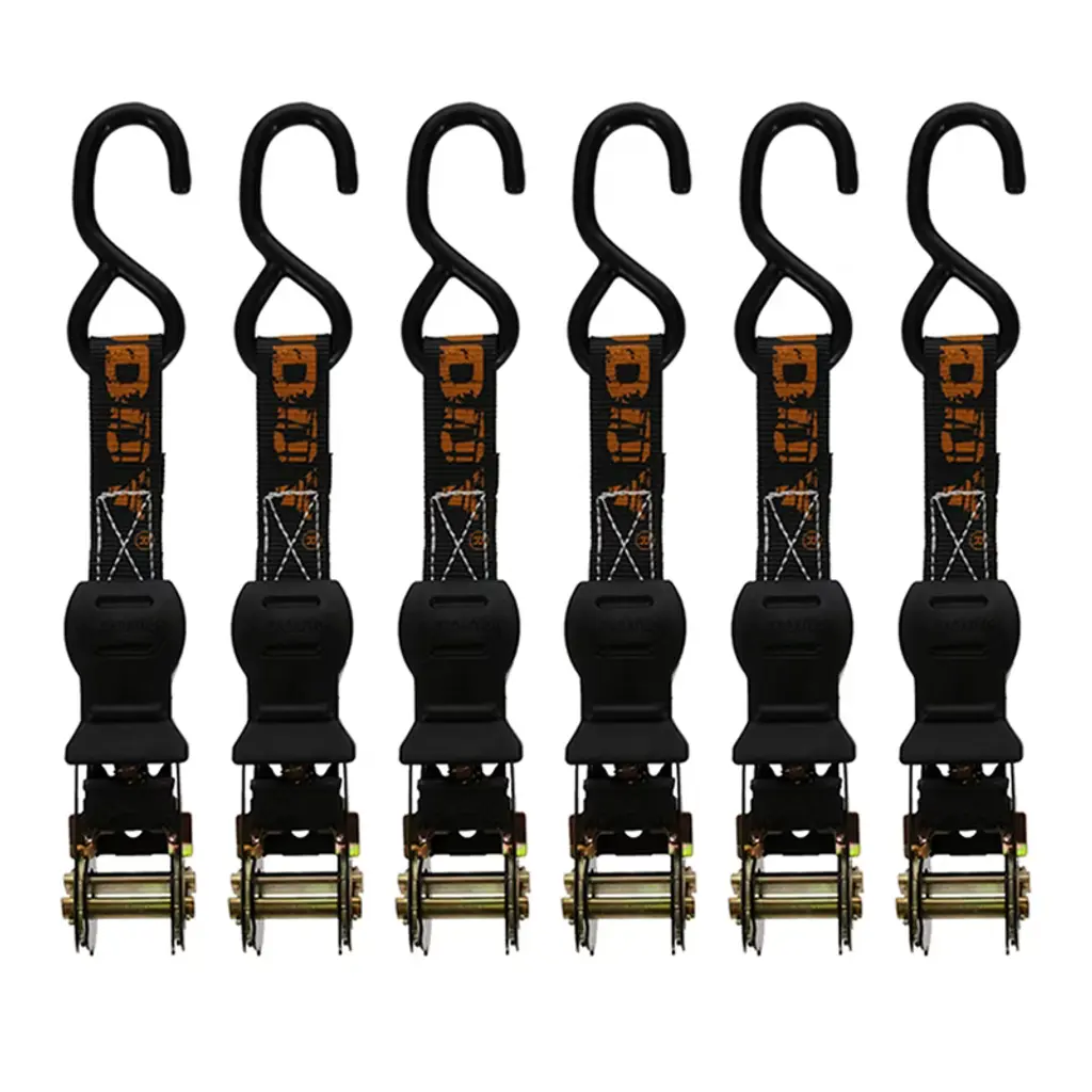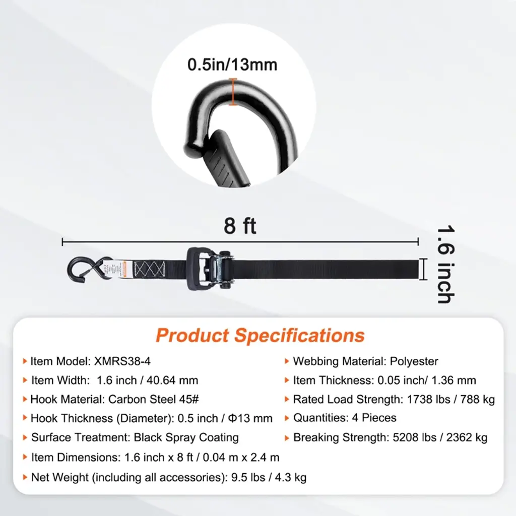 Feature: Powerful 5208 lbs Breaking Strength: The webbing is made of high-quality material with additional stitching, providing unbeatable performance even when handling heavy loads in strong winds. Each ratchet has an official load capacity of 1738 lbs and a breaking strength of up to 5208 lbs Secure S Hooks with Safety Locks: Protect your items without worrying about damaging tools or vehicle surfaces. The black powder-coated surface of the S hooks prevents paint chipping, marks, and dents, equipped with sturdy safety locks for added security. Quick Fastening: The ratchet mechanism offers excellent control, comfort, and strong grip strength. The ergonomic spring-loaded handle allows for smooth and rapid release. What You Will Get: The ratchet strap set includes, soft loops, and velcro tapes, all stored in a durable storage bag that is itself sturdy and long-lasting. Versatile Application: VEVOR ratchet straps provide durable and reliable security for transporting various small and large objects, including motorcycles, canoes, kayaks, ATVs, boxes, boats, furniture, lawn equipment, heavy machinery, and other cargo via truck beds, trailers, or roof racks. Package Content 4 x Ratchet Straps 4 x Soft Loops 4 x Velcro Tapes 1 x Storage Bag (335 x 480 mm)