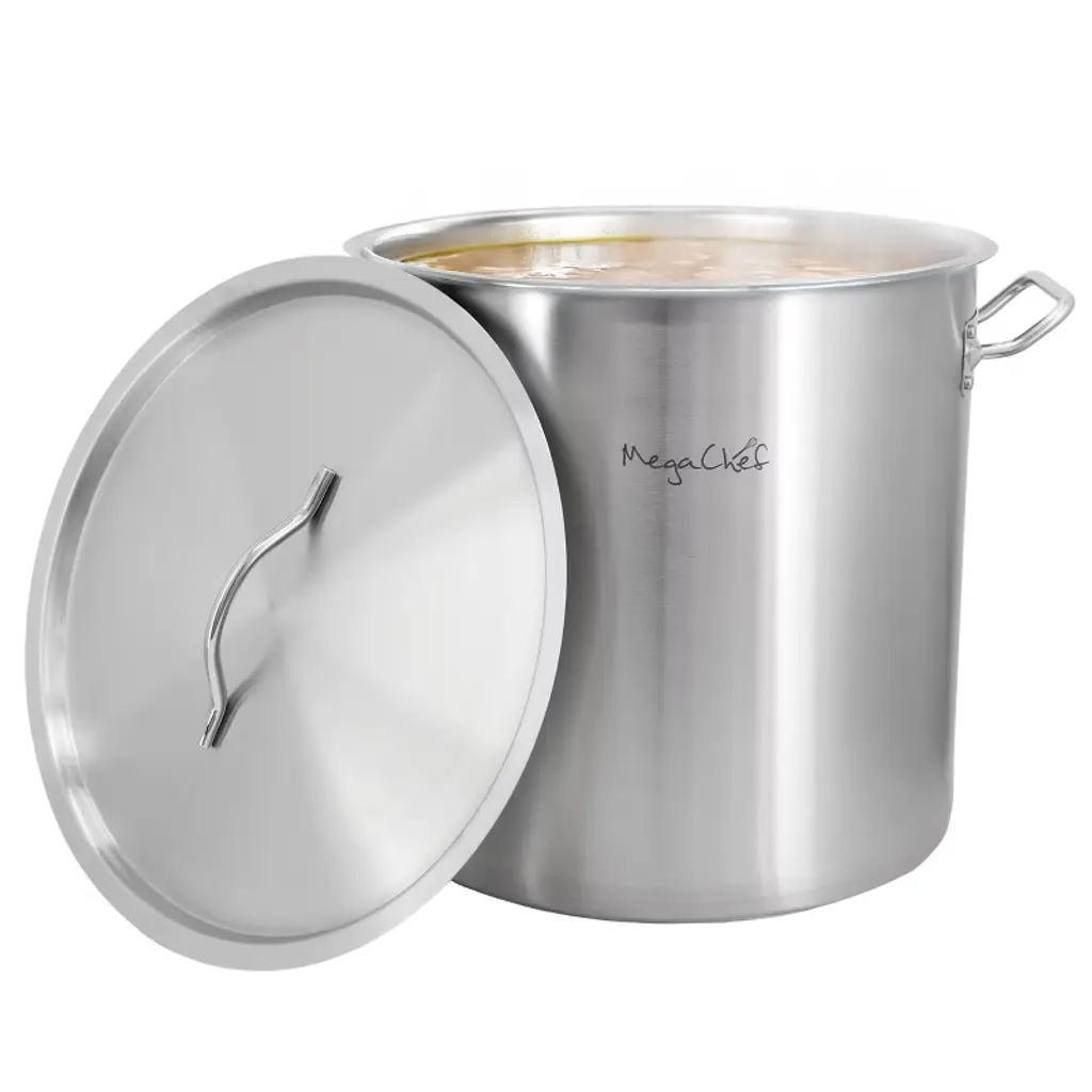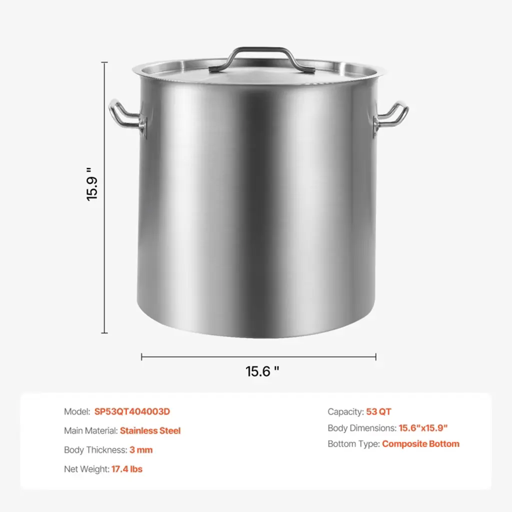 Feature: 53 QT / 50.1 L Large Capacity: The internal dimensions of the pot are 15.6" x 15.9" / 395 x 405 mm. It can be used for steaming large lobsters, frying turkeys, boiling soups, stewing dishes, and more, making it suitable for restaurant kitchens and families that frequently host gatherings. Thickened Stainless Steel: This cookware sauce pot is rust-resistant, corrosion-resistant, heat-resistant, and durable. Even when exposed to high temperatures for long periods or when cooking acidic foods, it won't release harmful substances like other inferior materials. Uniform Heat Distribution Composite Bottom: The heavy duty stock pot's bottom thickness is 3 mm and can be used on open flames, induction cookers, and gas stoves. It maintains even heating and long-lasting boiling to ensure food is thoroughly cooked. Thoughtful Details: The polished commercial grade sauce pot body is aesthetically pleasing, easy to clean, and resistant to scratches. The handles are securely riveted with 201 screws, making them durable and able to bear more weight. The pot comes with 1A grade protective packaging, meeting the highest standards to ensure product integrity. More Sizes: The full range of stainless steel stockpot cookwares includes 7 sizes for you to choose from (24 QT / 22.7 L, 36 QT / 34 L, 42 QT / 39.7 L, 53 QT / 50.1 L, 64 QT / 60.5 L, 84 QT / 79.5 L, 100 QT / 94.6 L). You can select your preferred size based on the number of family members or your cooking needs. Package Content: 1 x Stock Pot 1 x Lid with Handle 1 x Manua