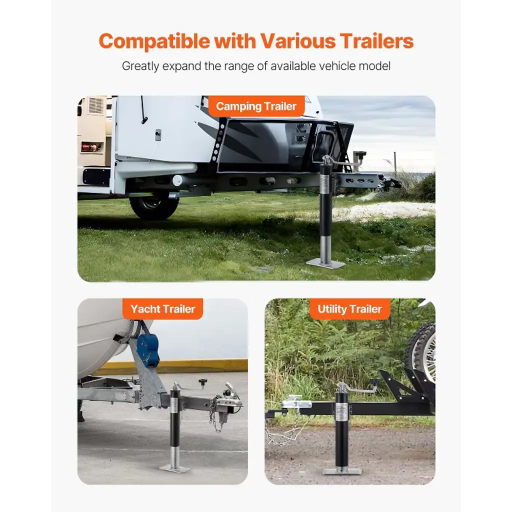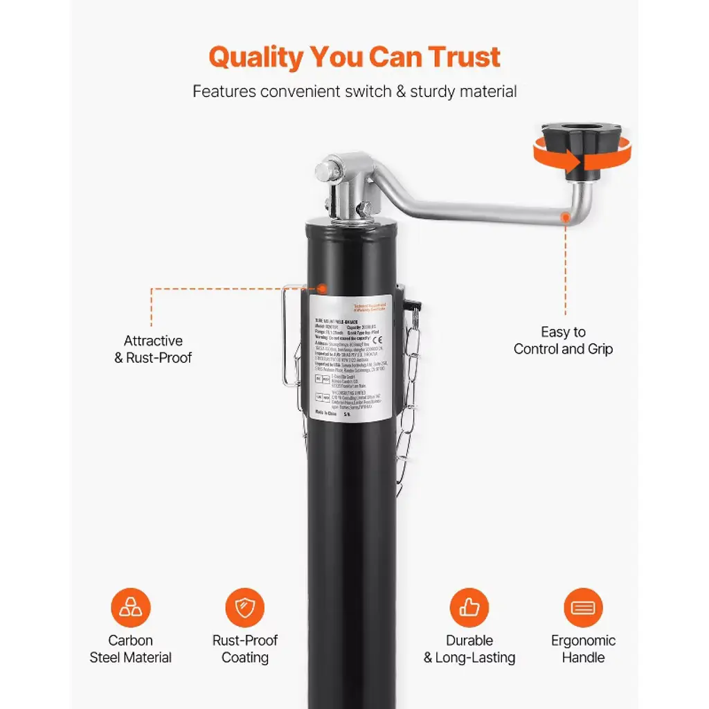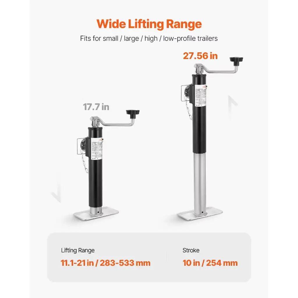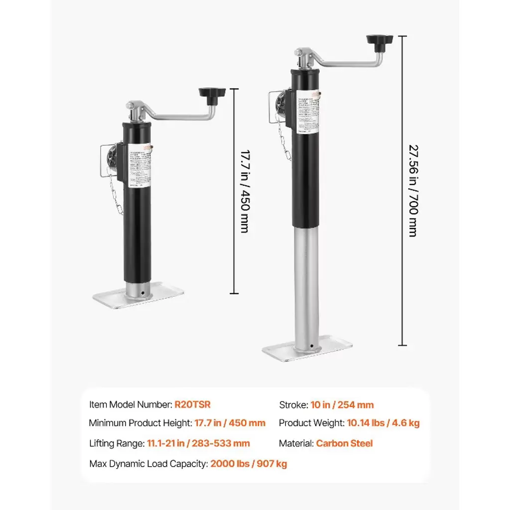 Feature: Heavy-Duty Load Capacity: The trailer jack boasts an impressive lifting capacity of 2000 lbs, making it a powerful tool for lifting tasks. With a lifting range of 11.1 to 21 inches, it fits both high-profile and low-profile trailers. Easy Installation: Our trailer jack stand comes with all the necessary parts and detailed assembly instructions. It can be welded to the trailer tongue. Have your trailers up and ready to use in no time—no extra hands needed. Reliable and Durable: This trailer tongue jack is made of tough carbon steel with a rust-resistant, galvanized finish. It's ready for anything, standing up to all kinds of environments without giving in to rust. Flexible Compatibility: Designed with a wide lifting range, our utility trailer jack works for all kinds of trailers, big or small, high or low. It's built for flexible, everyday use to make your life easier. Ready for Any Job: Whether you're lifting an RV trailer, horse trailer, or utility trailer, this bolt on trailer jack can handle it. No need for power—just crank it up, and you're ready to lift and lower with ease and confidence. Package Content 1 x Trailer Jack 1 x Short Pipe for Welding 1 x User Manual
