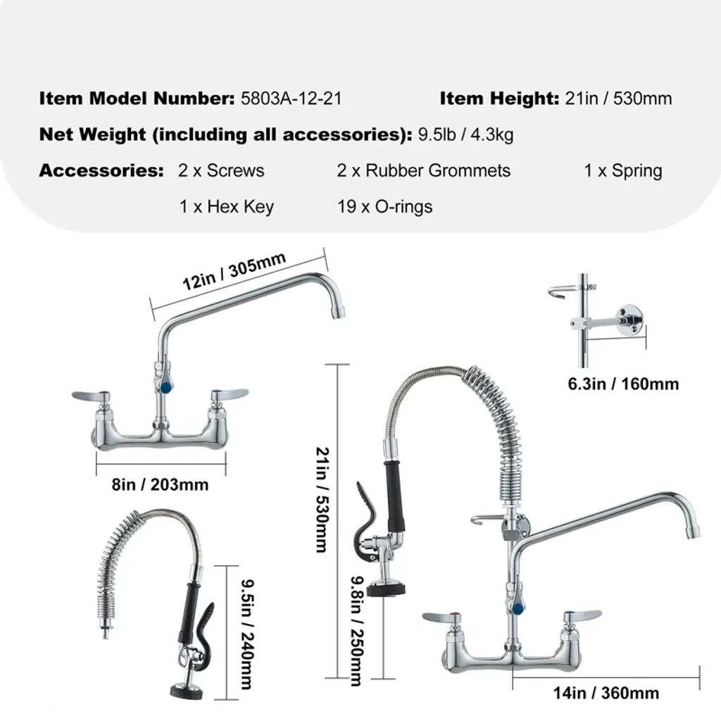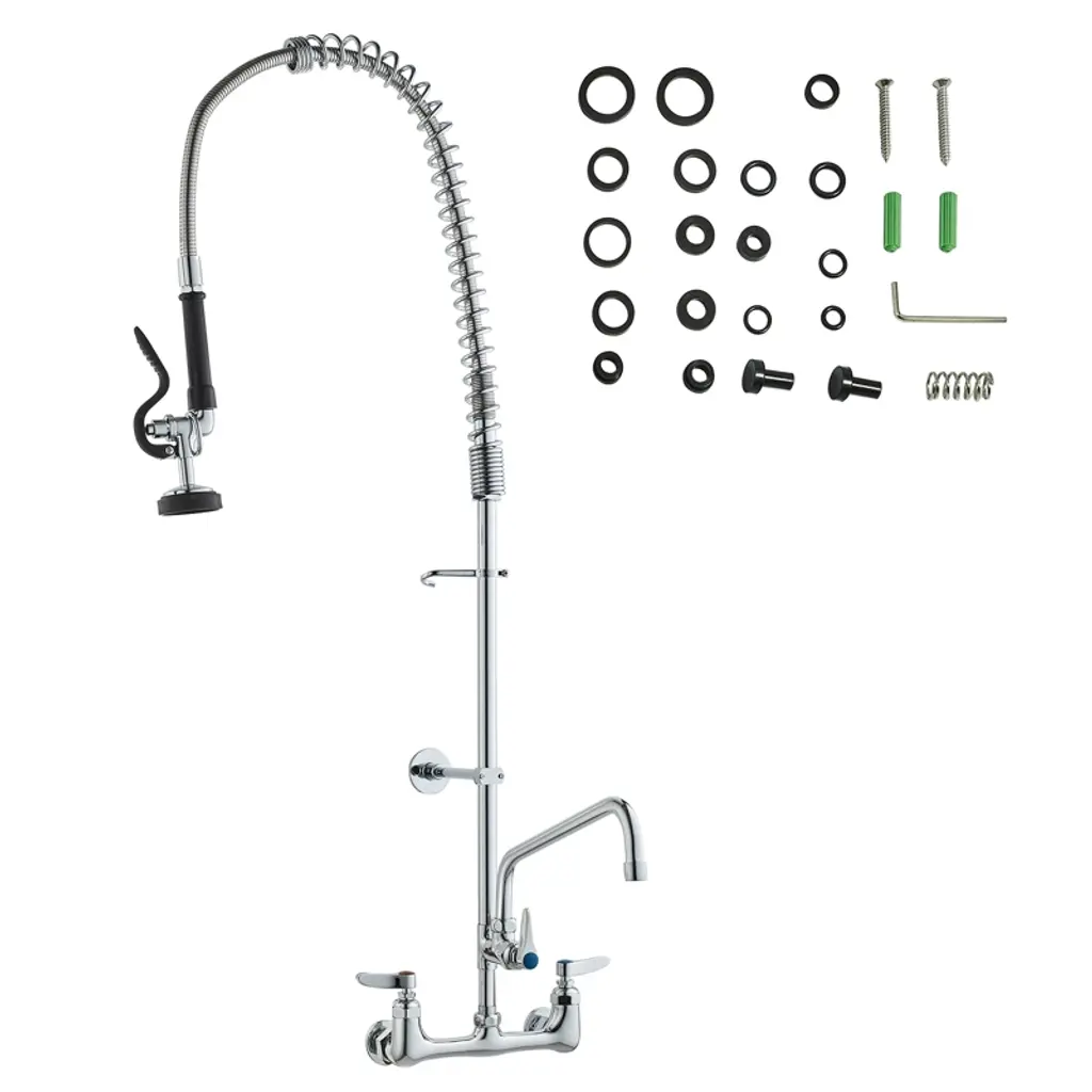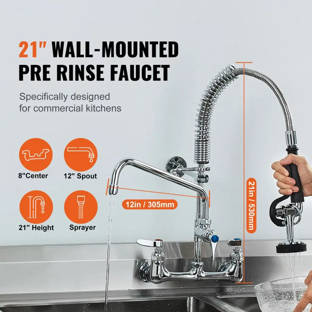 Feature: Wall-Mounted Commercial Faucet: This 21-inch tall pre-rinse faucet is designed for wall-mount installation in kitchen walls, featuring a spray head and a 12-inch swivel faucet, easily tackling complex and tough dirt challenges. It is suitable for use with 3-compartment professional-grade commercial kitchen sinks. Leak-Proof Tightness: The commercial faucet with sprayer uses a high-quality pure copper valve core that is sturdy, durable, and not prone to cracking. Paired with sealing rings and a 2mm thickened nut, it ensures a strong seal to prevent leaks, saving water while significantly extending its lifespan. High-Pressure Sprayer: To deal with stubborn stains, the commercial kitchen faucet is equipped with a 1.42GPM high-pressure sprayer, offering strong impact, high-efficiency in removing stains, and ensuring cleanliness with less water use. Hot and Cold Dual Control: The brass constructed pre-rinse device includes a rotating auxiliary faucet, which can swivel to reach different sinks. The dual-rod handle allows easy adjustment of water temperature and flow for both the auxiliary faucet and sprayer. Adjustable Center: Featuring a 7.75"-8.25" center eccentric flange design, the adjustable center circle can fit most mainstream sinks, making installation easy. Package Content 1 x Commercial Kitchen Faucet 1 x Set of Accessories