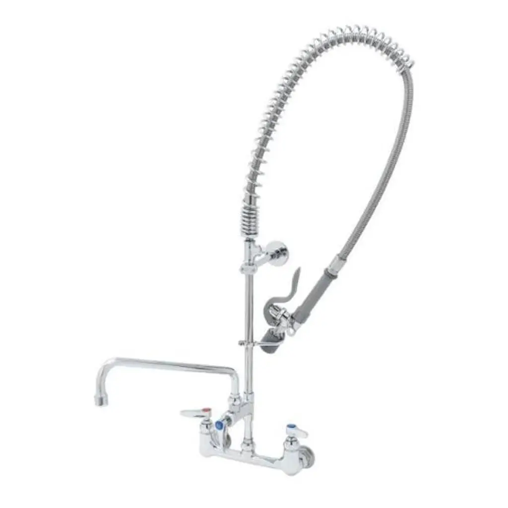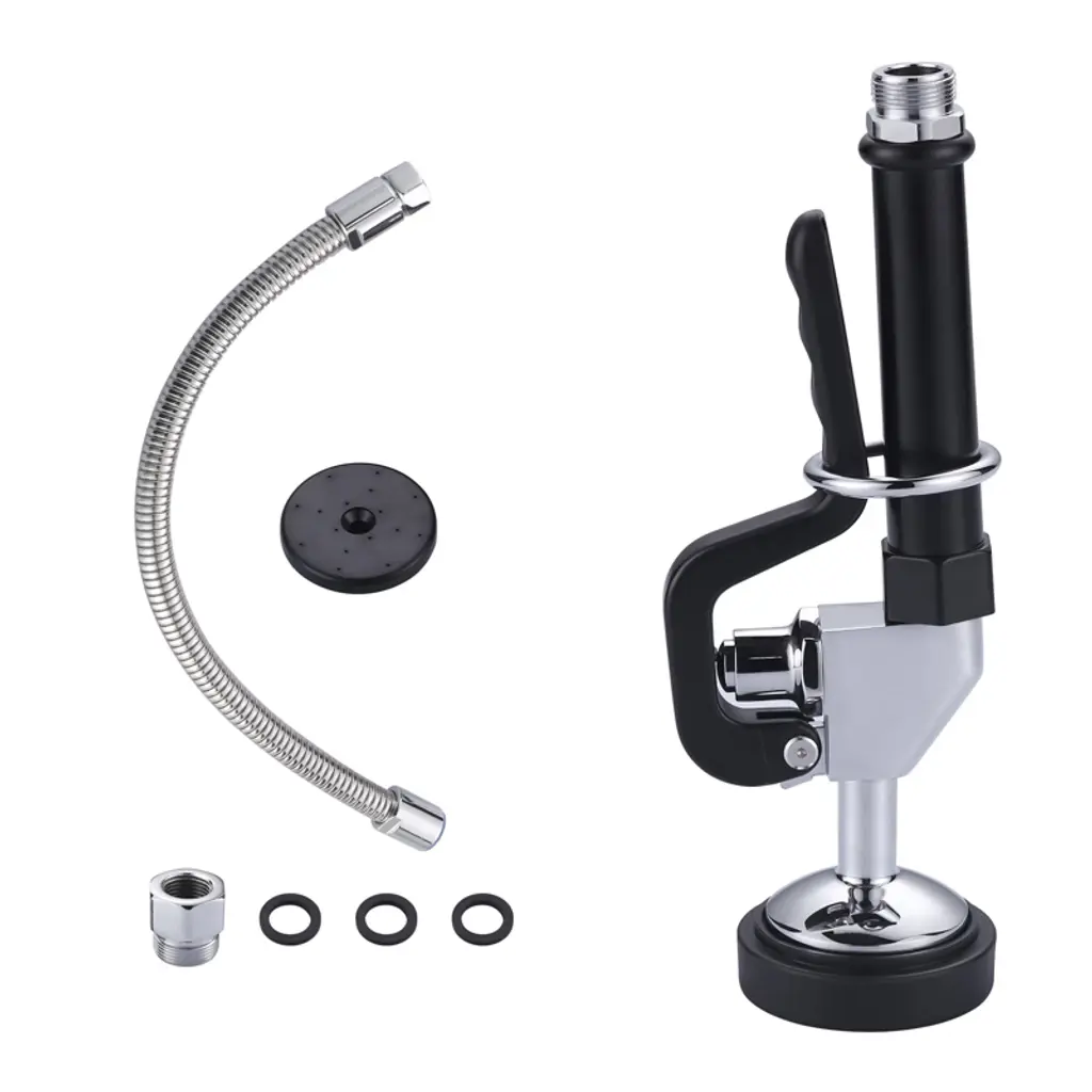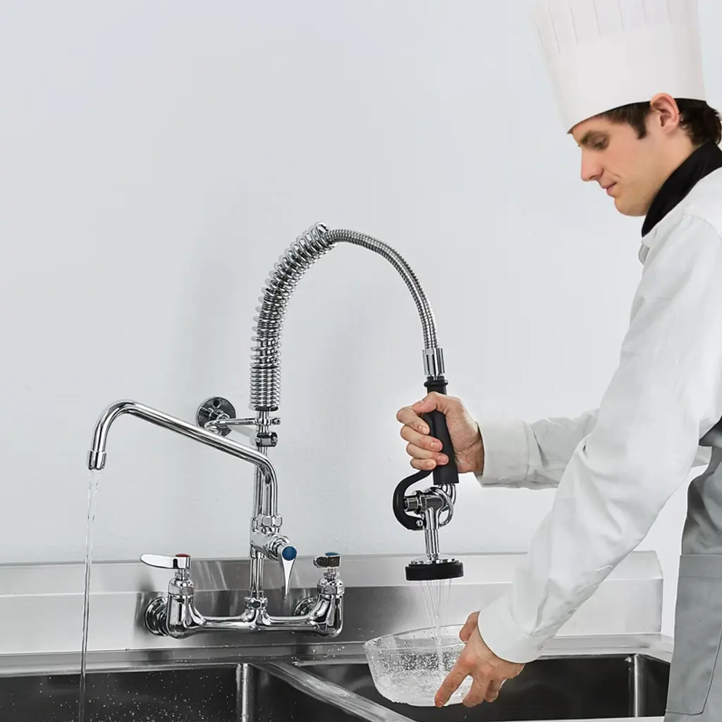 Feature: Wall-Mounted Commercial Faucet: This 21-inch tall pre-rinse faucet is designed for wall-mount installation in kitchen walls, featuring a spray head and a 12-inch swivel faucet, easily tackling complex and tough dirt challenges. It is suitable for use with 3-compartment professional-grade commercial kitchen sinks. Leak-Proof Tightness: The commercial faucet with sprayer uses a high-quality pure copper valve core that is sturdy, durable, and not prone to cracking. Paired with sealing rings and a 2mm thickened nut, it ensures a strong seal to prevent leaks, saving water while significantly extending its lifespan. High-Pressure Sprayer: To deal with stubborn stains, the commercial kitchen faucet is equipped with a 1.42GPM high-pressure sprayer, offering strong impact, high-efficiency in removing stains, and ensuring cleanliness with less water use. Hot and Cold Dual Control: The brass constructed pre-rinse device includes a rotating auxiliary faucet, which can swivel to reach different sinks. The dual-rod handle allows easy adjustment of water temperature and flow for both the auxiliary faucet and sprayer. Adjustable Center: Featuring a 7.75"-8.25" center eccentric flange design, the adjustable center circle can fit most mainstream sinks, making installation easy. Package Content 1 x Commercial Kitchen Faucet 1 x Set of Accessories