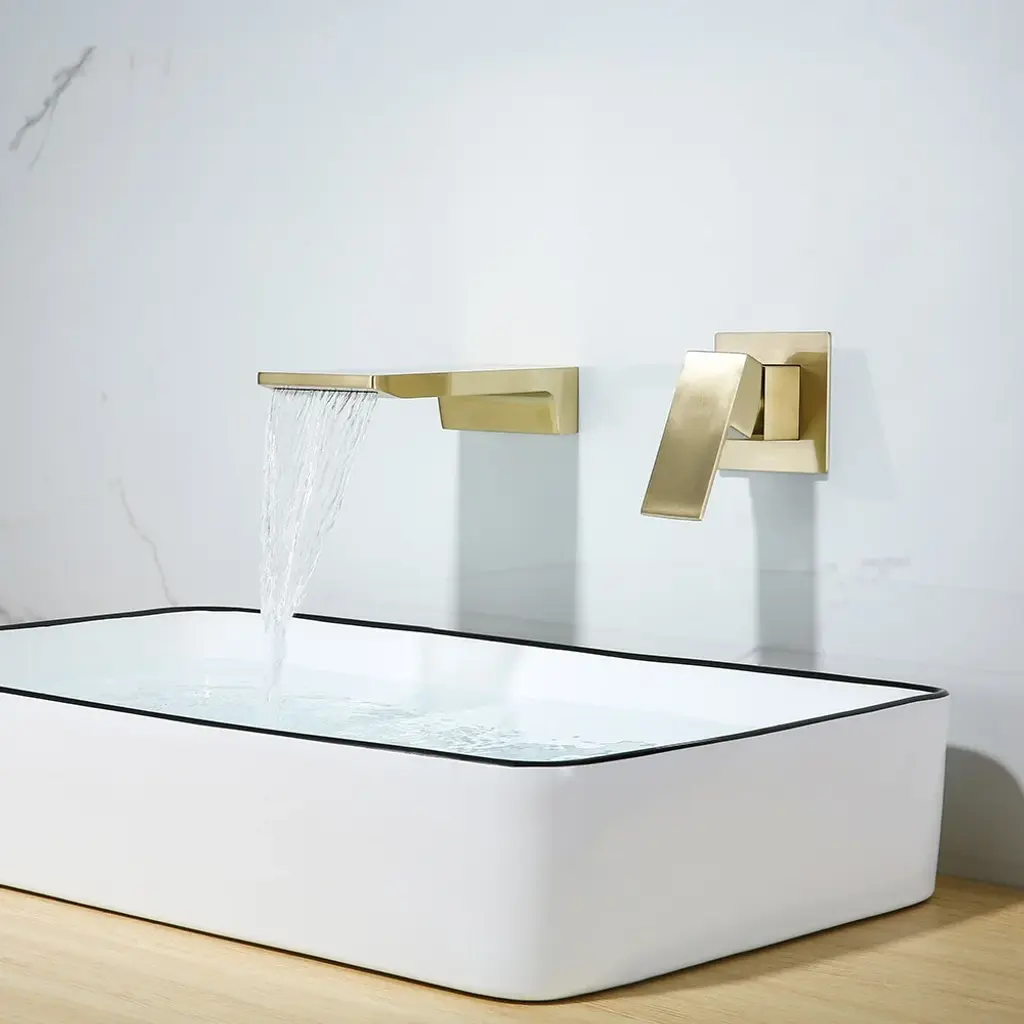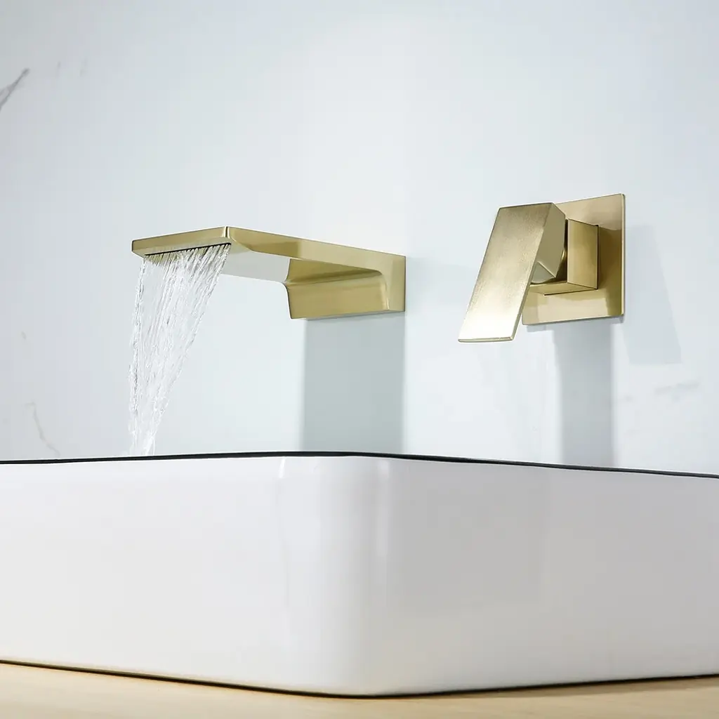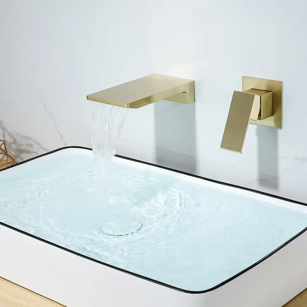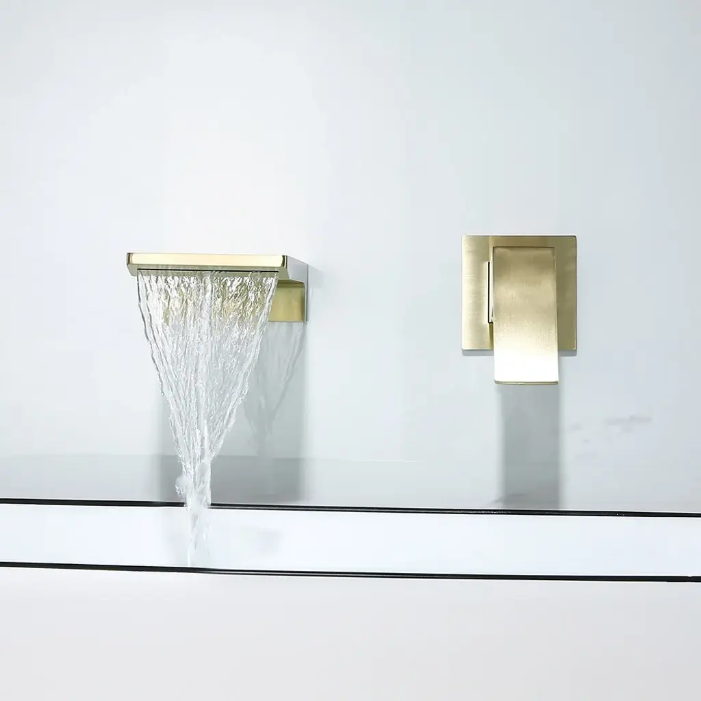 Waterfall Wall Mounted Brushed Gold Bathroom Sink Faucet Single Handle