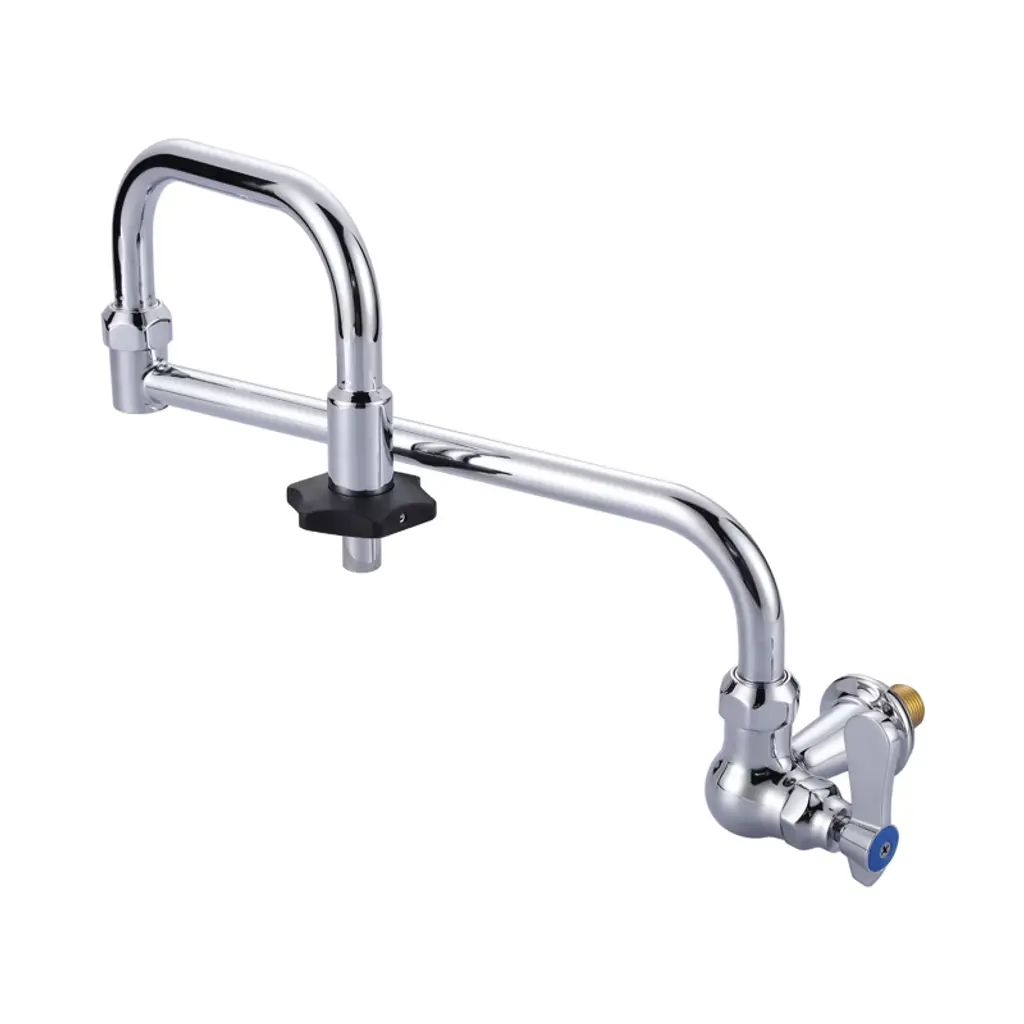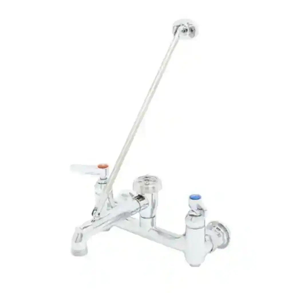 Wall mounted laundry faucet with double joints and lever handles, perfect for utility applications outside the kitchen. 8"widespread faucet centers connect to the wall with a classic bridge base.