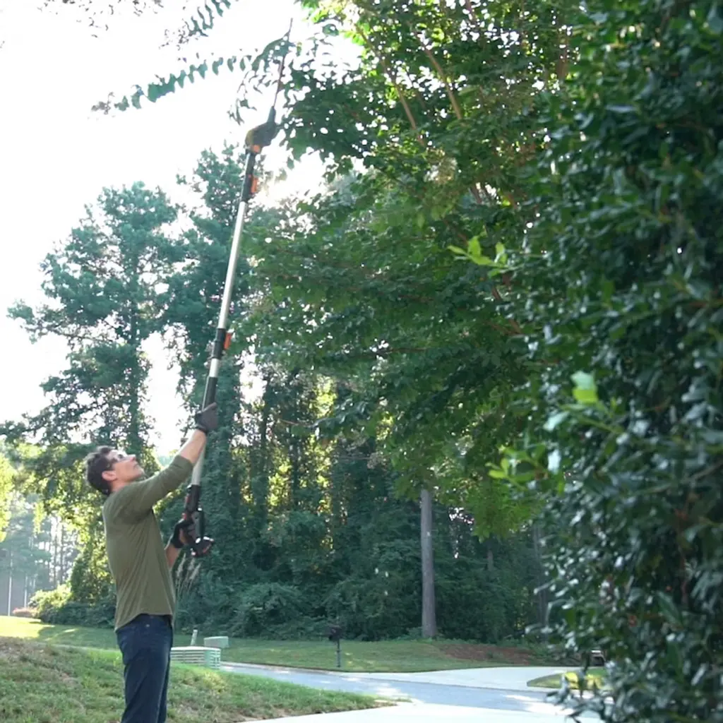 Sure, it’s easy to see when your hedges are getting a little shaggy, but how about your trees? The Worx 20V 2-in-1 Attachment-Capable Hedge Trimmer will clean up every bush, shrub, tree, and hedge on your property. Dual-action blades cut everything twice, once forward, and once back, working at 1340 revs/min. And all that action gives you neat, clean cuts. The extendable pole attachment is the greatest feature, though. You can leave the ladder in the garage and still add about 12 feet to your reach. It’s the much safer way to trim your trees. And once it’s up there, the pole handle has an on/off switch right on the grip, so you can turn it on and shut it off without having to bring it back down. This tool is cordless, so you don’t have to worry about getting snagged on every branch and obstacle in your yard. The included 2.0 Ah battery and charger will keep your trimmer powered up and ready to go. This model also comes with a blade sheath, which makes it safer to store and significantly extends the life of your tool. And if you decide later on that your trees need some branches to come down, too, you can always get the Worx Chainsaw Head Attachment that is designed for this pole.