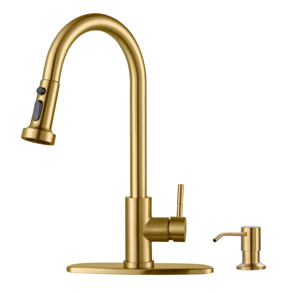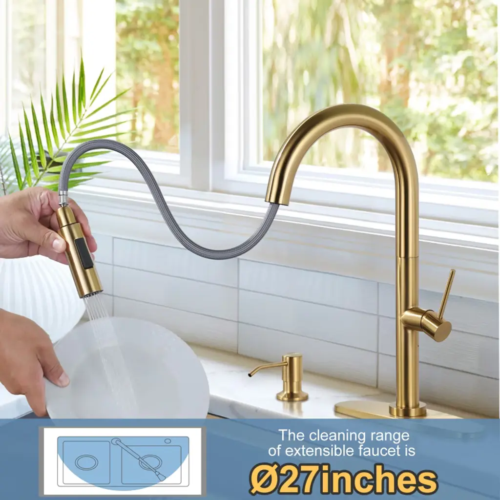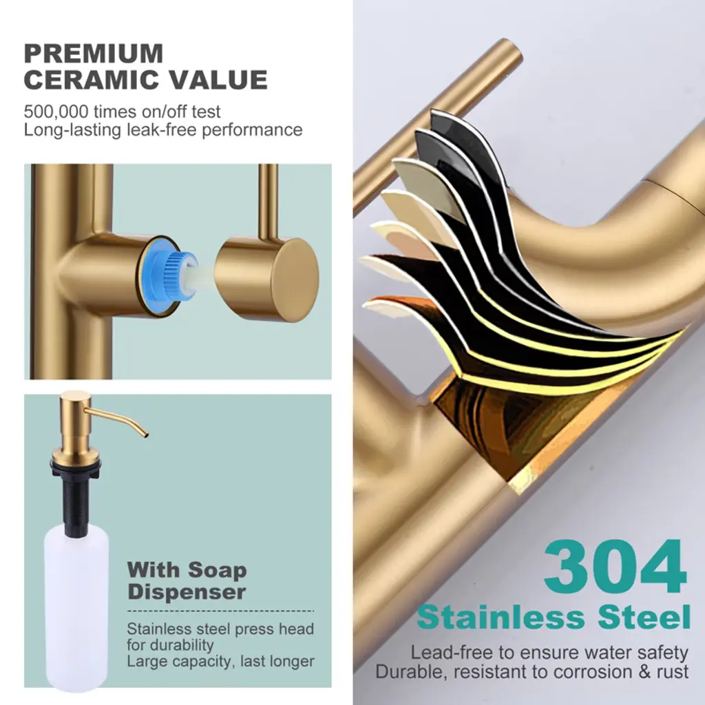 Wowow 15.3 In. Single Handle Pull Down Sprayer Kitchen Faucet With Soap Dispenser And 360° Spout Swivel In Gold