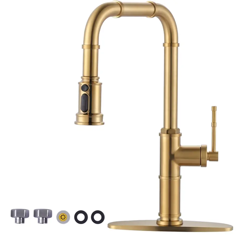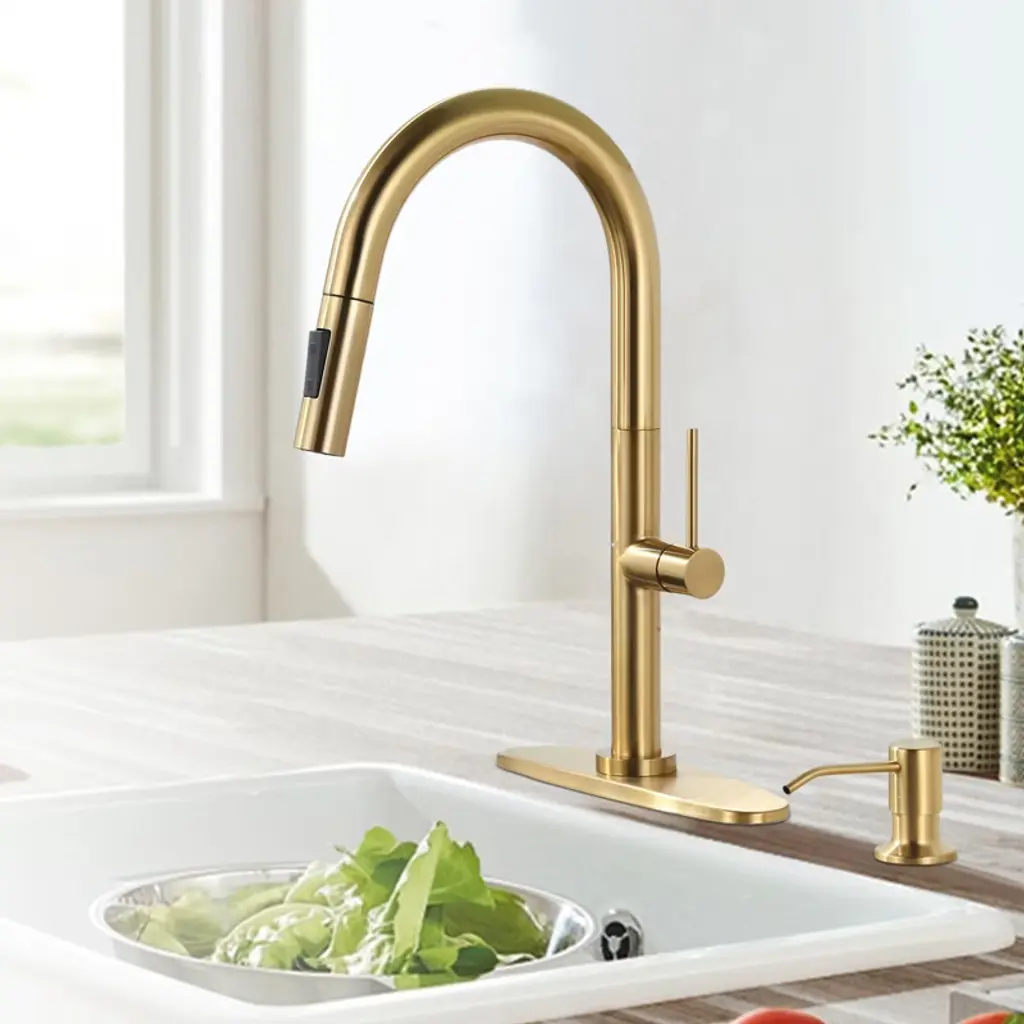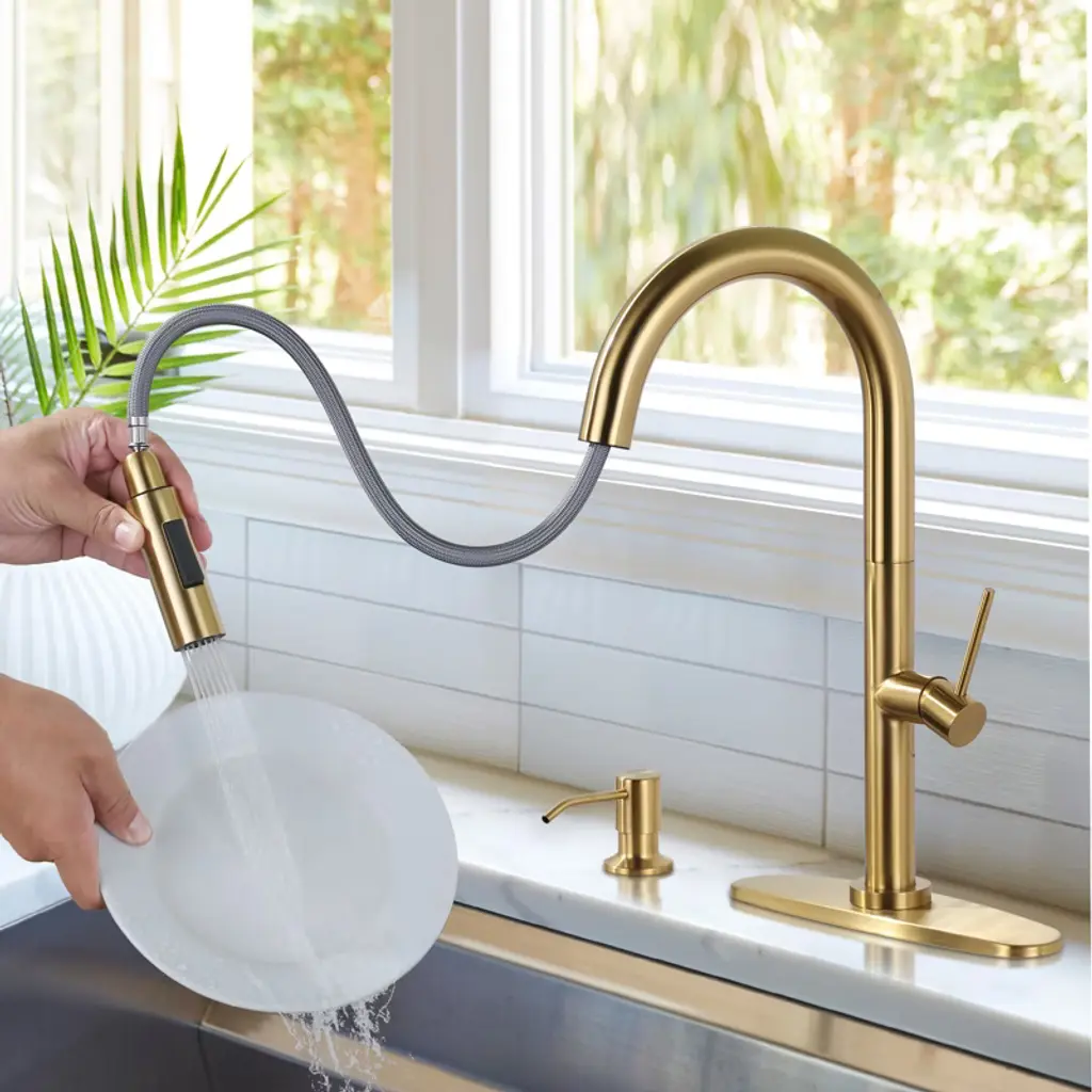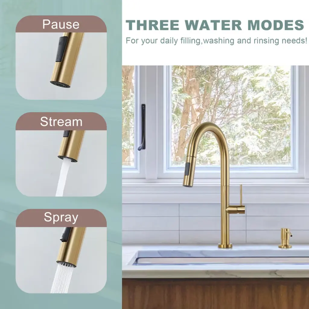 Wowow 15.3 In. Single Handle Pull Down Sprayer Kitchen Faucet With Soap Dispenser And 360° Spout Swivel In Gold