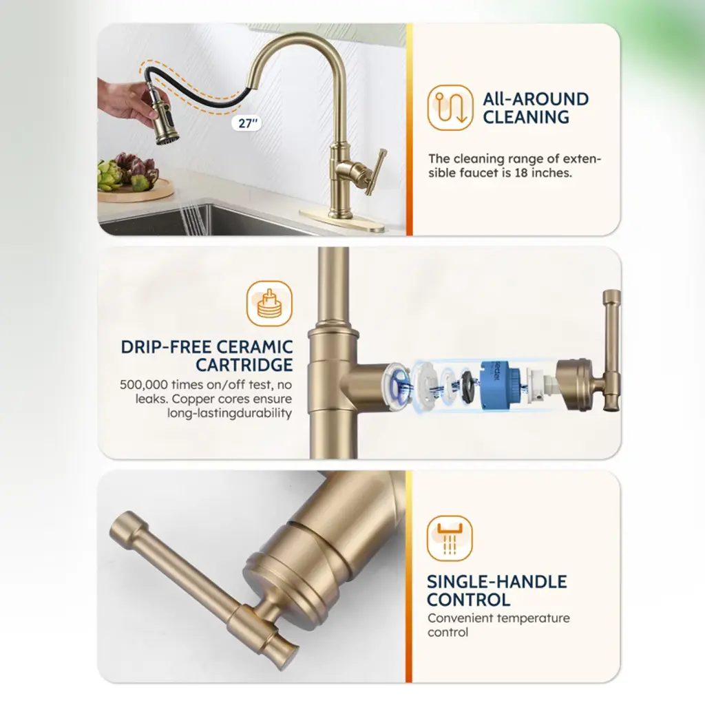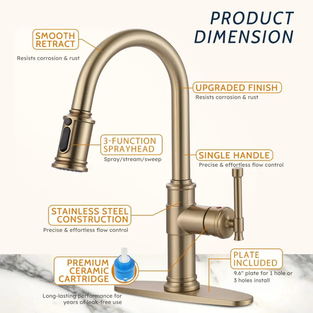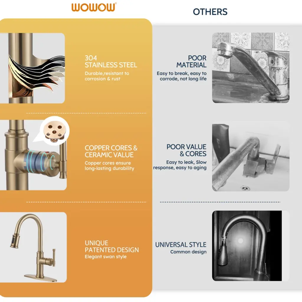 Wowow 16.2 In. Single Handle Pull Down Sprayer Kitchen Faucet With 360° Spout Swivel In Gold