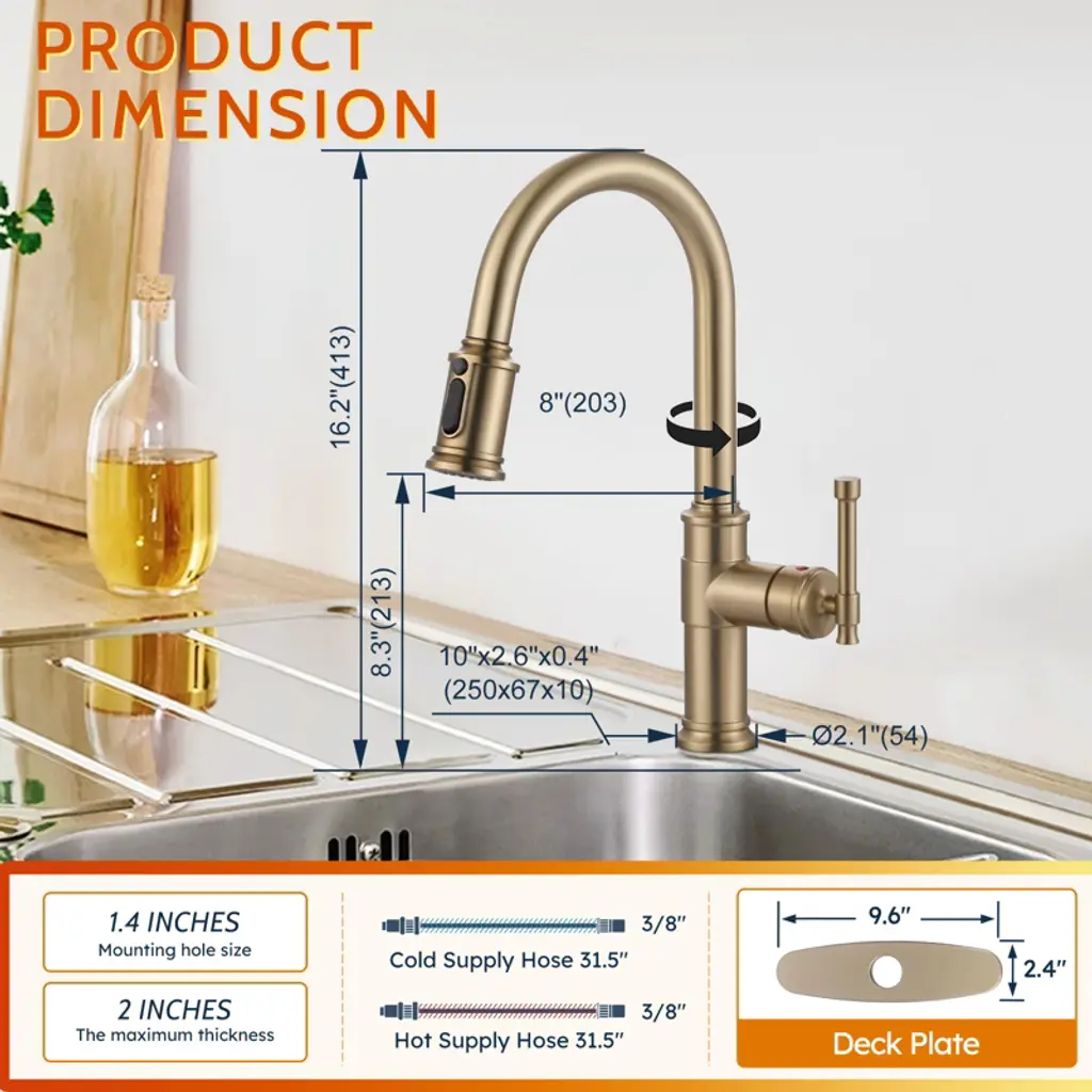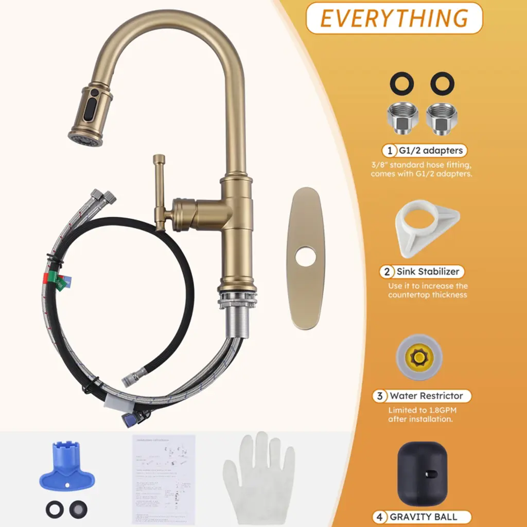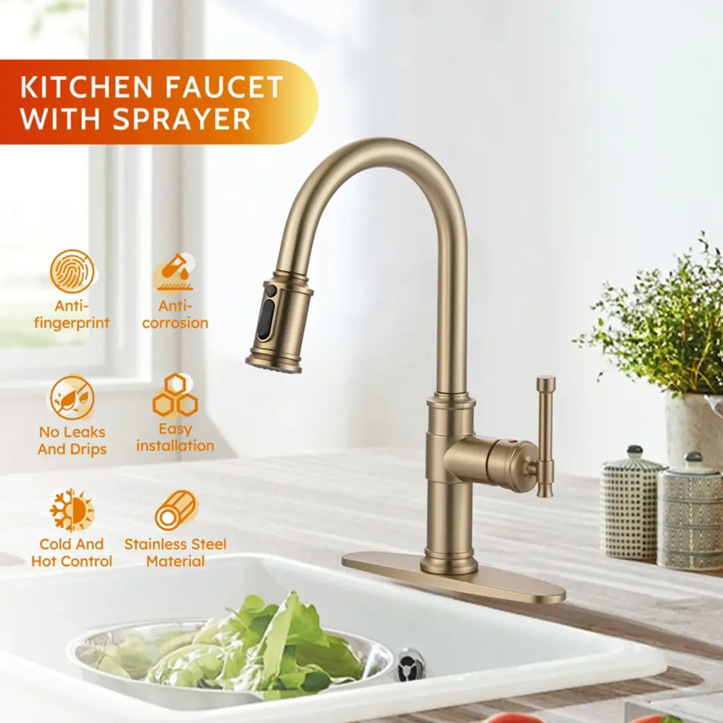 Wowow 16.2 In. Single Handle Pull Down Sprayer Kitchen Faucet With 360° Spout Swivel In Gold