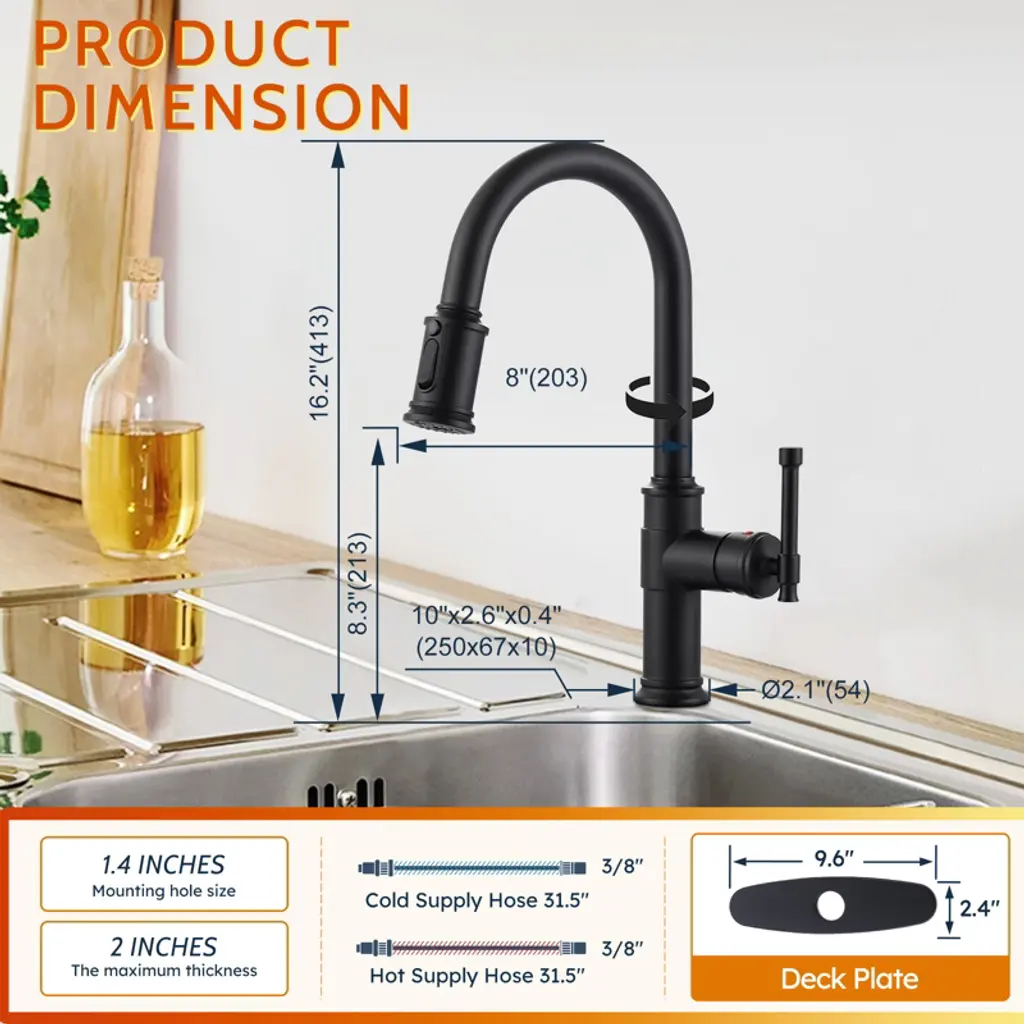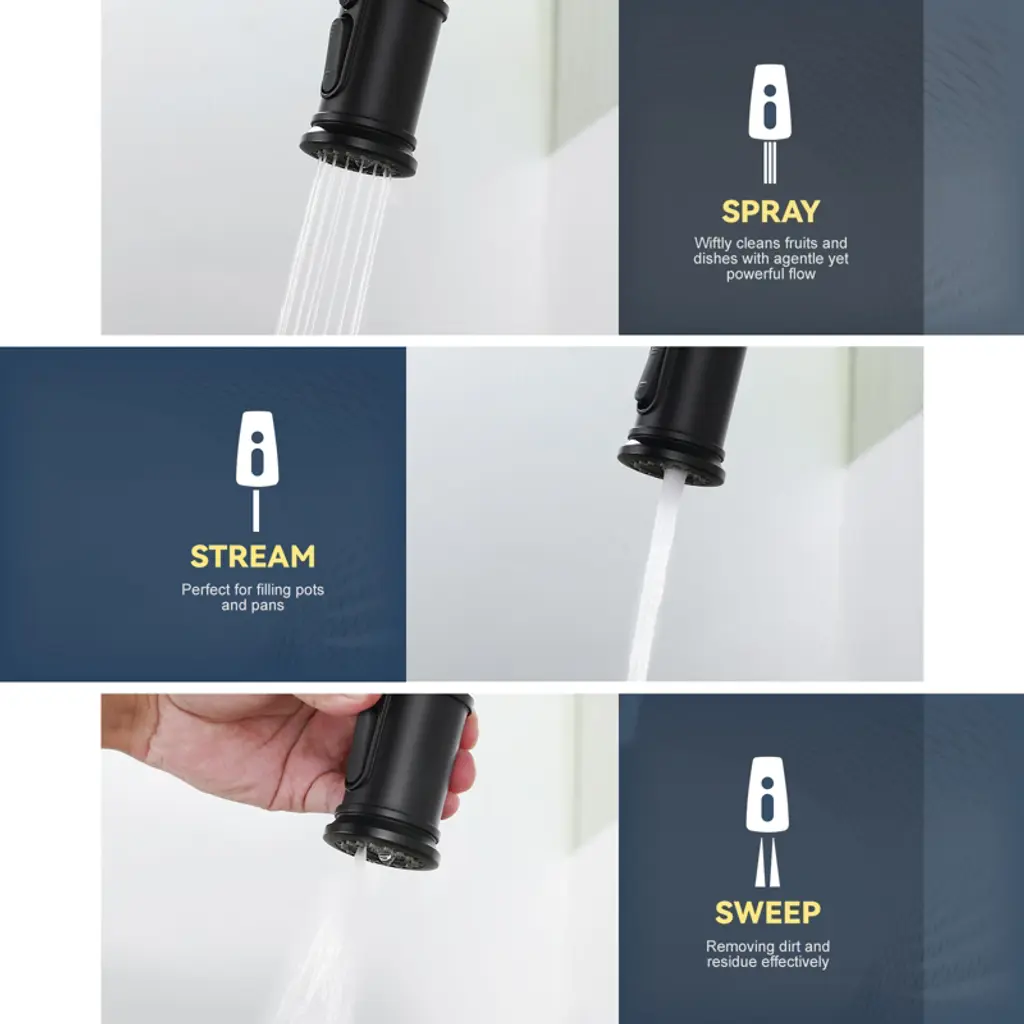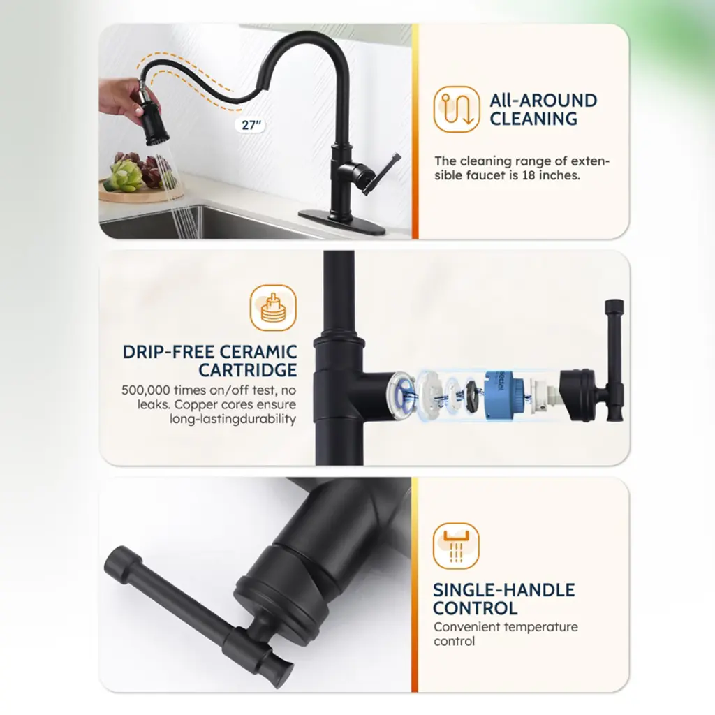 The flexible pull-down, water-saving and efficient, puts kitchen water at your fingertips. This faucet is uniquely designed with a pull-down that extends up to 18 in. for easy cleaning of all corners of the sink. Equipped with a 3-mode sprayer with an efficient flow rate of up to 1.8 GPM. Made of 304 stainless steel, it is abrasion and scratch-resistant, with a modern look to add color to your kitchen. Drip-free ceramic cartridges are rigorously tested with precise single-handle control. Hot and cold adjustable, easy to install, complete accessories. Enjoy high-quality after-sales service and fast problem solving.